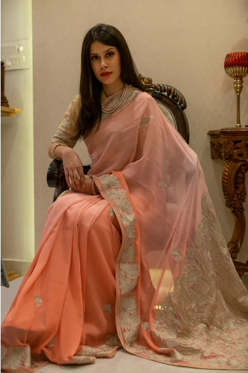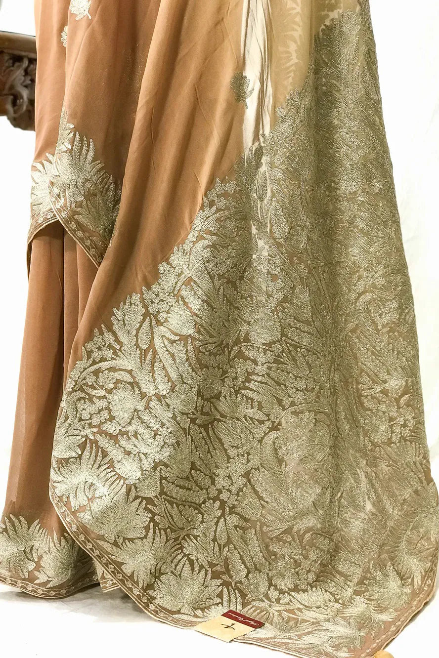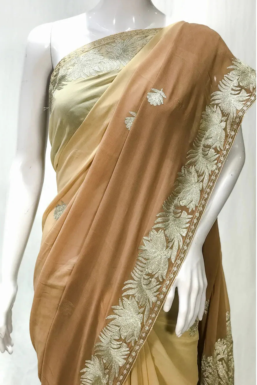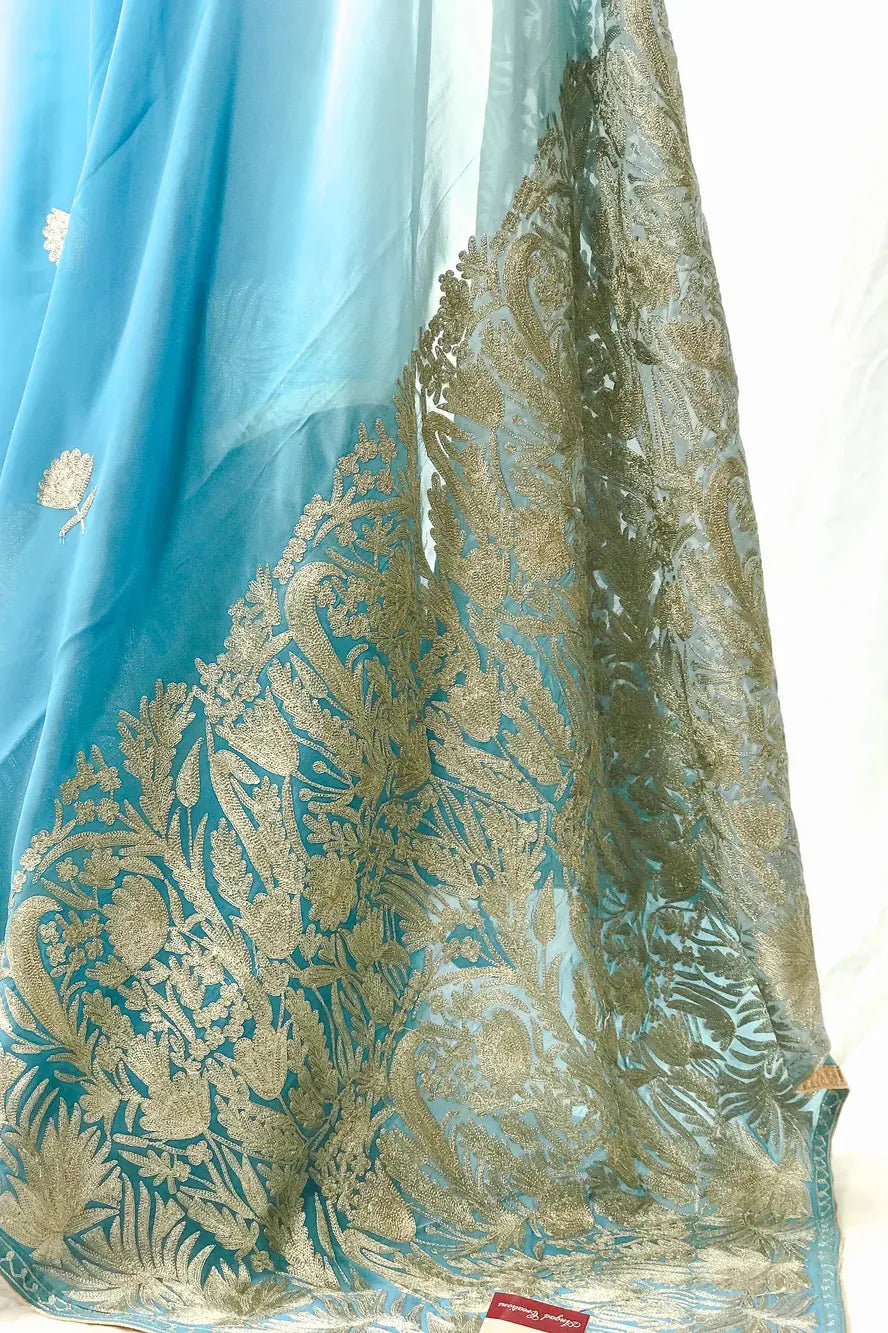 Draping Gulnaar-e-Shehzaadi feels like stepping into your own quiet moment of royalty—elegant, empowered, and deeply connected to the legacy of Kashmiri craftsmanship. The ombre Viscose Georgette glides effortlessly with every movement, while delicate dull-gold Zari embroidery adds a soft, luminous shimmer. Designed for comfort, loved for its timeless artistry, and cherished for its versatility, this saree seamlessly elevates everything from intimate gatherings to grand festivities. Essential features include dull-gold Kashmiri Zari embroidery, a fluid ombre peach/brown/magenta/green/sky-blue base, and a coordinating Indian Crepe blouse.