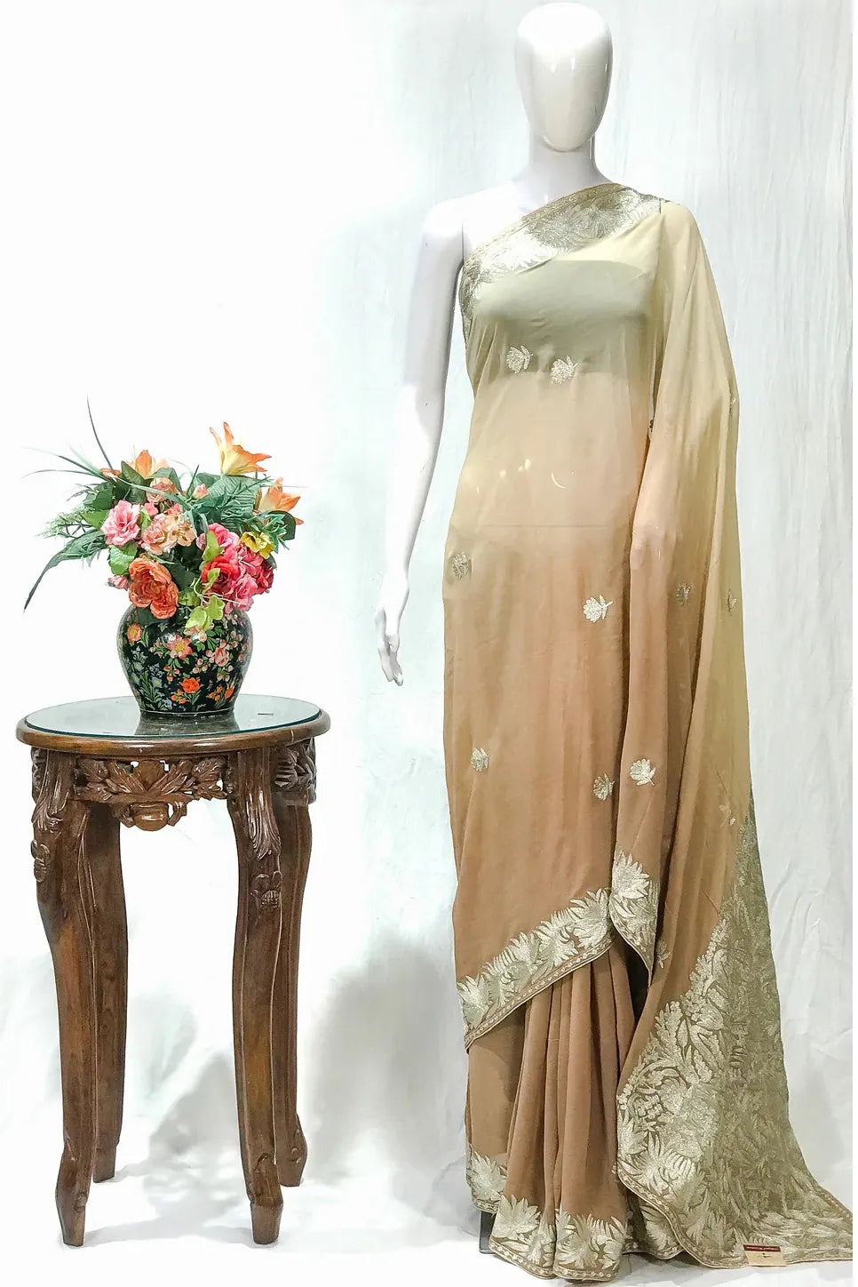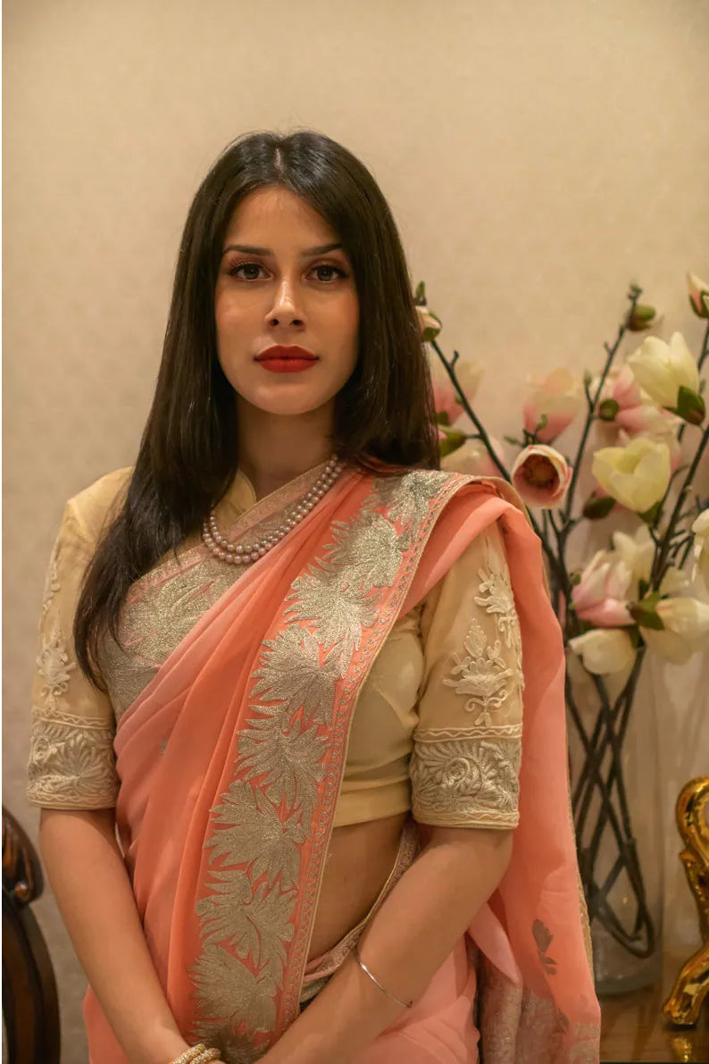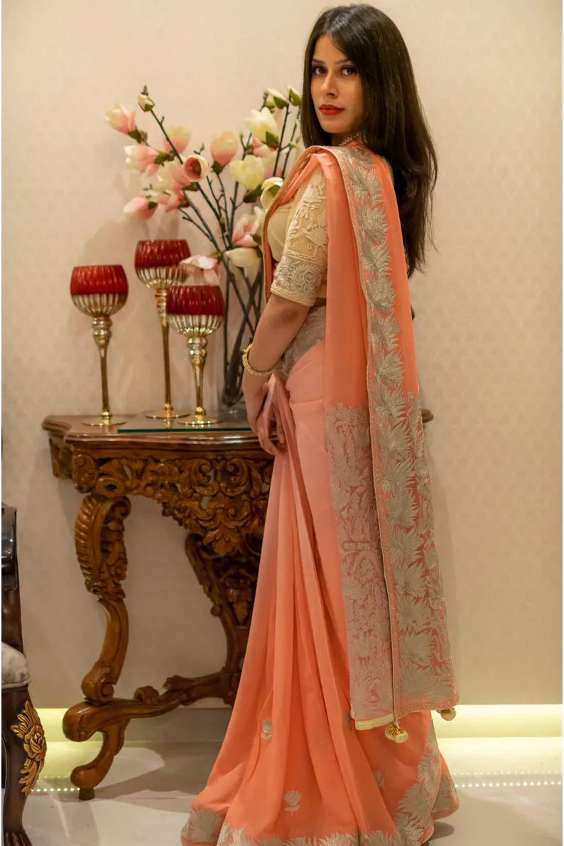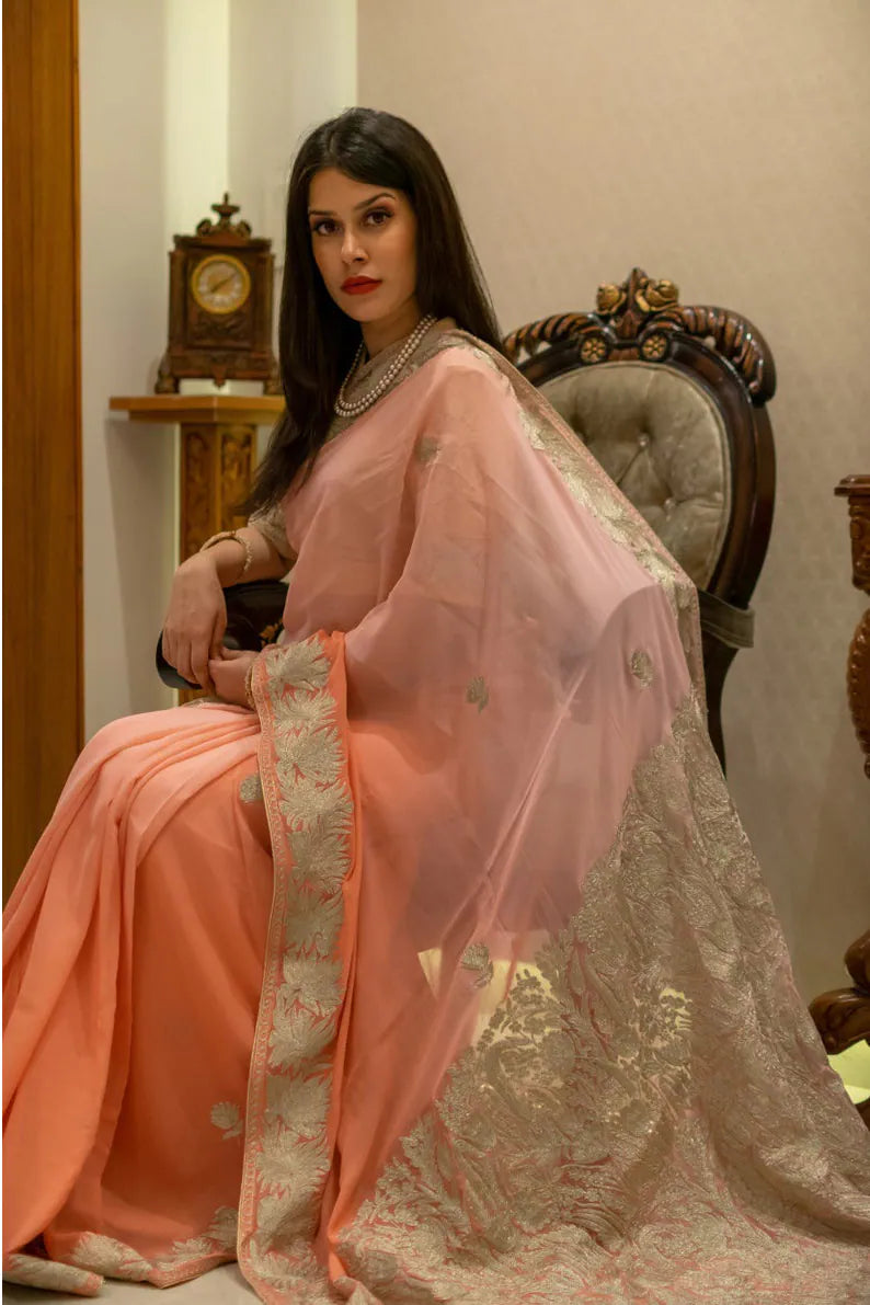 Draping Gulnaar-e-Shehzaadi feels like stepping into your own quiet moment of royalty—elegant, empowered, and deeply connected to the legacy of Kashmiri craftsmanship. The ombre Viscose Georgette glides effortlessly with every movement, while delicate dull-gold Zari embroidery adds a soft, luminous shimmer. Designed for comfort, loved for its timeless artistry, and cherished for its versatility, this saree seamlessly elevates everything from intimate gatherings to grand festivities. Essential features include dull-gold Kashmiri Zari embroidery, a fluid ombre peach/brown/magenta/green/sky-blue base, and a coordinating Indian Crepe blouse.