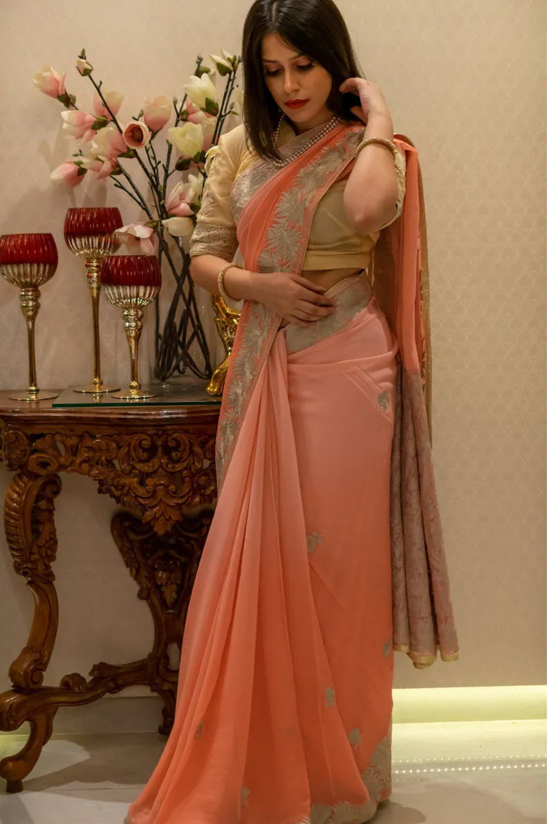 Pair with pearl or kundan jewellery to mirror the femininity of the peach ombre. Soft curls or a half-tie hairstyle create a romantic, heirloom-inspired look.