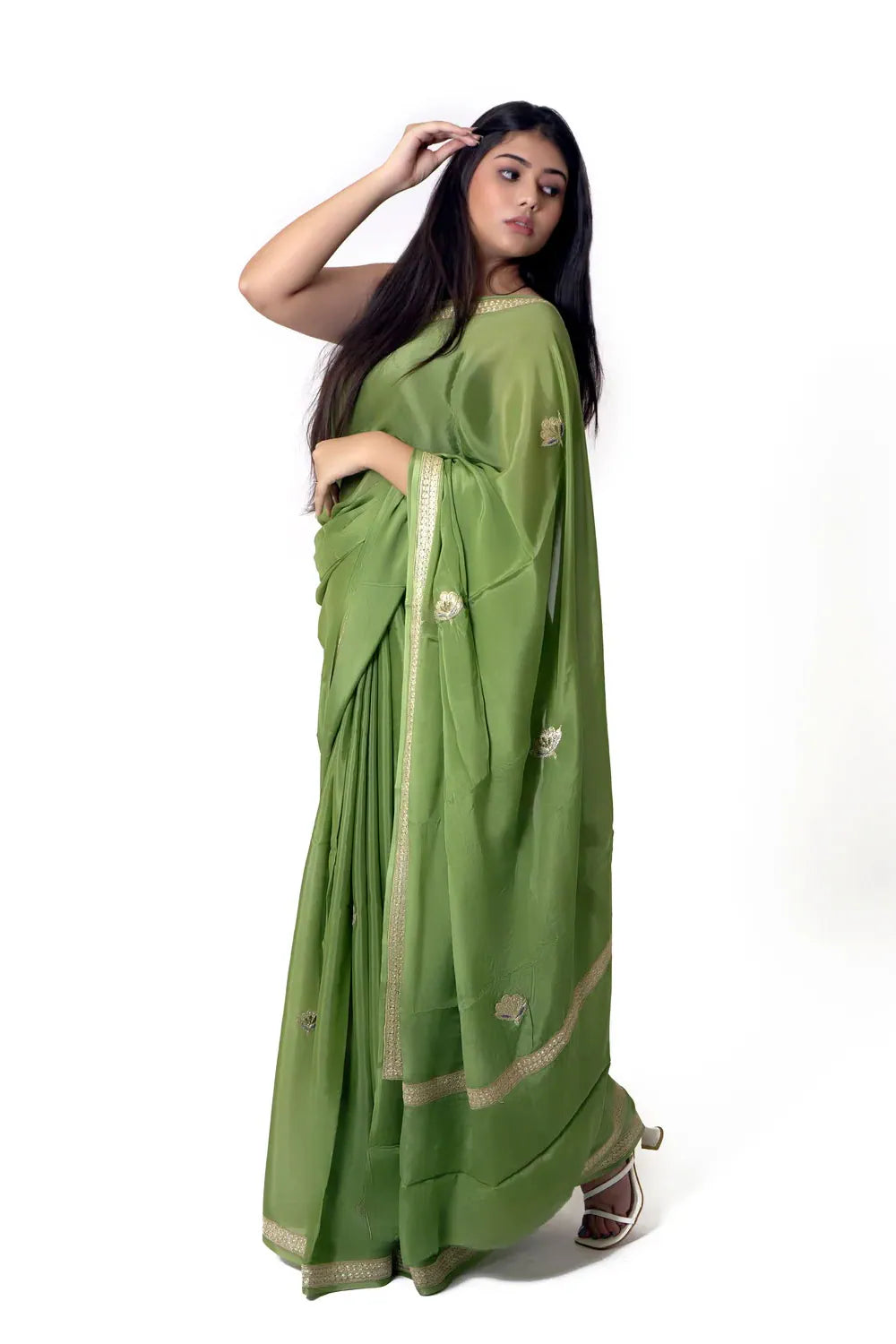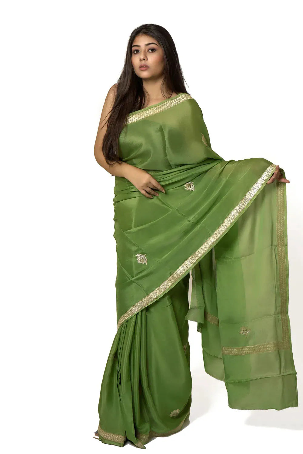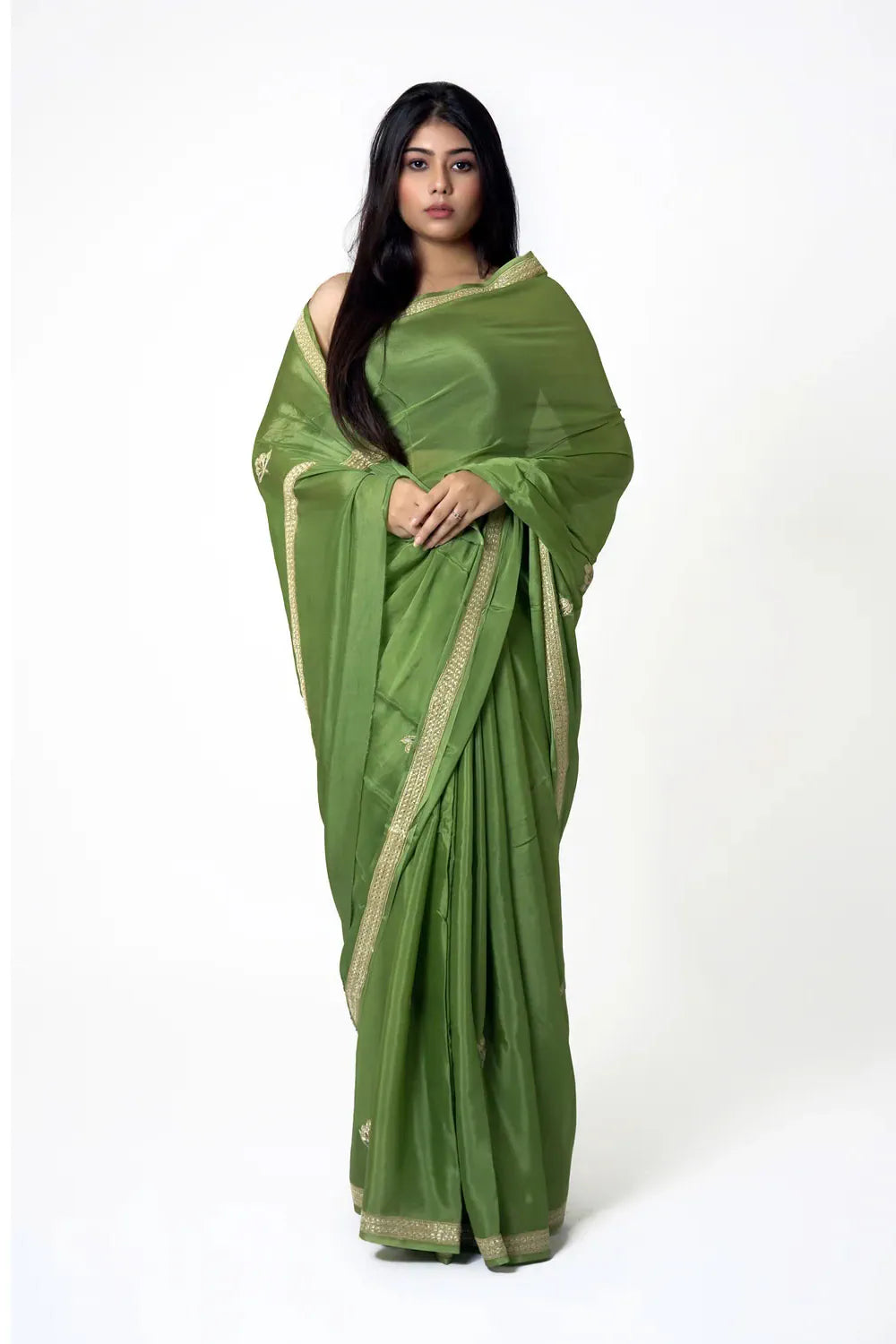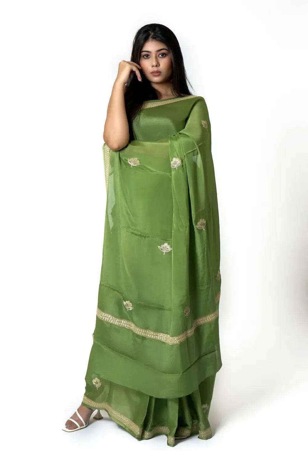 Step into a world of understated luxury with this serene green Chinon saree—crafted to make you feel graceful, empowered, and intimately connected to India’s timeless textile artistry. Its soft, fluid drape offers effortless comfort, while the dull-gold Zari embroidery—expertly done on a manual machine—adds a whisper of heritage that elevates both everyday elegance and special occasions. Versatile, lightweight, and eternally refined, this saree becomes a piece you return to year after year. Finished in Chinon with coordinated Zari motifs, it blends modern wearability with the quiet confidence of tradition.