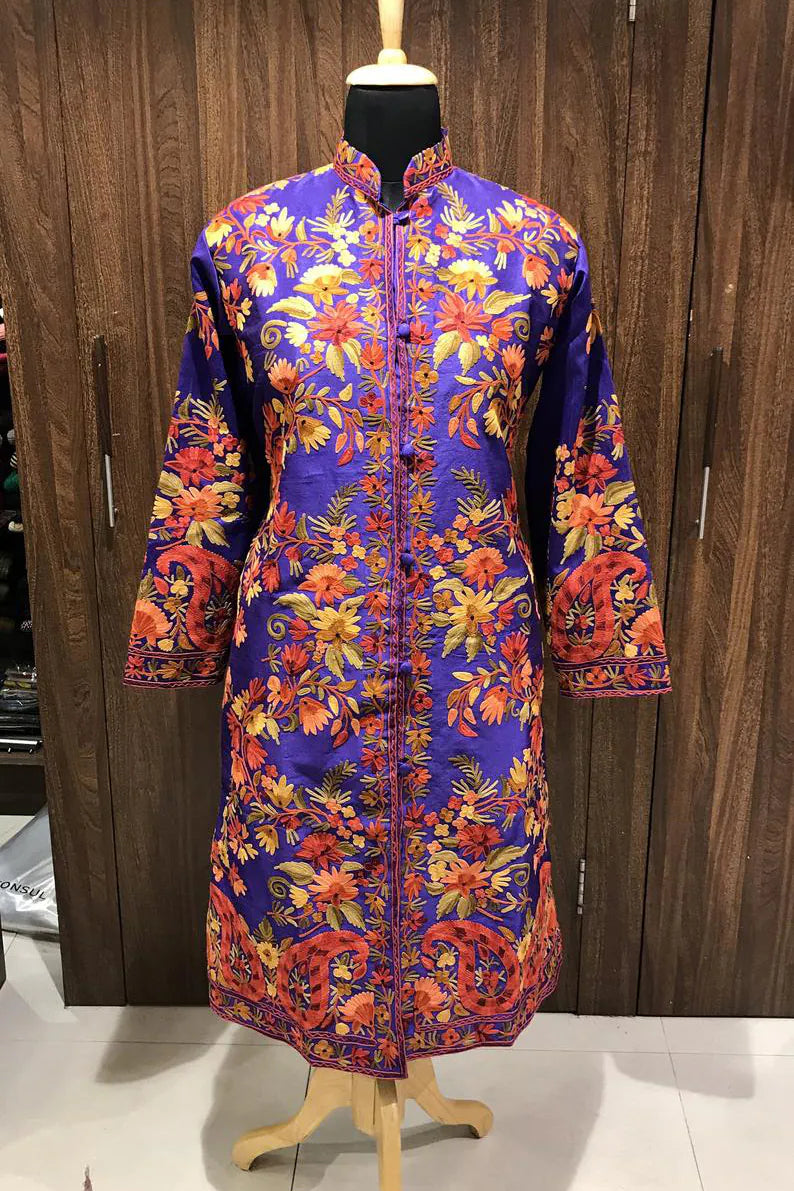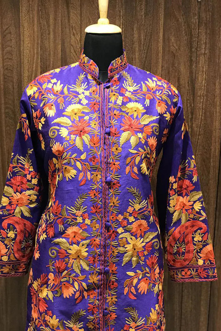 The purple surface holds light the way evening does just before it deepens. Cool toned, vivid, and steady, it carries the embroidery without letting it rush. Soft greens rise through the fabric in long, climbing lines, calm rather than exuberant, as if the jacket has learned patience over time.