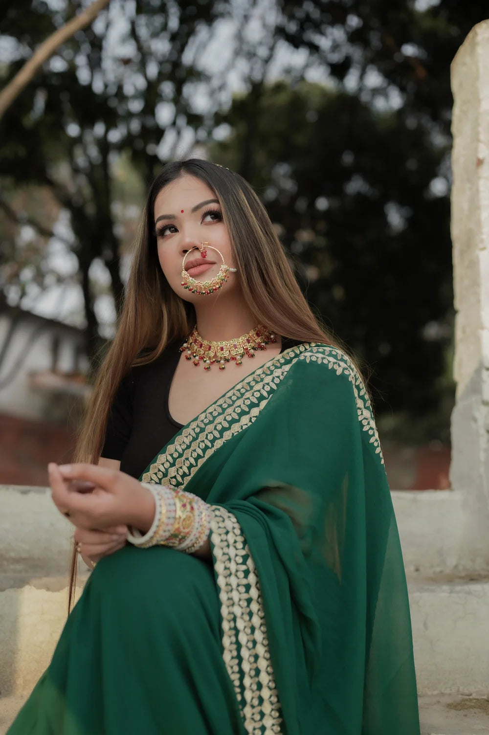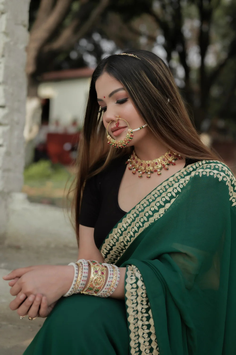 Opt for pearls or matte-gold pieces for a softer, daytime-friendly aesthetic. Pair with a black or gold blouse to balance modern appeal with cultural richness. Keep makeup fresh—soft blush, warm nude lips, and subtle gold eyes.