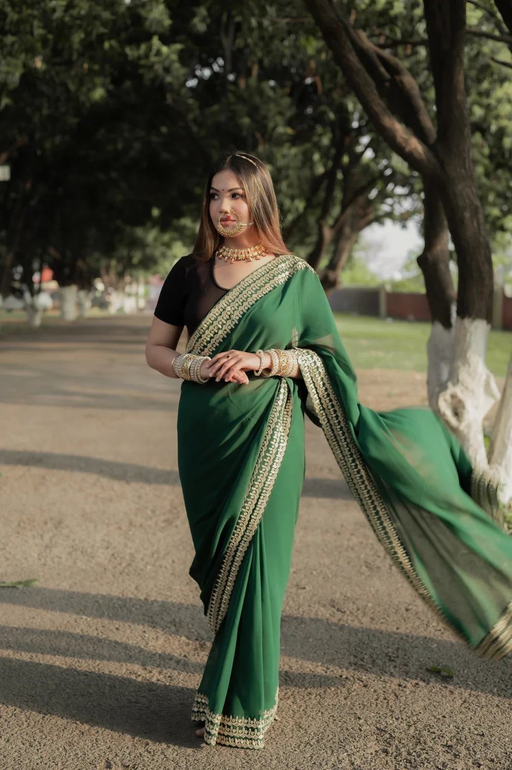 Choose a structured blouse—square neck, high neck, or sleeveless—for a fashion-forward silhouette. Style with minimal jewellery: a statement cuff or delicate drop earrings. Soft waves or straightened hair accentuate the saree’s fluid drape.