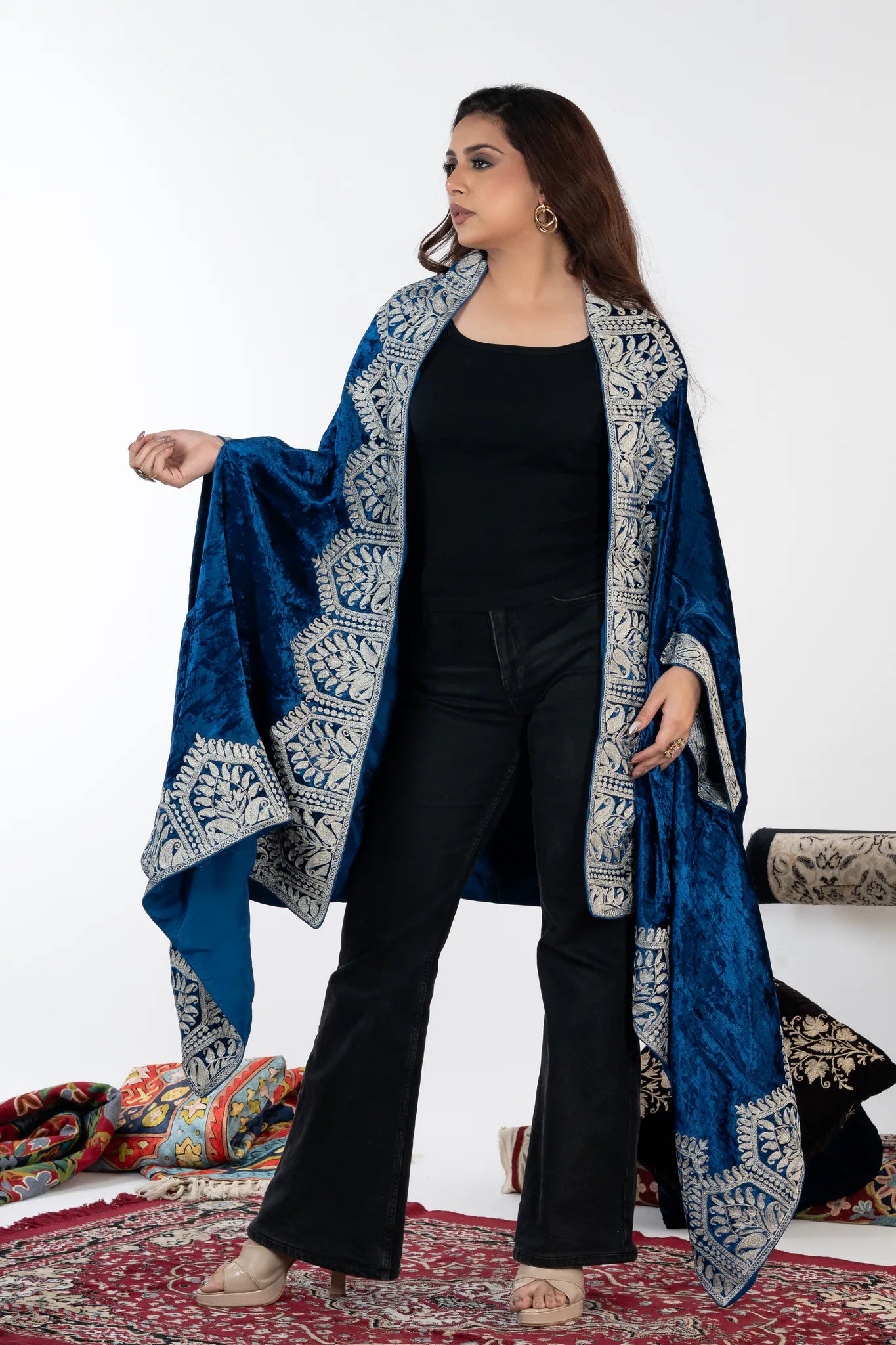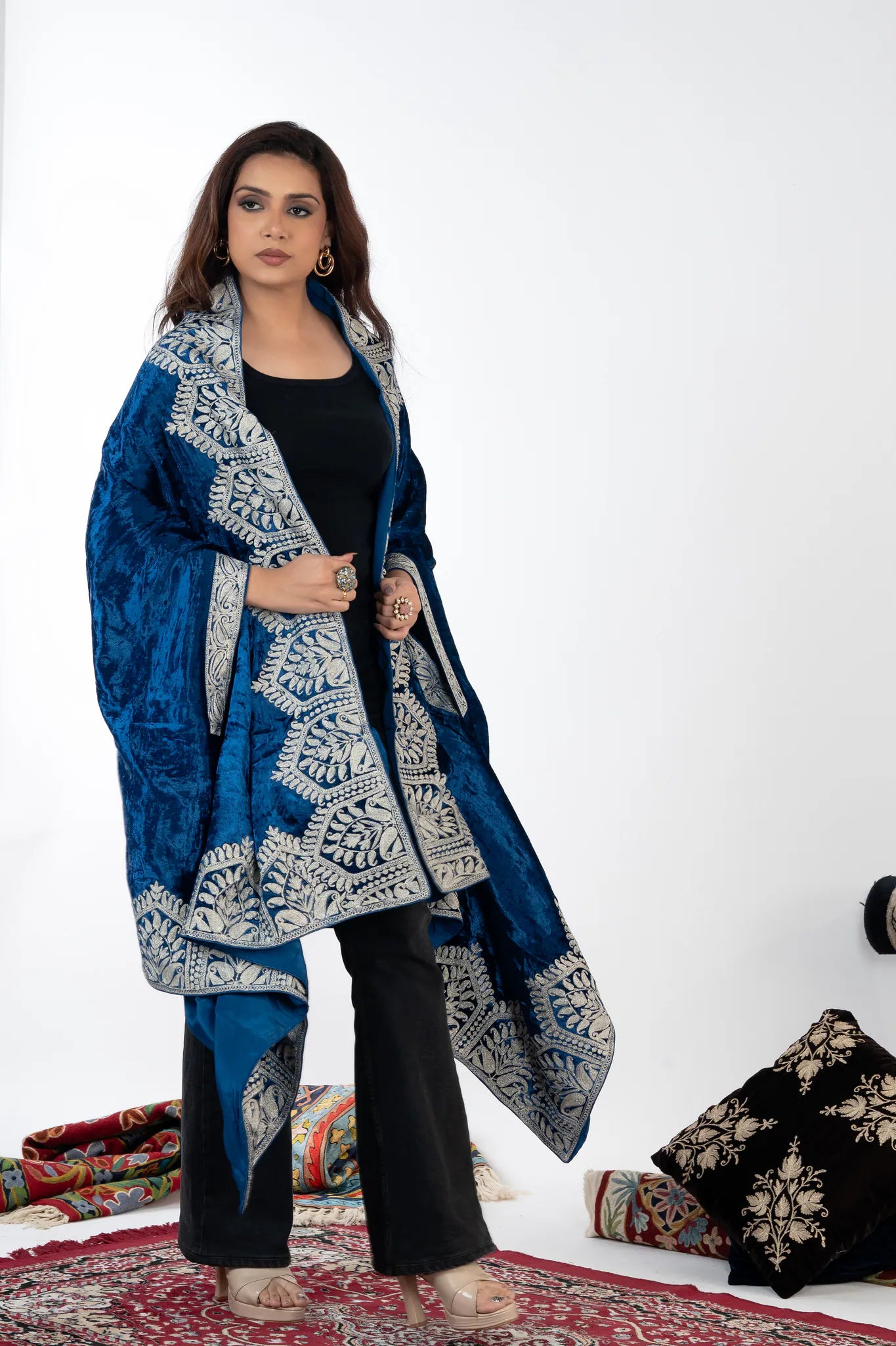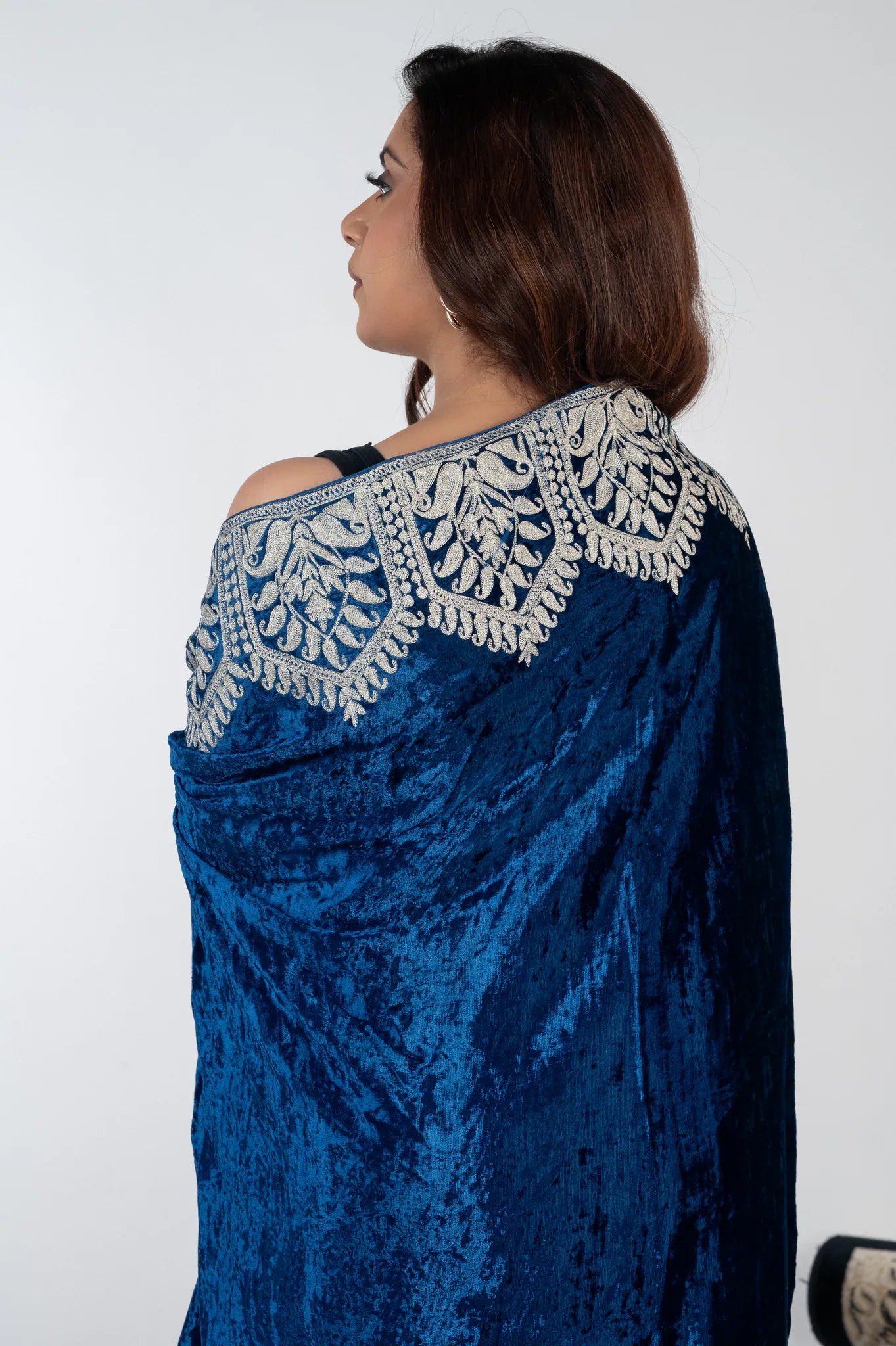 Draping Mehraab instantly evokes confidence and refined elegance, wrapping you in a sense of heritage carried forward through skilled hands. Crafted in silk velvet, this cape shawl offers a rich, fluid fall with gentle warmth that feels indulgent yet effortless. Intricate Kashmiri Tilla embroidery in silver frames the royal blue base with architectural precision, reflecting generations of craftsmanship and timeless design. Designed for versatility and enduring appeal, Mehraab features a generous 88 by 38 inch silhouette that allows graceful draping across festive evenings, formal gatherings, and winter celebrations.
