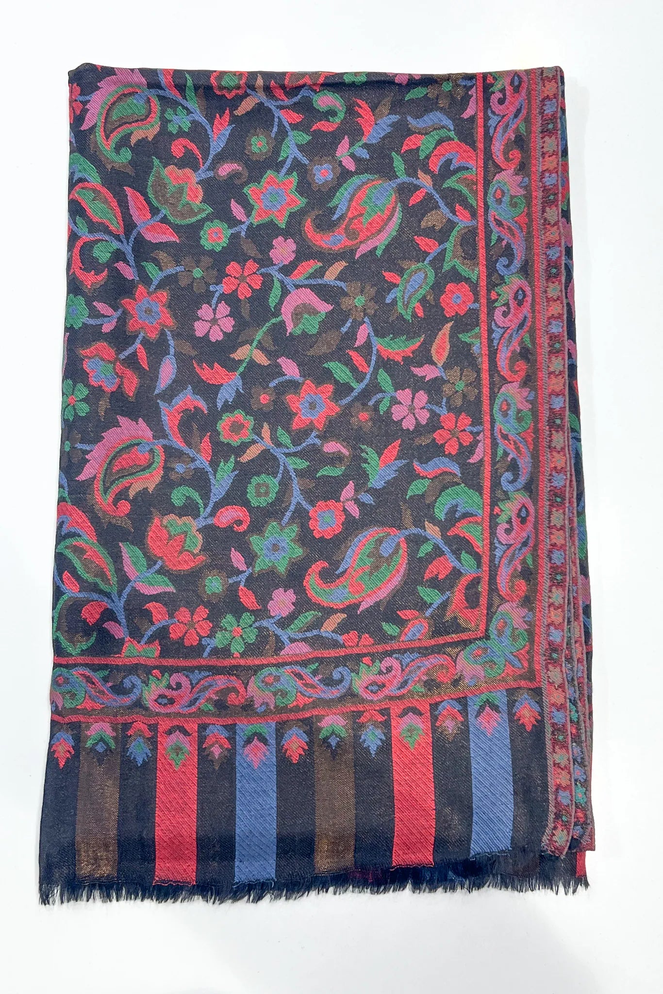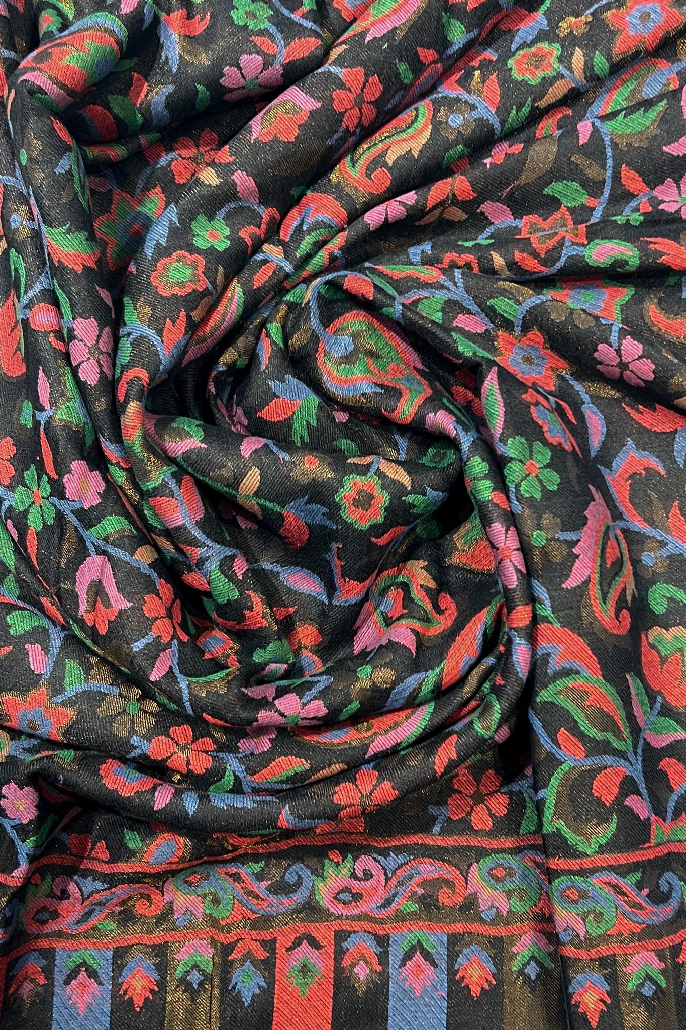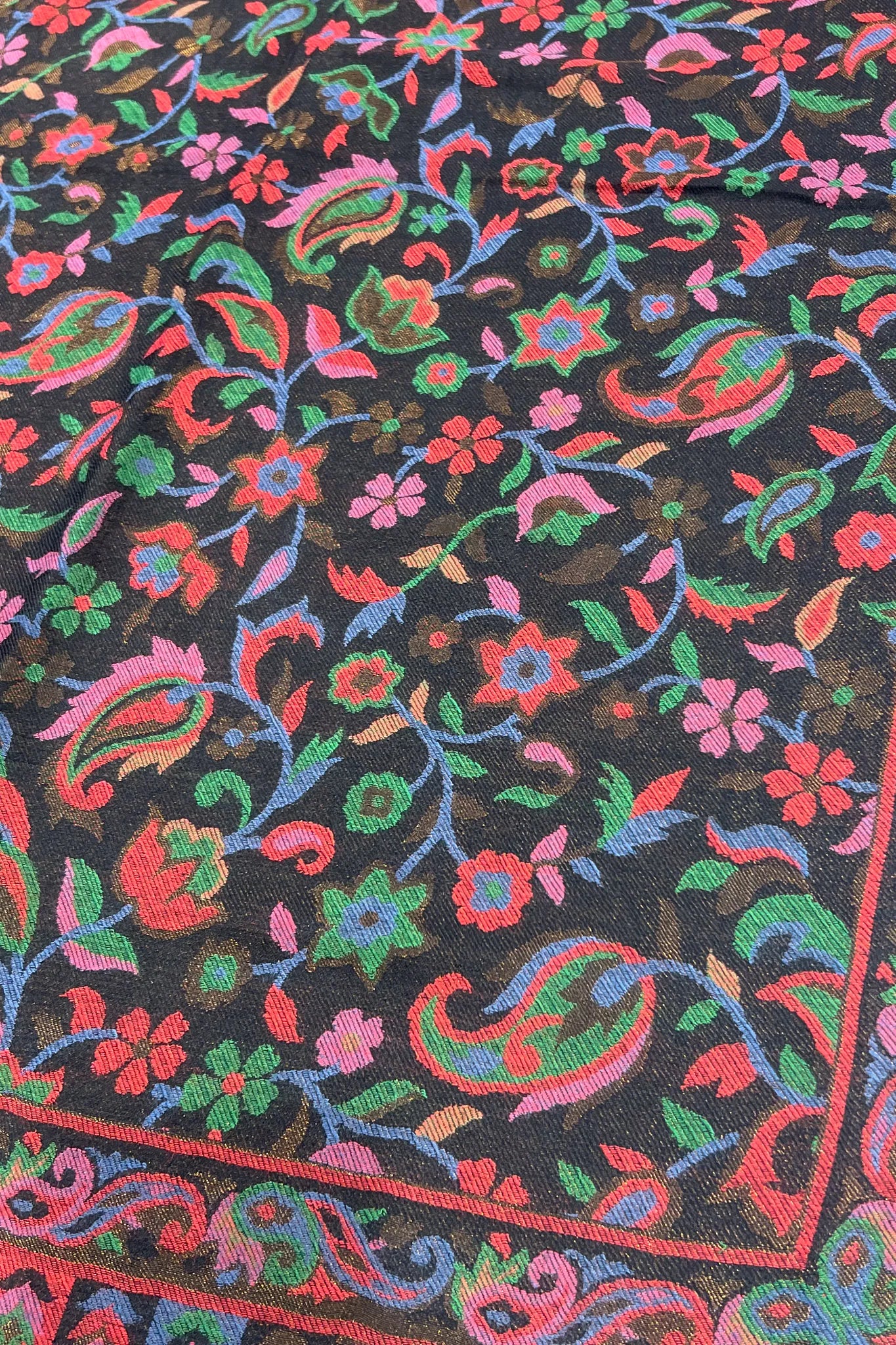 The first feeling is depth. A dark surface softened by colour that seems to surface slowly, as though the fabric is revealing something it has held onto for a long time. Florals and paisleys move across the shawl in quiet rhythm, their colours resting easily against black, touched gently with gold that never insists on being seen.