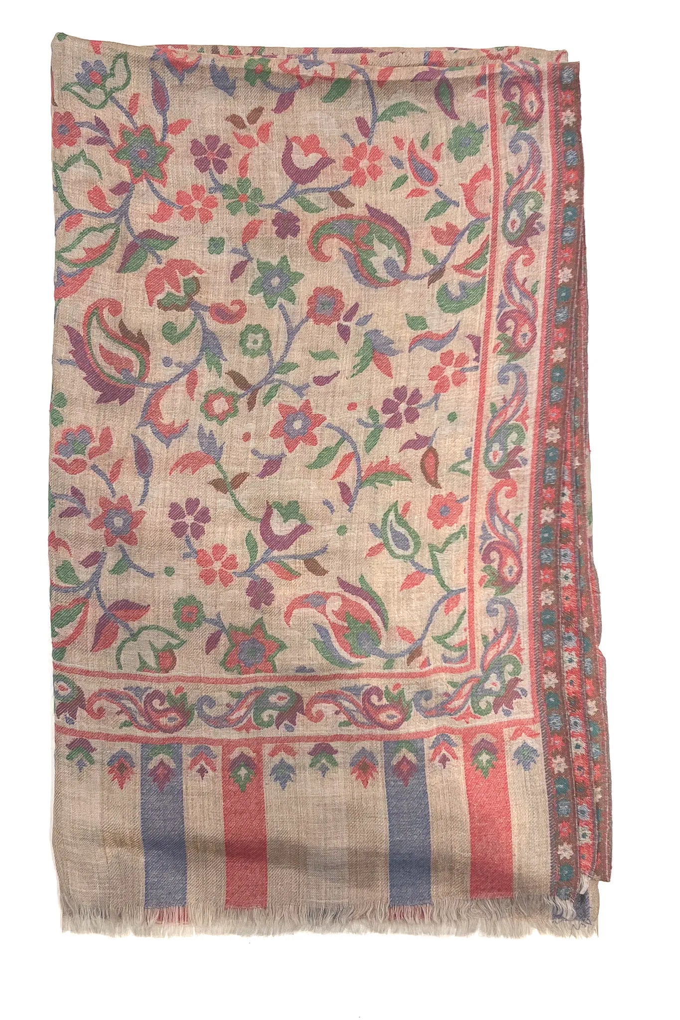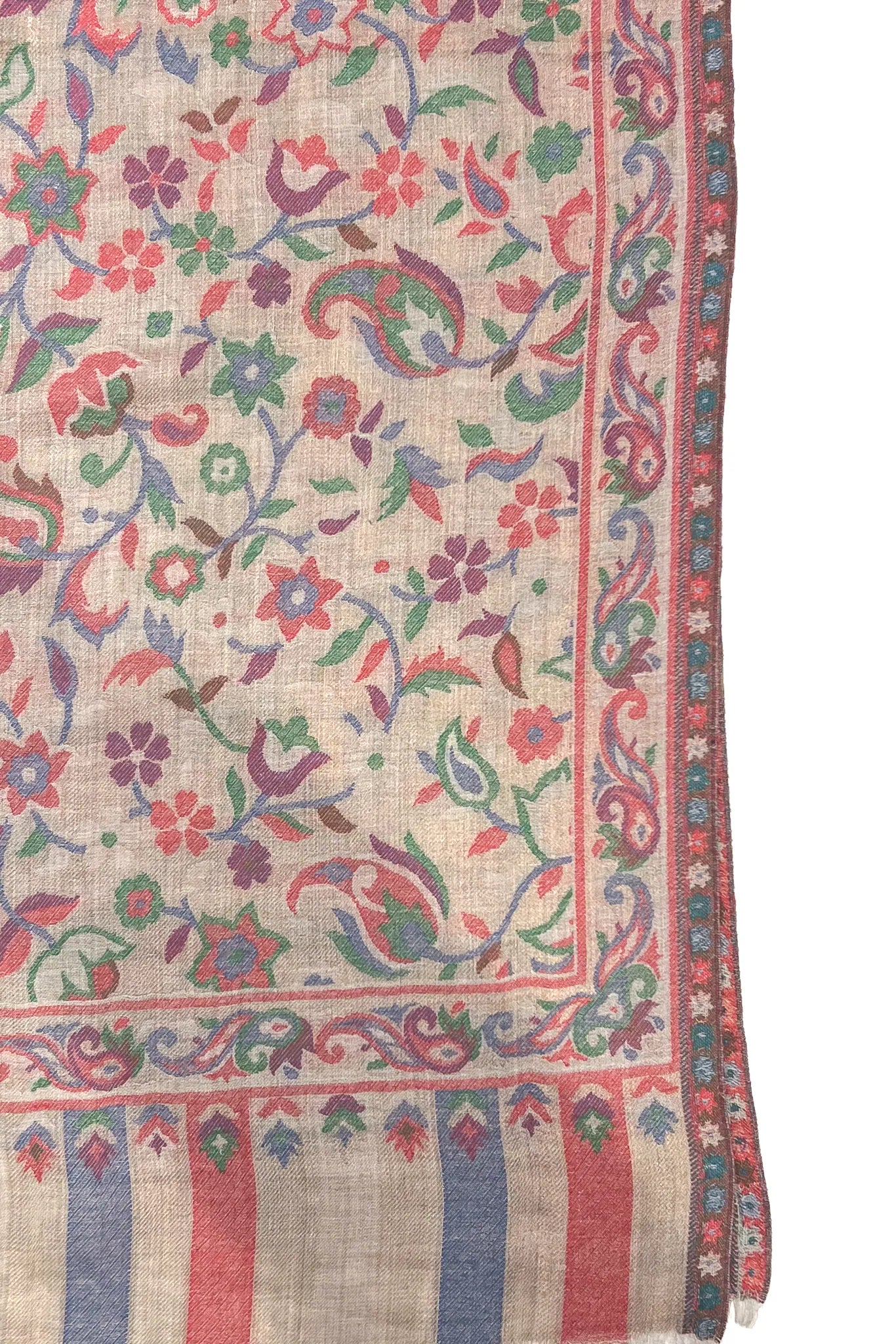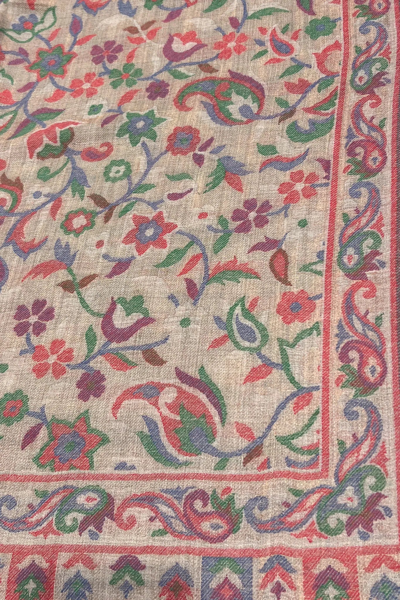 The first feeling is depth. A dark surface softened by colour that seems to surface slowly, as though the fabric is revealing something it has held onto for a long time. Florals and paisleys move across the shawl in quiet rhythm, their colours resting easily against black, touched gently with gold that never insists on being seen.