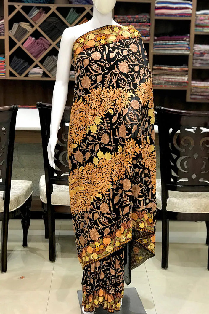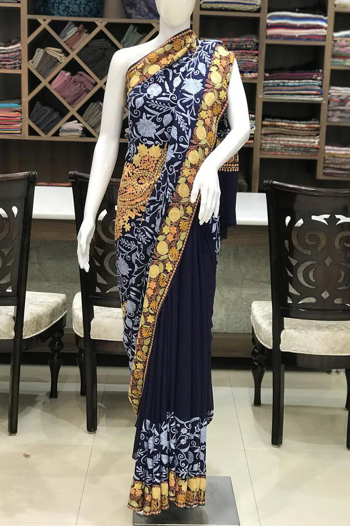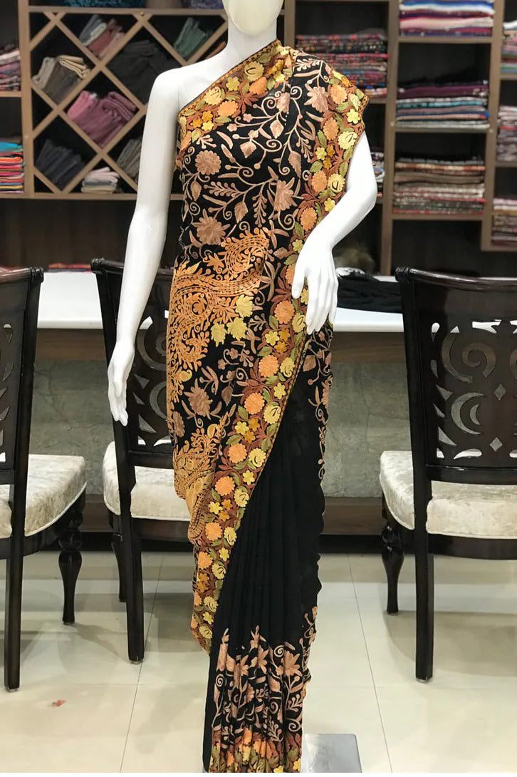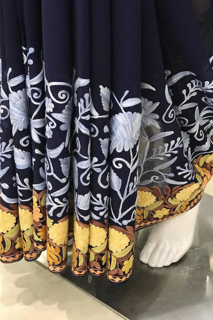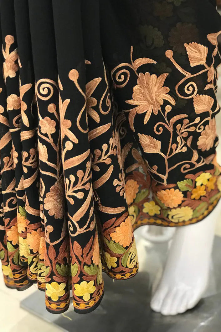 Raga expresses harmony through craft, texture, and movement, allowing you to feel composed and confident. All over Kashmiri aari embroidery unfolds rhythmically across a dark base, reflecting precision and cultural artistry. The viscose georgette fabric drapes effortlessly, offering ease and elegance through long celebrations. Designed for grand occasions, Raga balances visual richness with refined sophistication. Paired with an Indian crepe blouse, it is a statement of timeless luxury rooted in heritage.