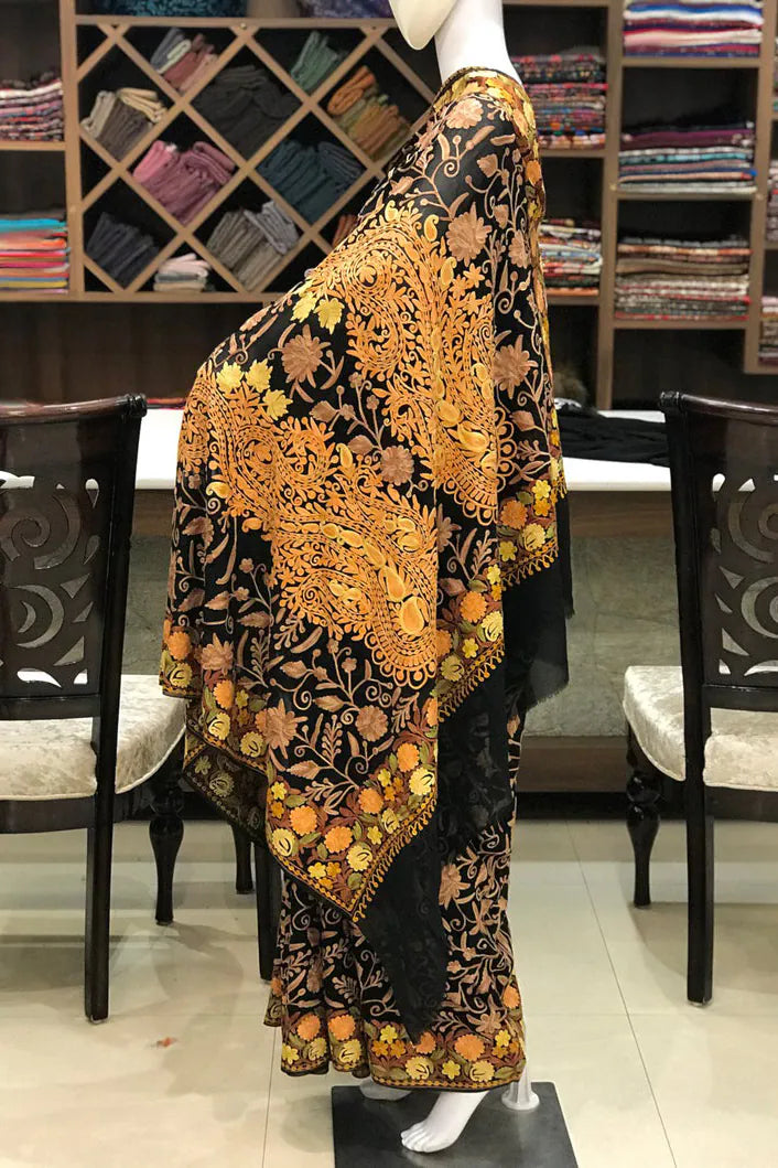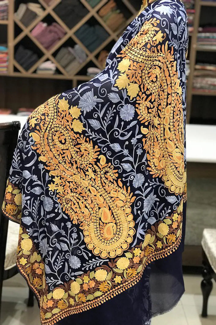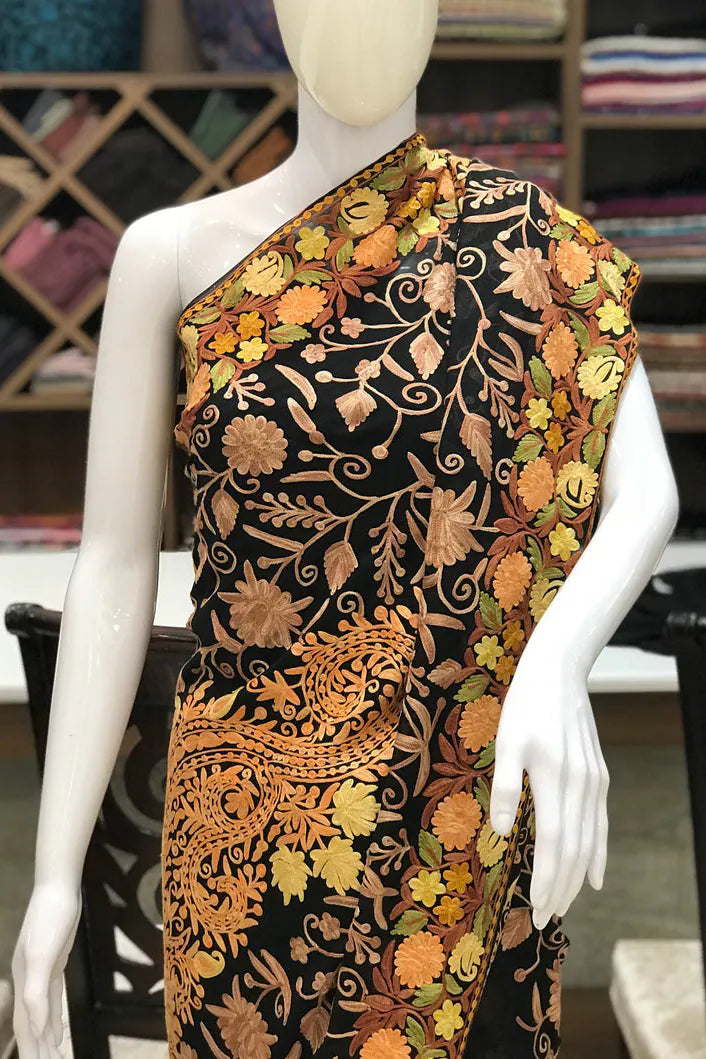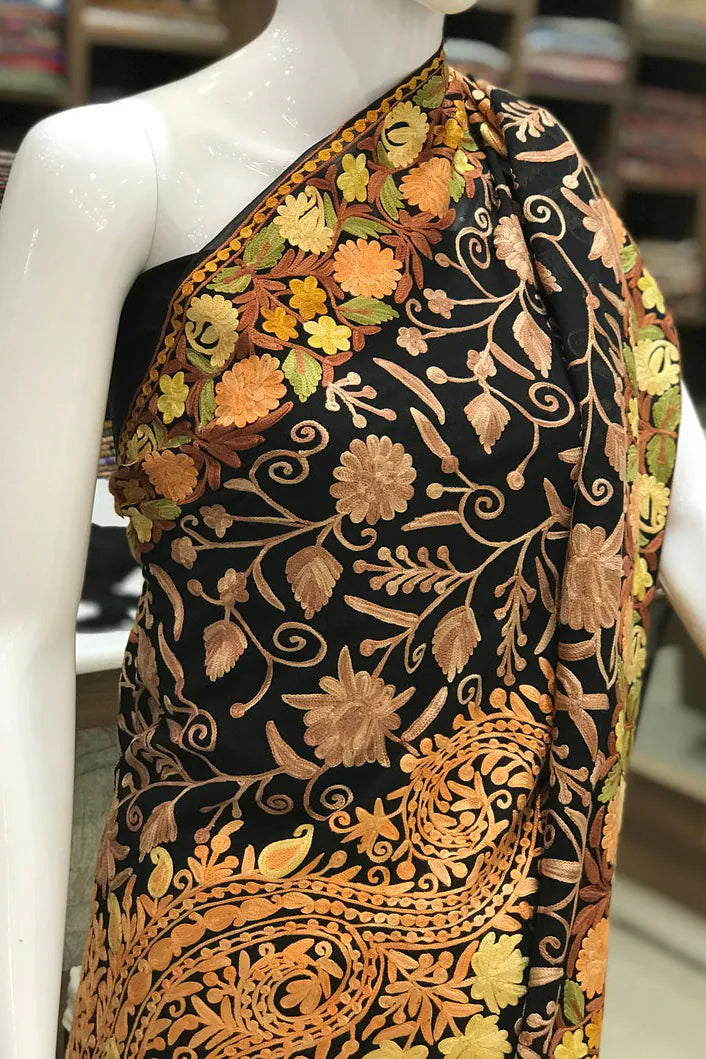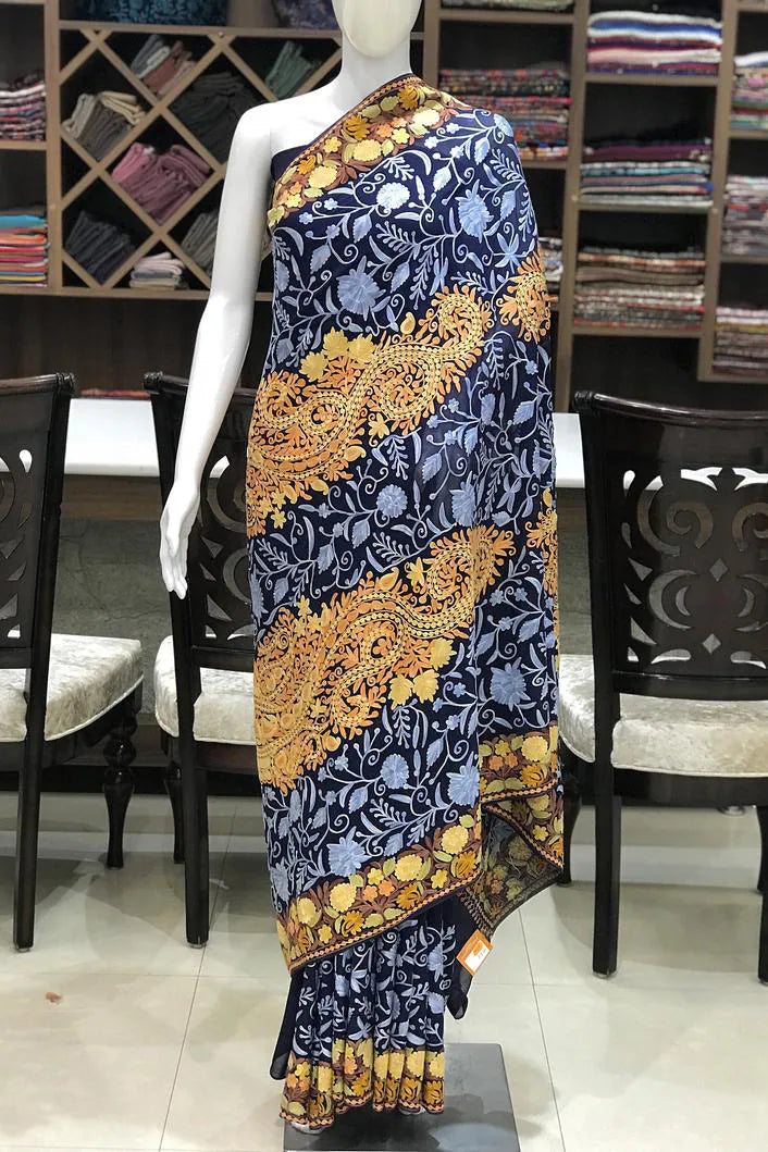 Raga expresses harmony through craft, texture, and movement, allowing you to feel composed and confident. All over Kashmiri aari embroidery unfolds rhythmically across a dark base, reflecting precision and cultural artistry. The viscose georgette fabric drapes effortlessly, offering ease and elegance through long celebrations. Designed for grand occasions, Raga balances visual richness with refined sophistication. Paired with an Indian crepe blouse, it is a statement of timeless luxury rooted in heritage.