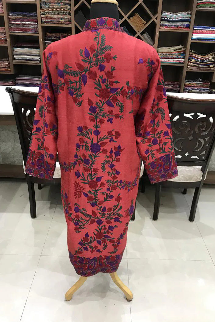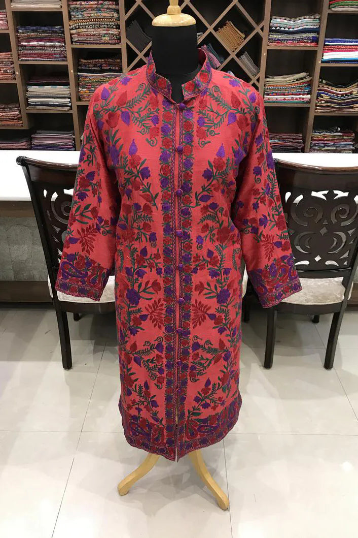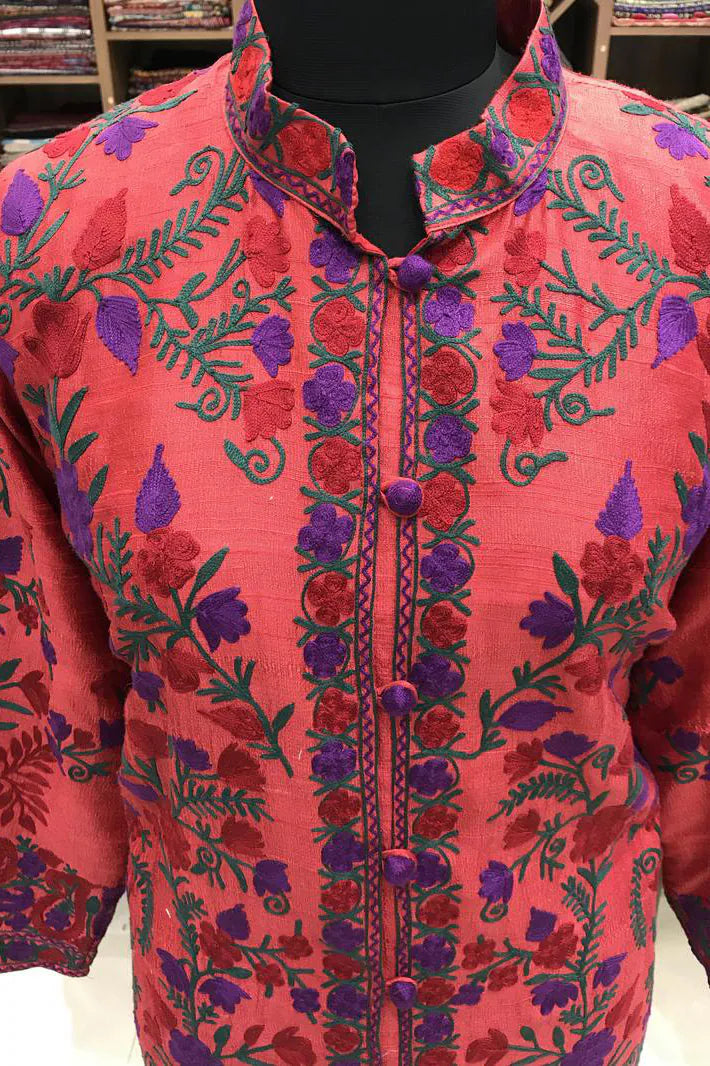 The colour arrives first, deep and warm, like something seen indoors just before evening settles. Red that feels held rather than bright, layered with purple and green embroidery that moves calmly across the surface. The motifs do not rush. They spread with familiarity, balanced and assured, as though they have always belonged here.