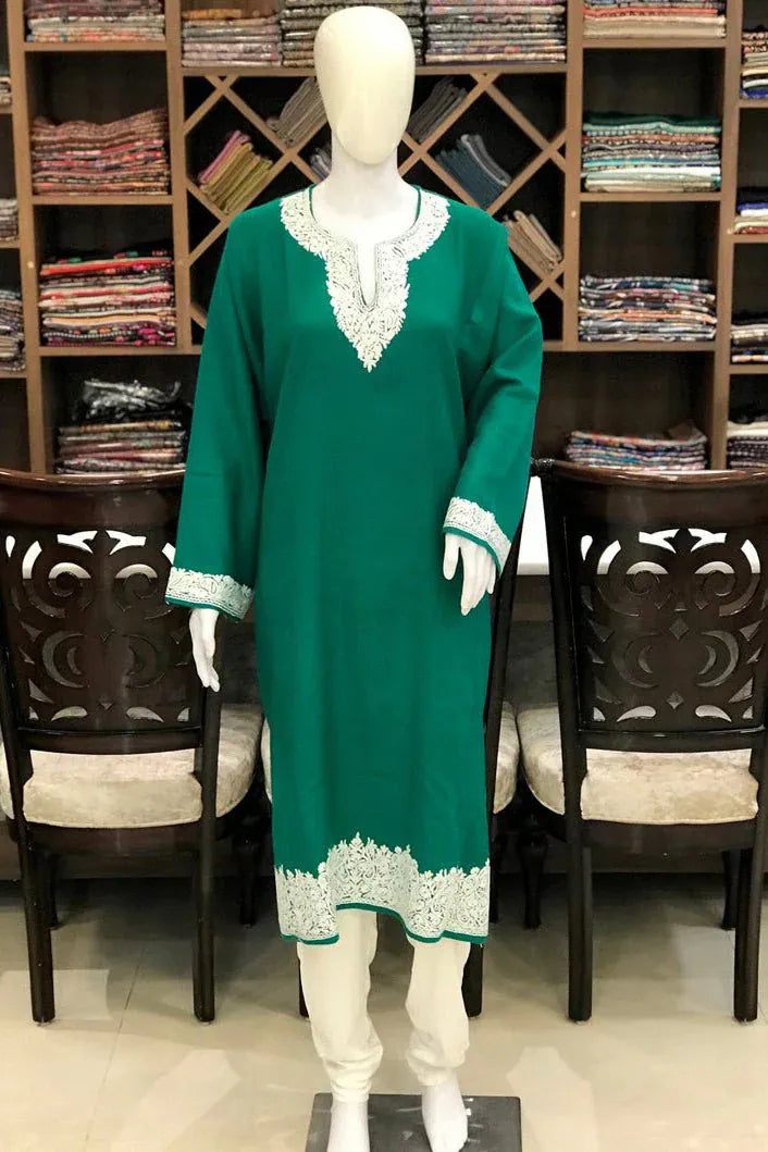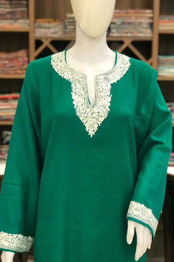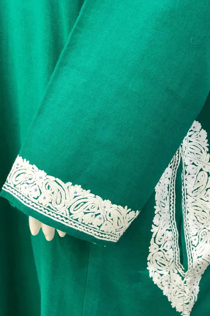 The green arrives first with a sense of calm, deep and settled, carrying the kind of warmth that feels steady rather than bright. White embroidery traces the neckline and hem with quiet confidence, resting against the wool as if it has always belonged there. The first impression is grounding, familiar, and unhurried.