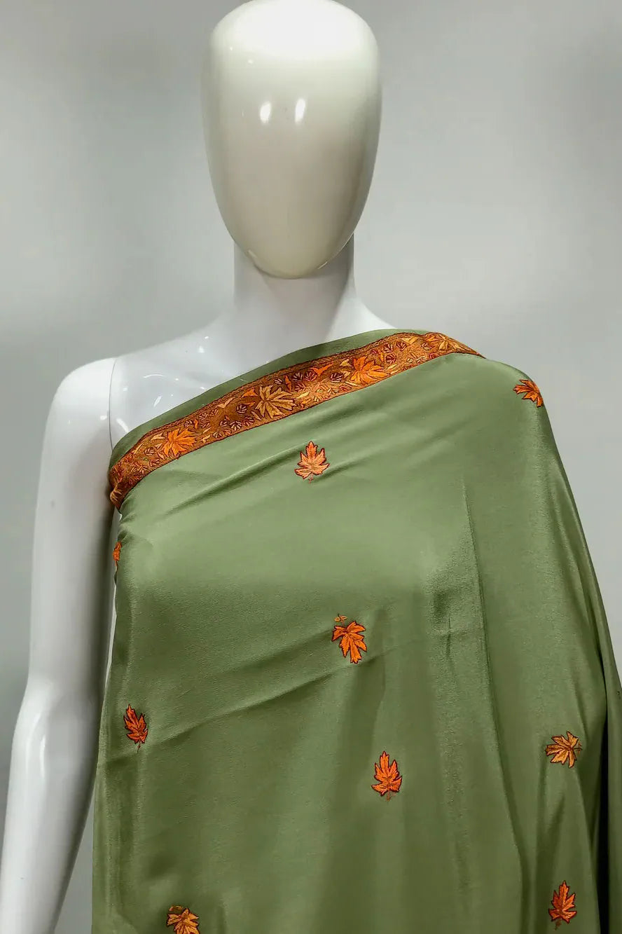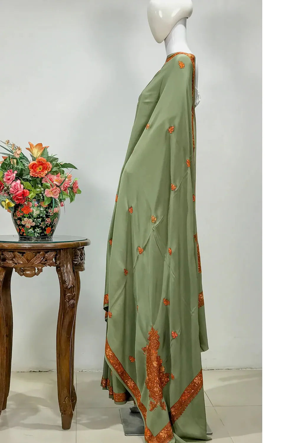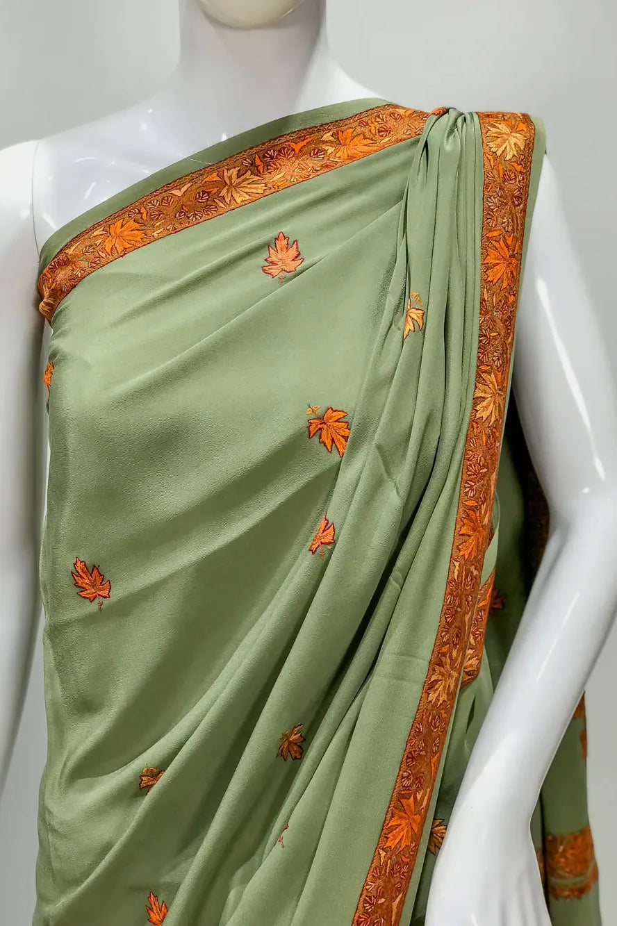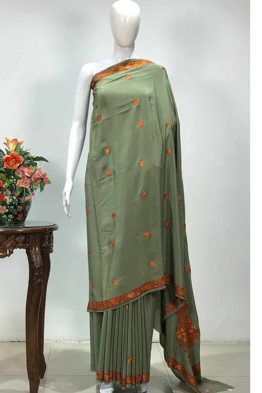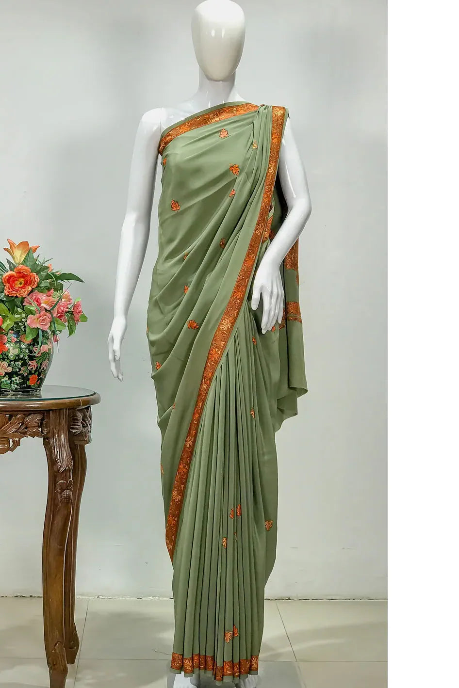 Wearing Zaib-e-Sozni feels like stepping into the soft glow of tradition—elegant, empowered, and deeply connected to the heritage of Kashmir. Crafted in luxurious pure crepe, the saree drapes with effortless fluidity, while delicate Sozni hand embroidery blooms across its surface in warm multi-colour motifs—each stitch a testament to an artisan’s patience, precision, and devotion. Lightweight, versatile, and timeless in its appeal, this saree blends comfort with craftsmanship, making it a meaningful heirloom for celebrations, milestones, and intimate gatherings. Essential features include authentic Sozni hand embroidery, a serene pickle-green base, and a matching pure crepe blouse.