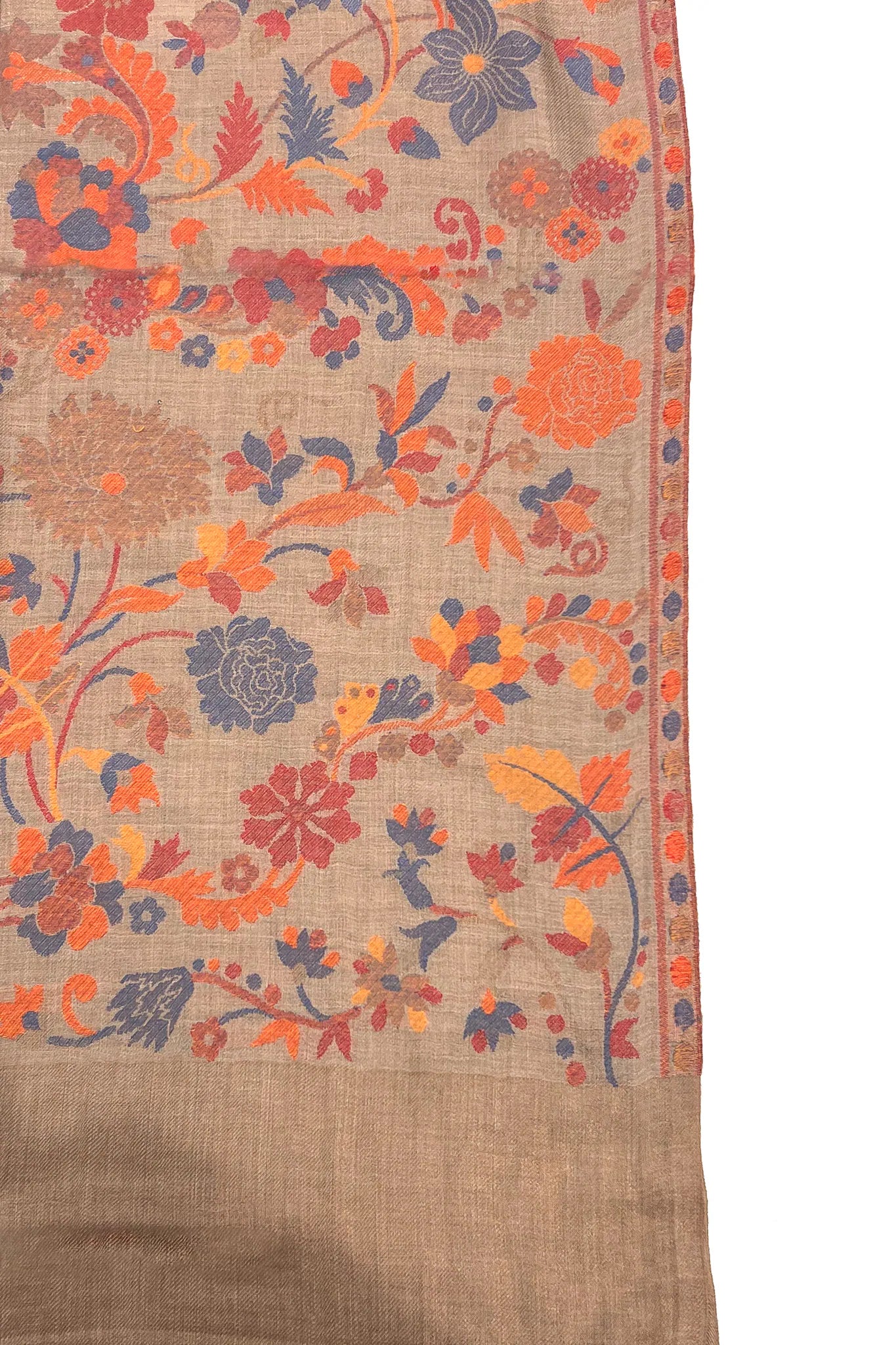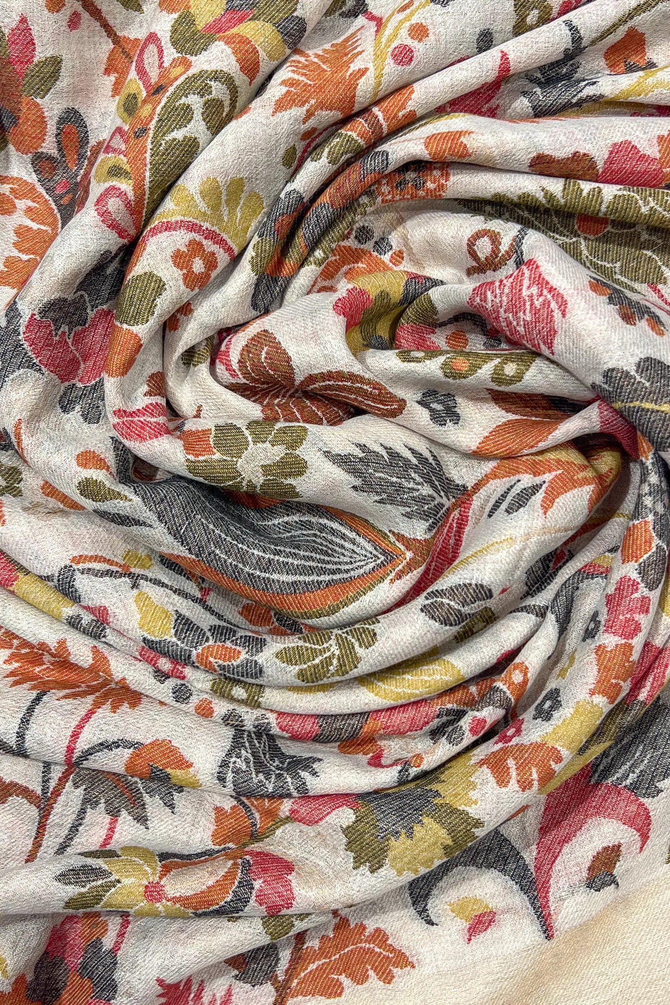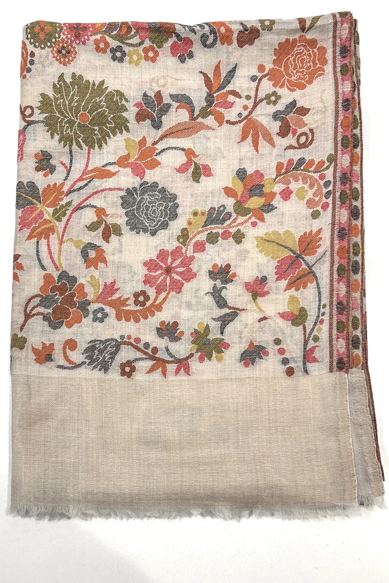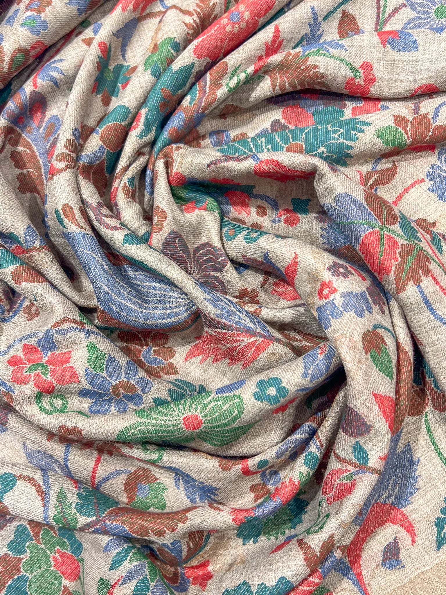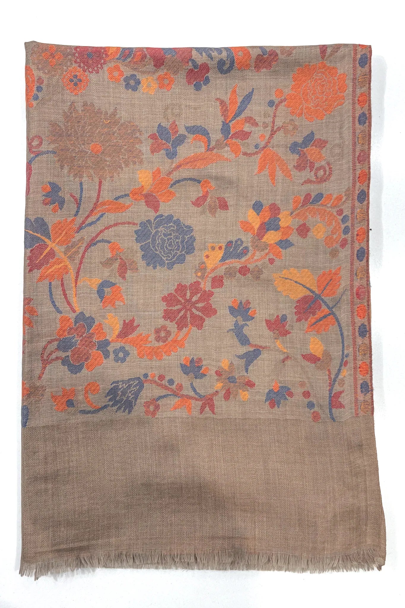 There is a quiet richness to Zayrahn that reveals itself slowly. At first glance, the surface feels calm and composed, but as the fabric moves, layers of colour begin to surface. Deep florals, softened by time, drift across the shawl like a memory revisited more than once. The wool holds warmth without weight, settling gently against the skin, neither demanding attention nor fading away.