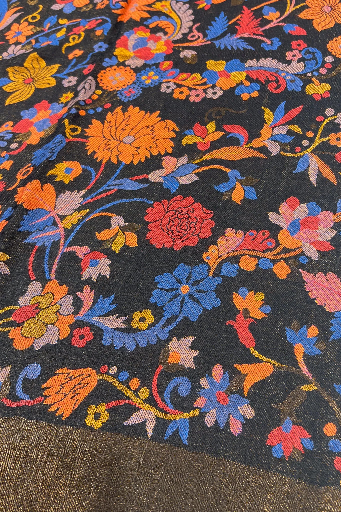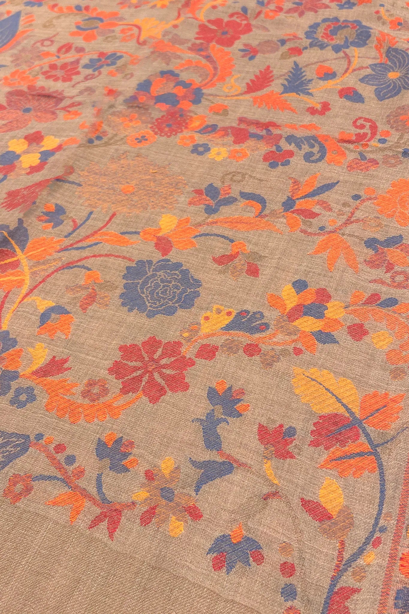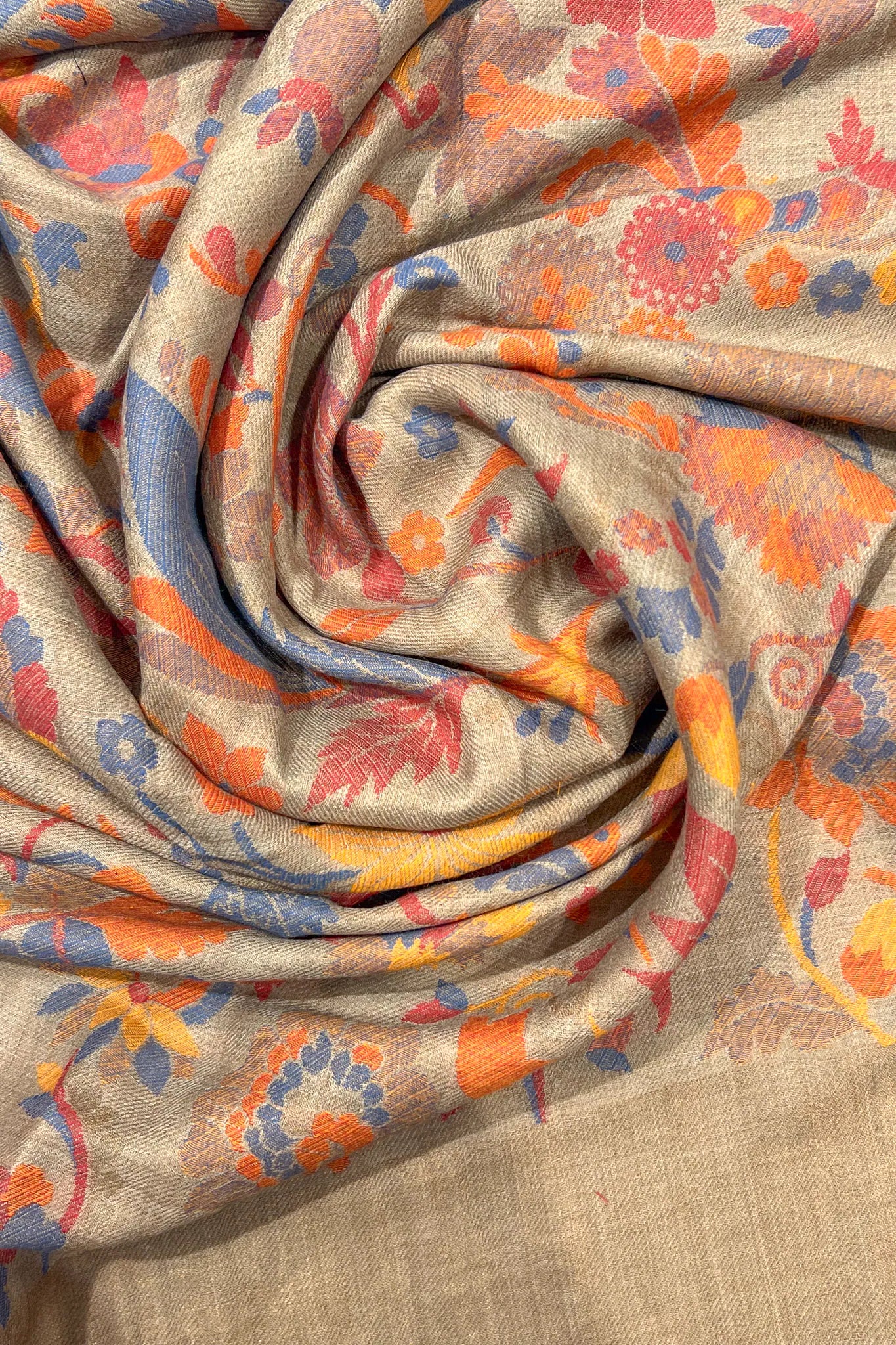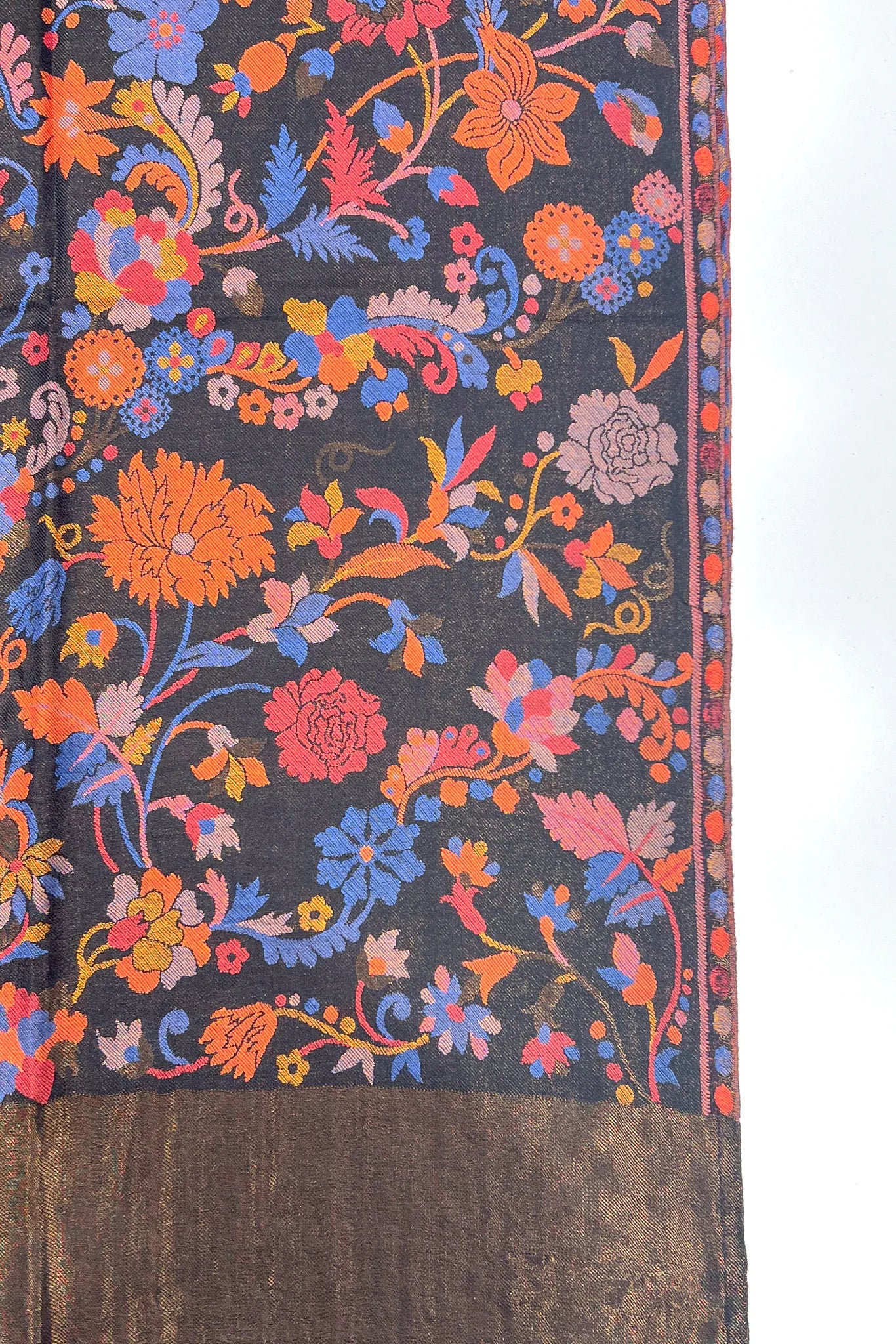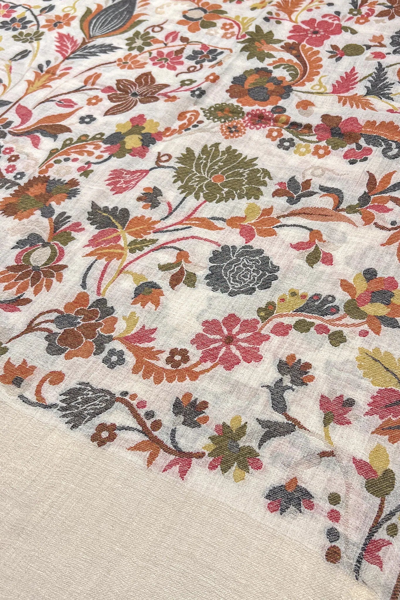 There is a quiet richness to Zayrahn that reveals itself slowly. At first glance, the surface feels calm and composed, but as the fabric moves, layers of colour begin to surface. Deep florals, softened by time, drift across the shawl like a memory revisited more than once. The wool holds warmth without weight, settling gently against the skin, neither demanding attention nor fading away.