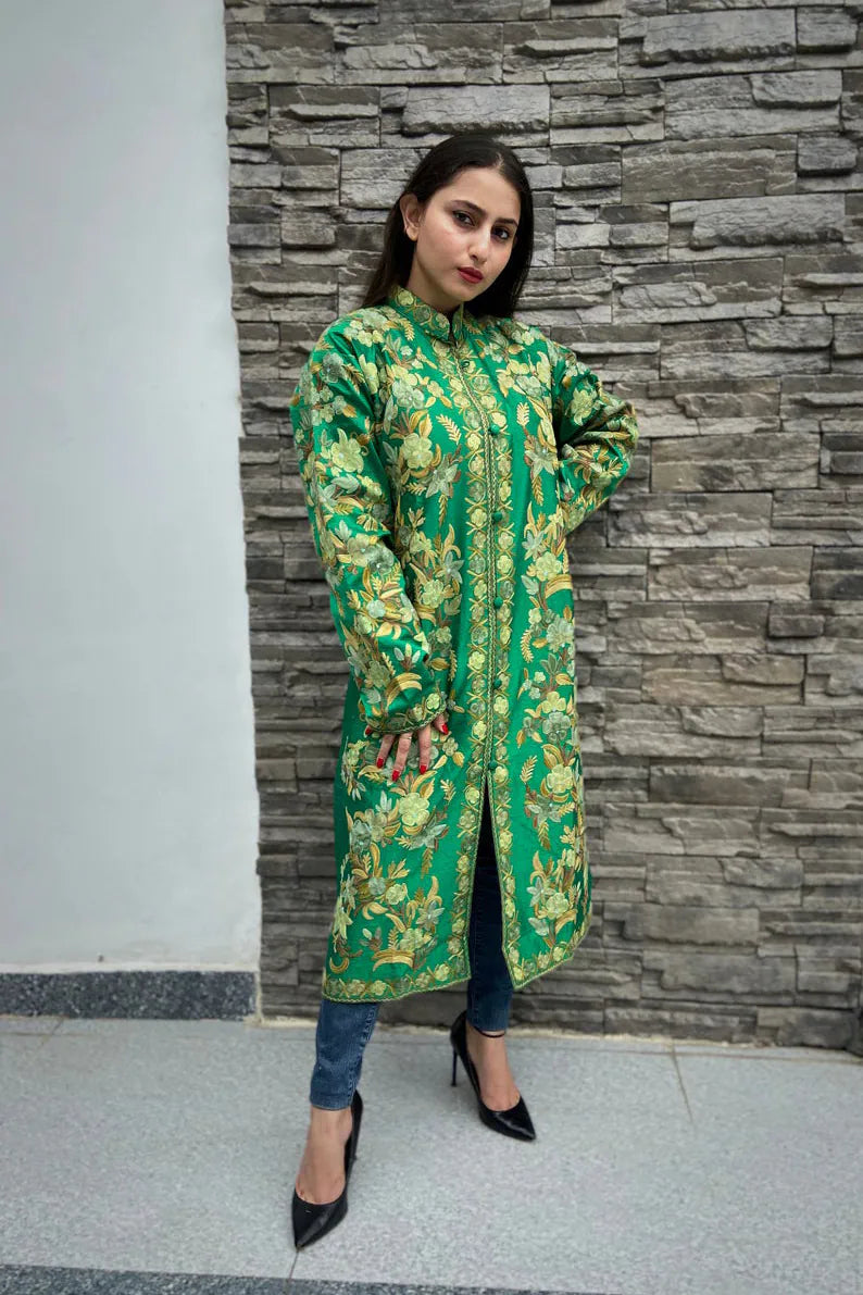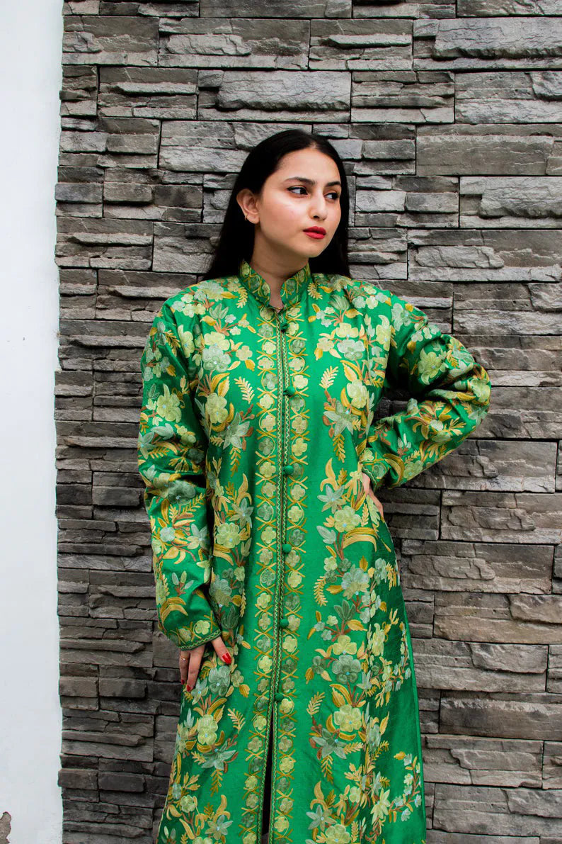Worn, it feels protective in the gentlest way. The length adds presence without heaviness, and the embroidery creates a sense of slow abundance rather than display. It carries the comfort of something familiar, the kind of garment that makes you stand a little steadier. There is joy here, but it is grounded, meant for long conversations, unhurried evenings, and moments that do not need announcement.