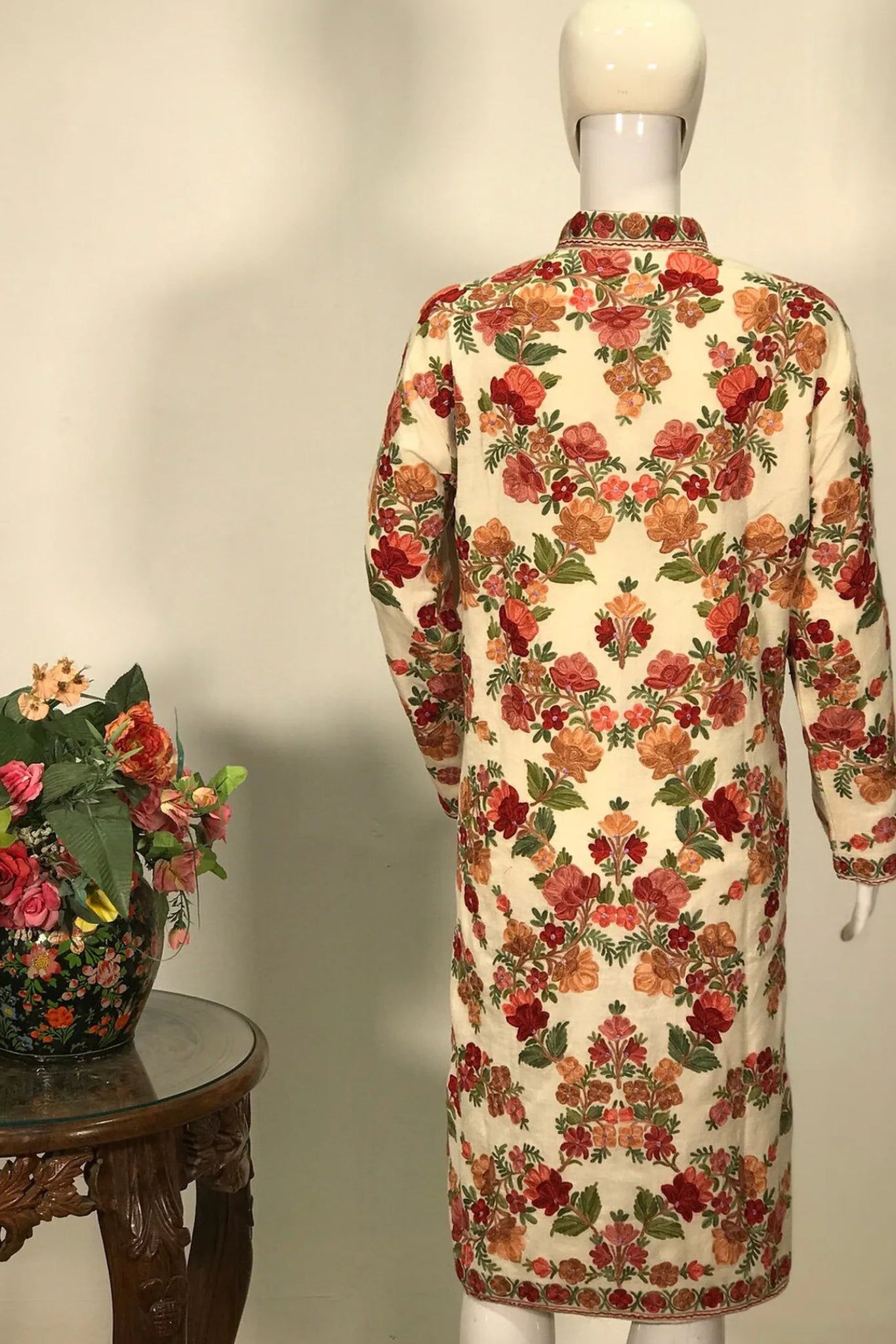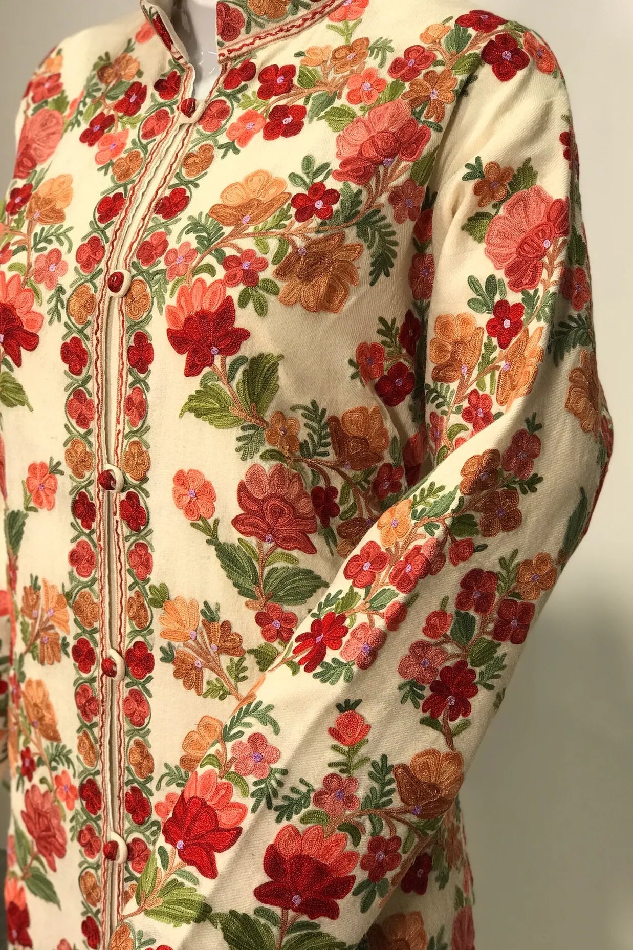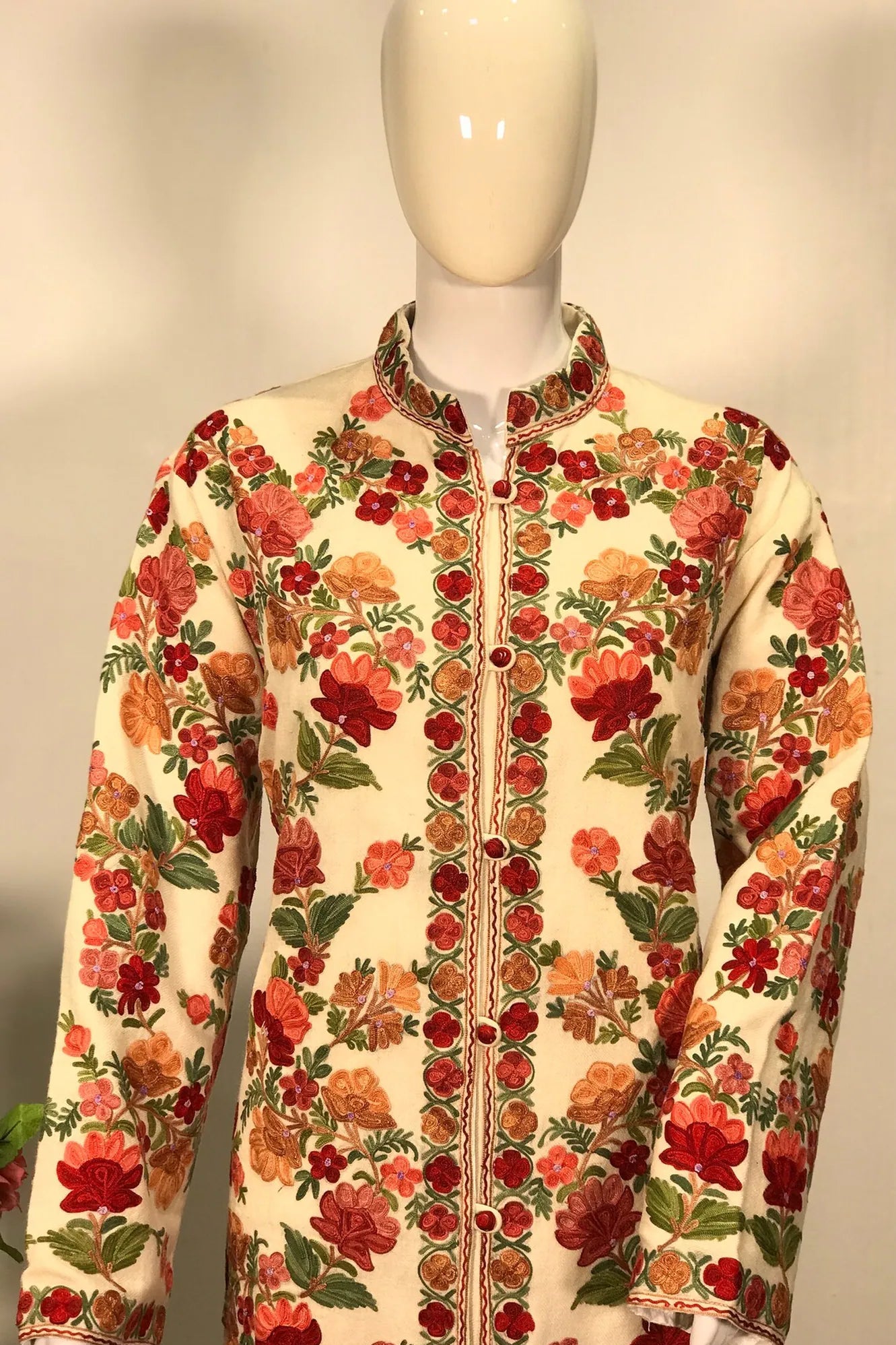 Worn, it carries a comforting warmth without heaviness. The embroidery feels alive but never loud, spread generously yet thoughtfully, allowing the coat to feel festive while remaining deeply wearable. It moves easily with the body, lending a quiet confidence—something you reach for when you want to feel put together without trying too hard, when celebration and comfort need to exist in the same breath.