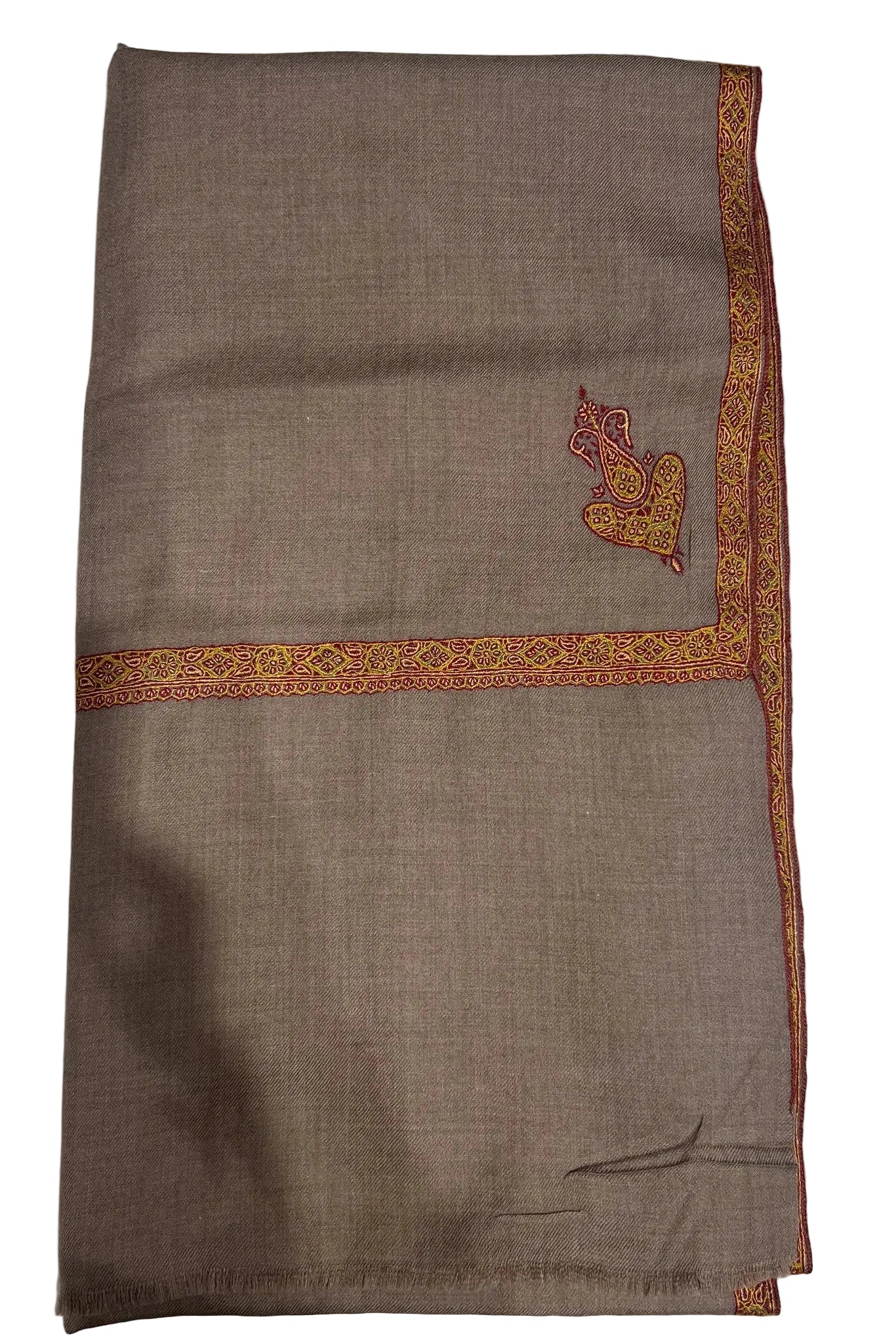 Worn, it feels grounding. The tight weave gives a sense of permanence, while the floral sozni embroidery appears gently along the border and motif, like something noticed slowly over time. It warms without enclosing, resting easily across the shoulders and staying where it is placed. There is comfort in its balance, in how it feels present without being pronounced. It belongs to moments that move at their own pace, where warmth is shared and silence feels companionable.