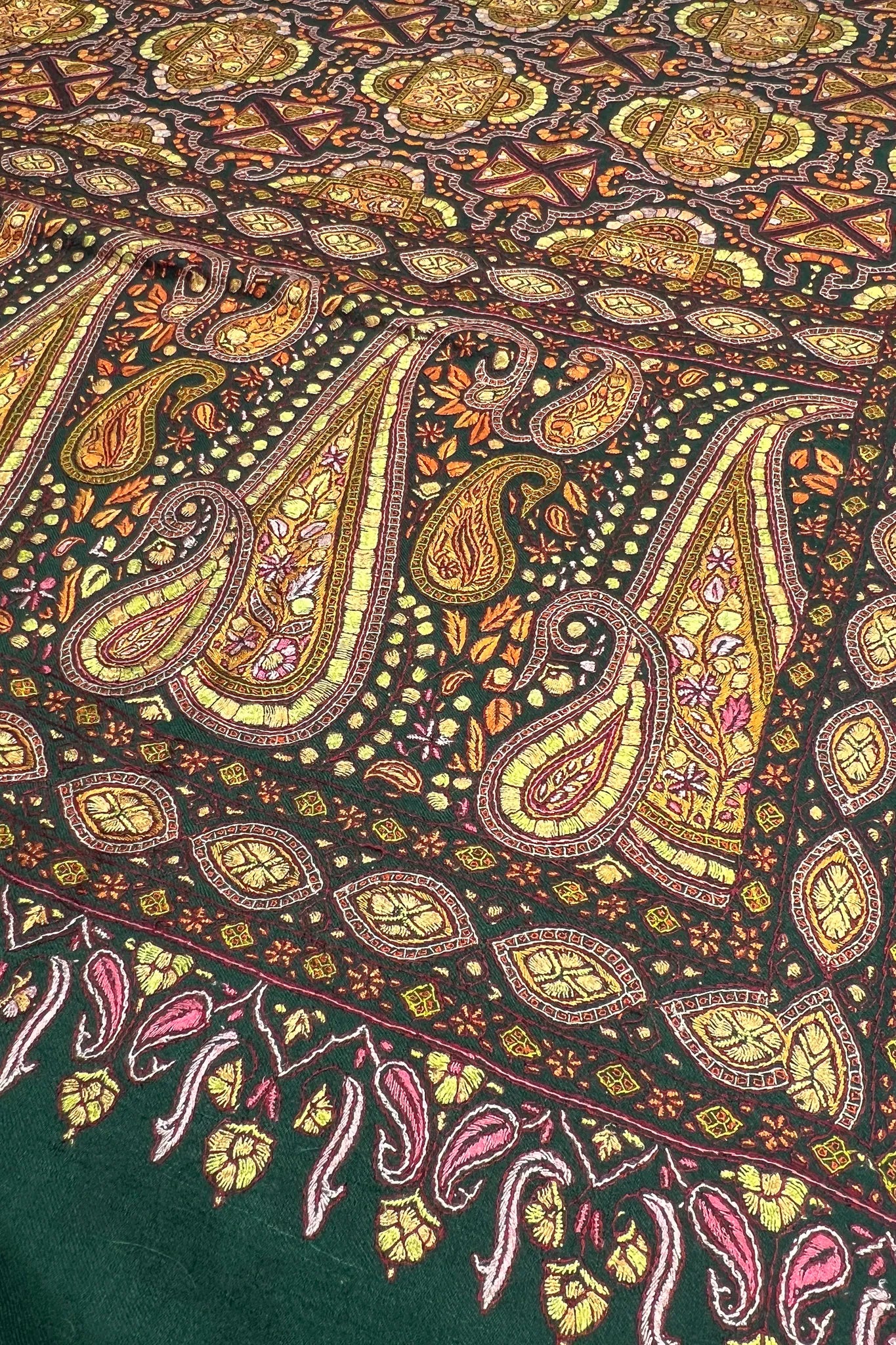 - Bottle Green Pure Pashmina Shawl with All Over Sozni Hand Embroidery