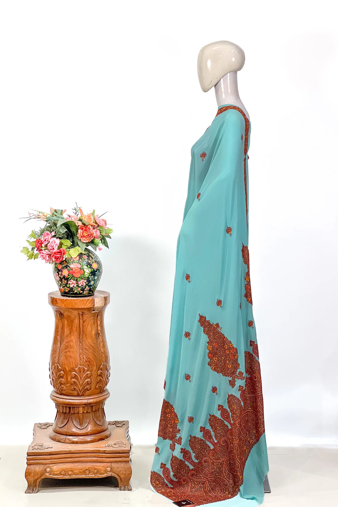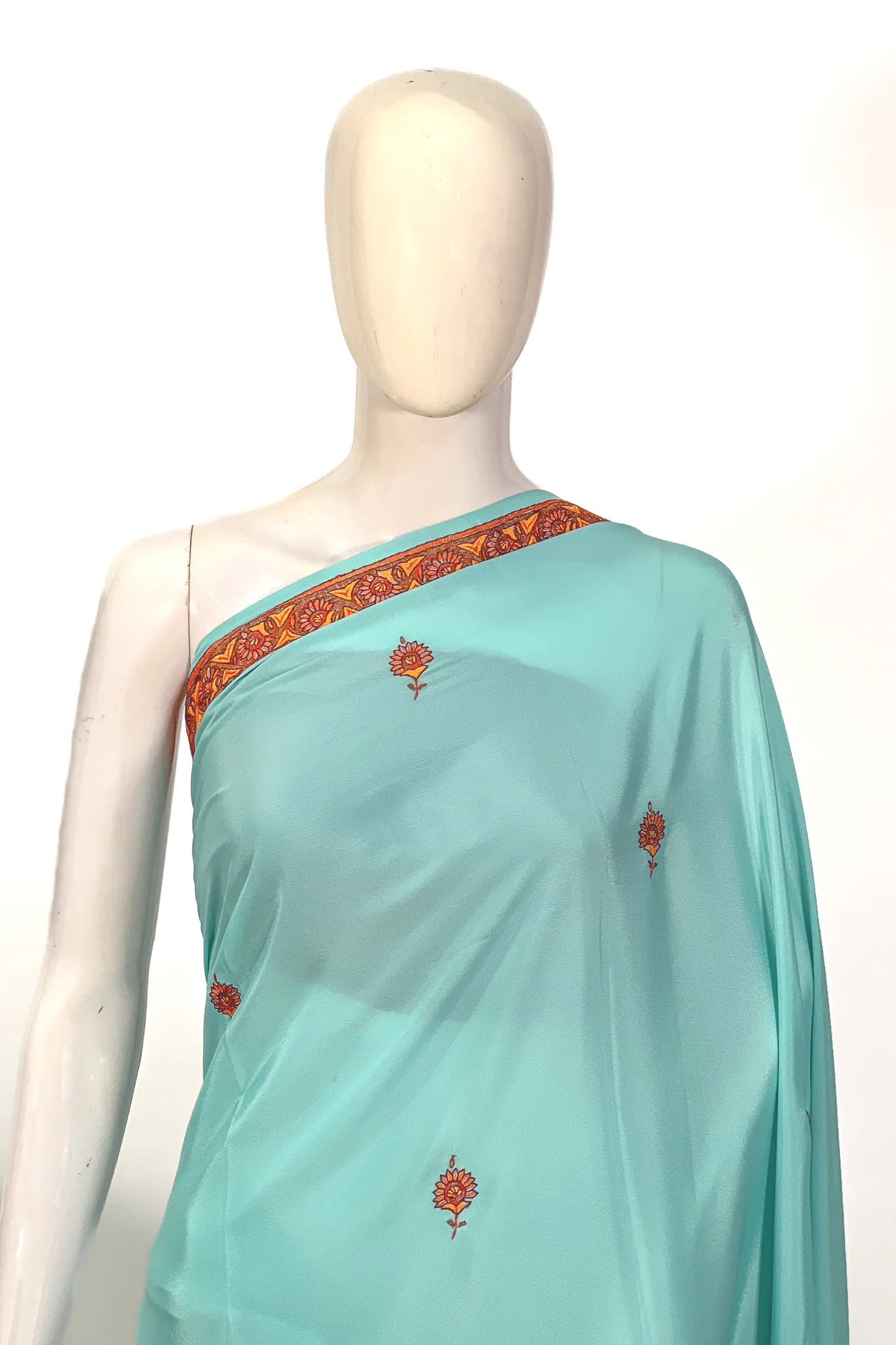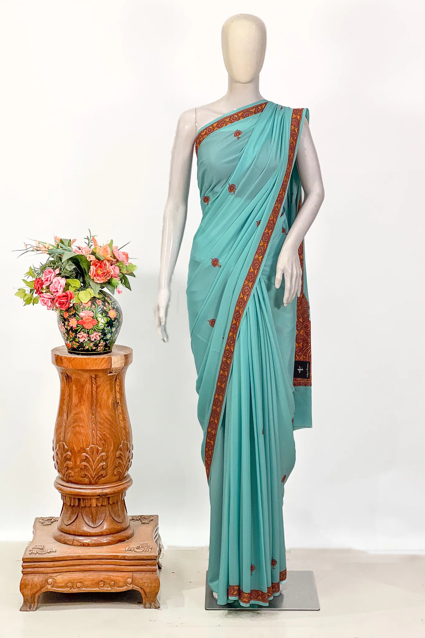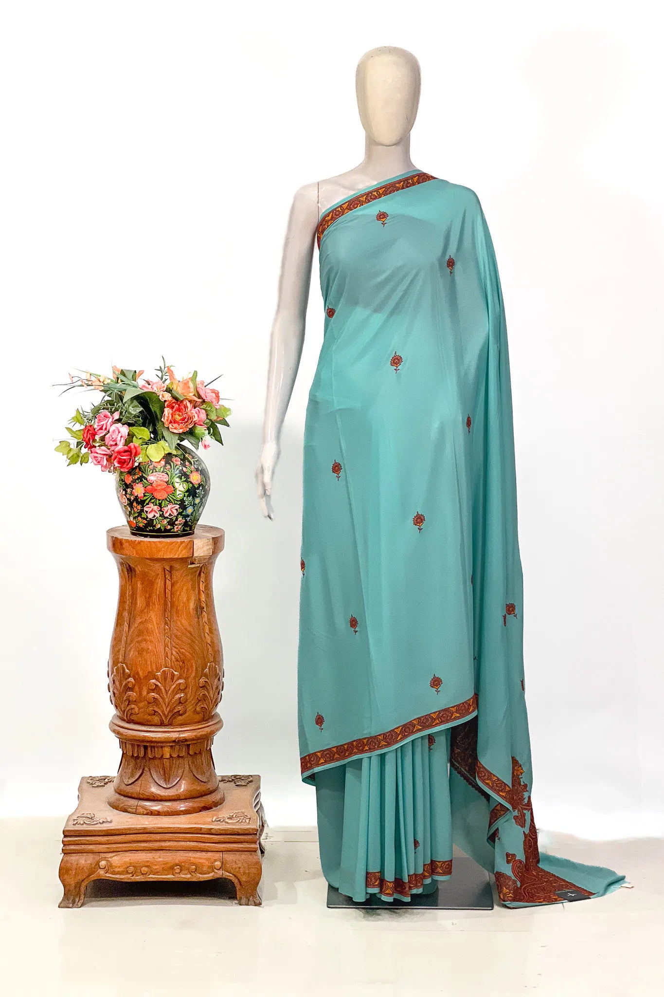 Wearing Ferozah Gulzaar feels like carrying a breeze of calm confidence—elegant, empowered, and deeply connected to Kashmir’s centuries-old artistry. The fluid Indian Crepe drapes with serene ease, while hand-embroidered Sozni motifs bloom softly across the saree in multi-colour needle work, each stitch guided by an artisan’s mastery. Light, versatile, and rich with heritage, this saree blends comfort with timeless appeal for celebrations both intimate and grand. Essential features include authentic Sozni hand embroidery, a fresh ferozi base, and a matching Indian Crepe blouse.