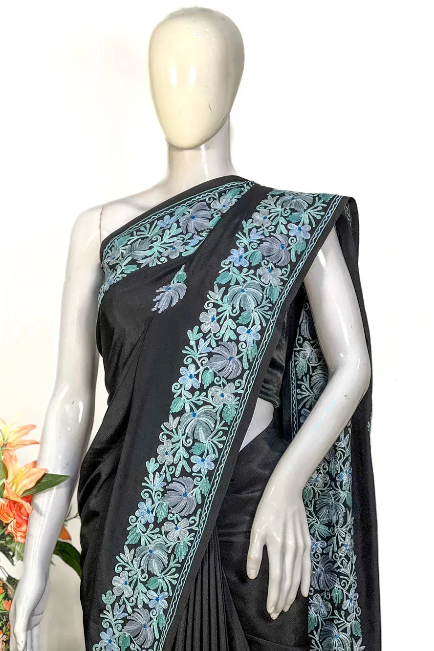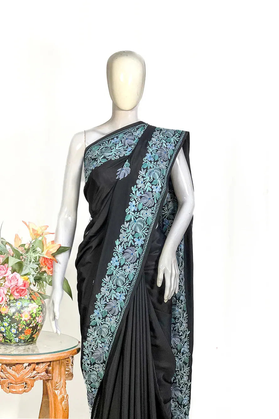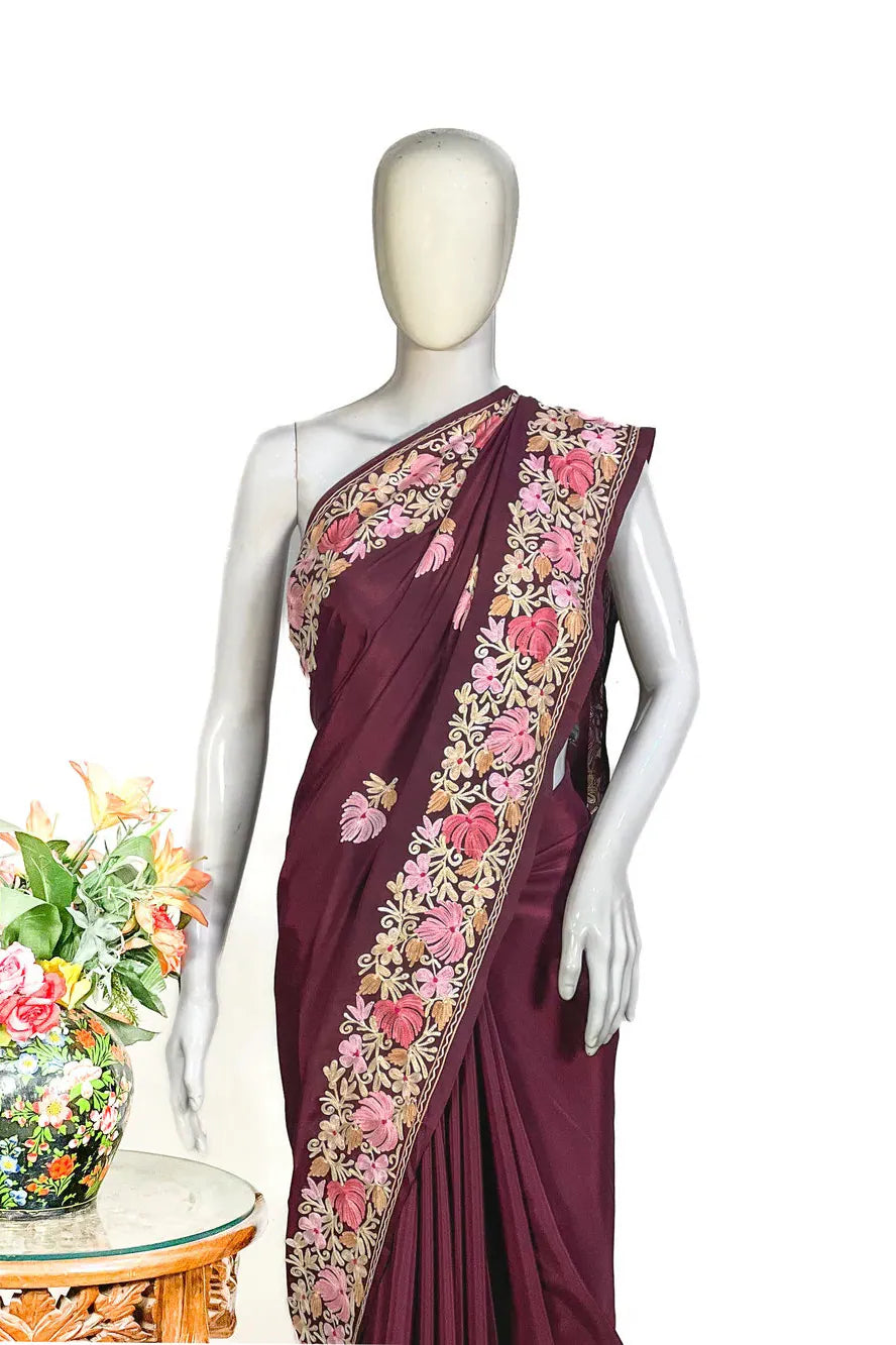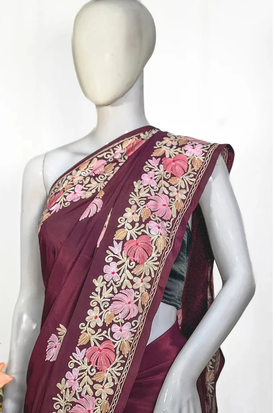Wearing Firozah-e-Noir feels like stepping into refined elegance — poised, confident, and deeply connected to Kashmir’s artistic legacy. The fluid fall of semi-crepe gives a sculpted, flattering drape, while the soothing multi-colour Aari embroidery brings life to the saree base with its delicate craftsmanship. Lightweight, versatile, and timeless, this saree moves effortlessly from intimate celebrations to grand evenings. Essential features include Kashmiri Aari work, a soft semi-crepe saree and blouse fabric, a black/wine/red base enriched with multi-tone embroidery, and a graceful border that frames every drape beautifully.