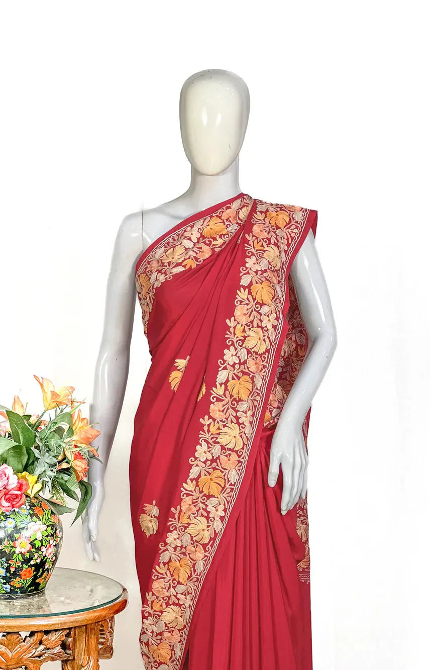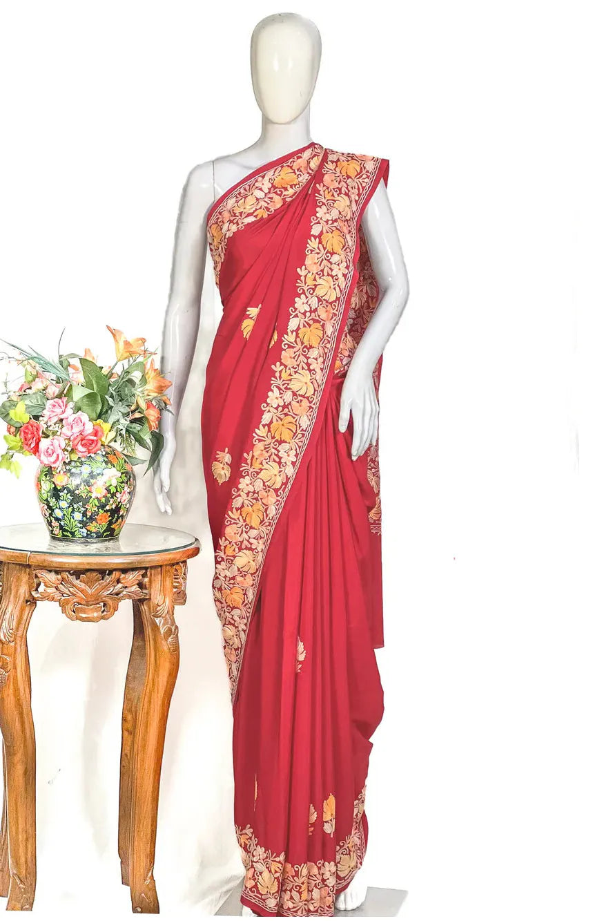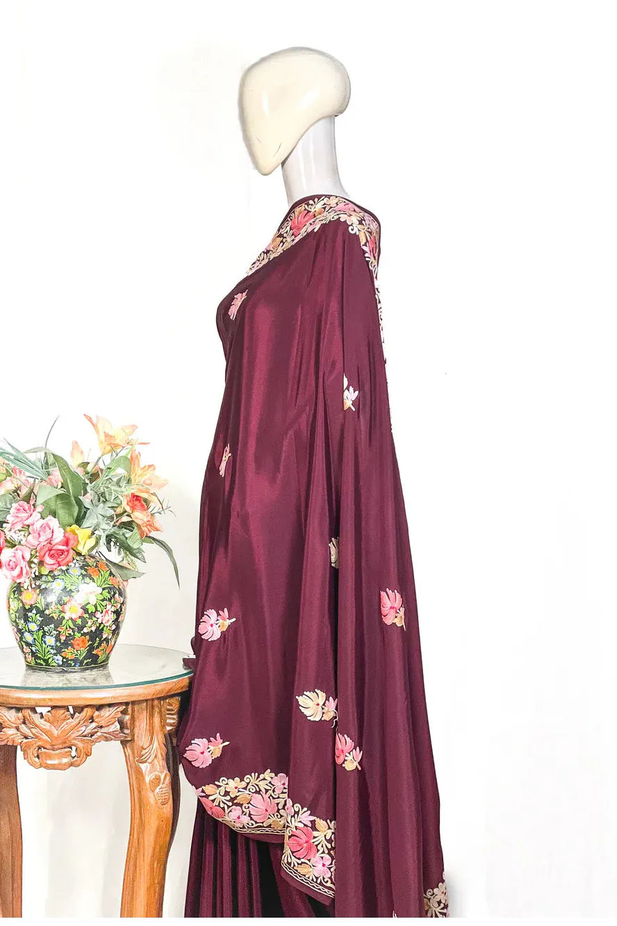 Wearing Firozah-e-Noir feels like stepping into refined elegance — poised, confident, and deeply connected to Kashmir’s artistic legacy. The fluid fall of semi-crepe gives a sculpted, flattering drape, while the soothing multi-colour Aari embroidery brings life to the saree base with its delicate craftsmanship. Lightweight, versatile, and timeless, this saree moves effortlessly from intimate celebrations to grand evenings. Essential features include Kashmiri Aari work, a soft semi-crepe saree and blouse fabric, a black/wine/red base enriched with multi-tone embroidery, and a graceful border that frames every drape beautifully.