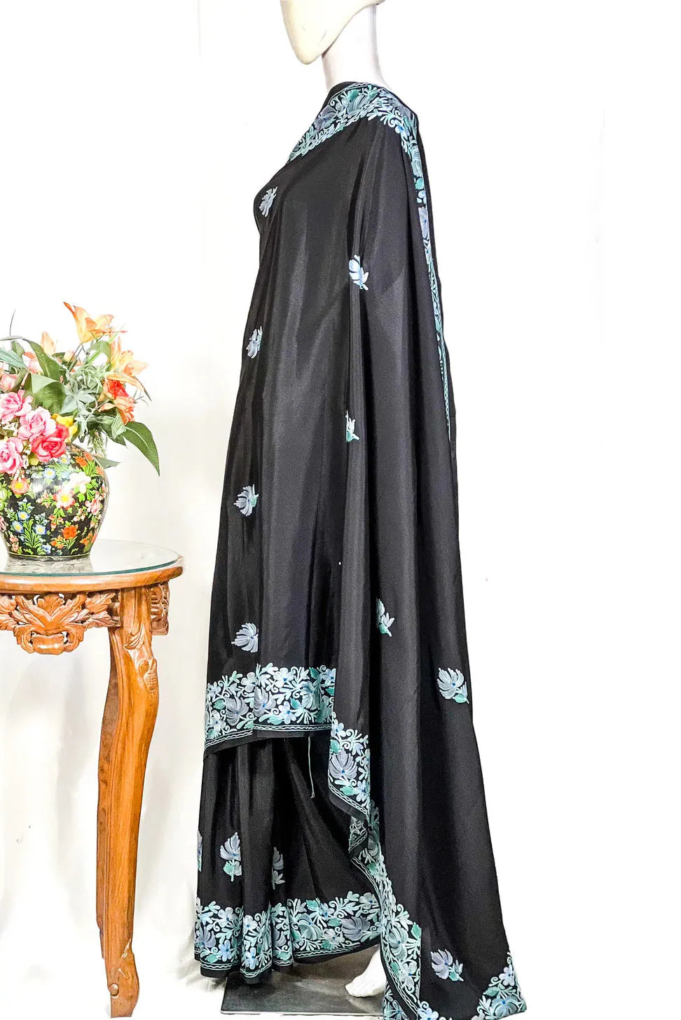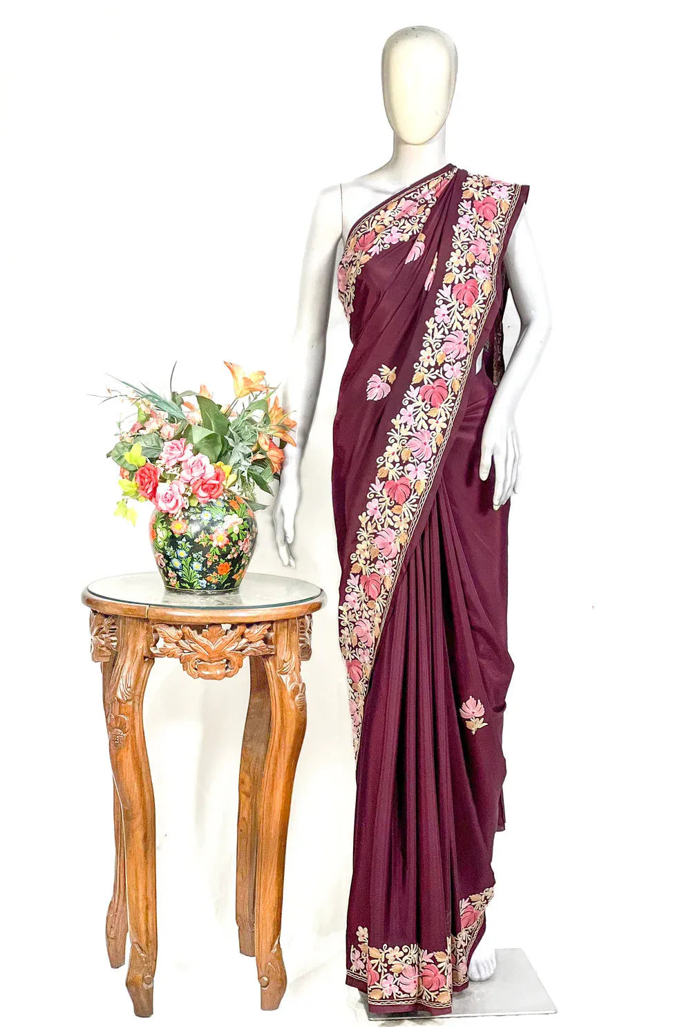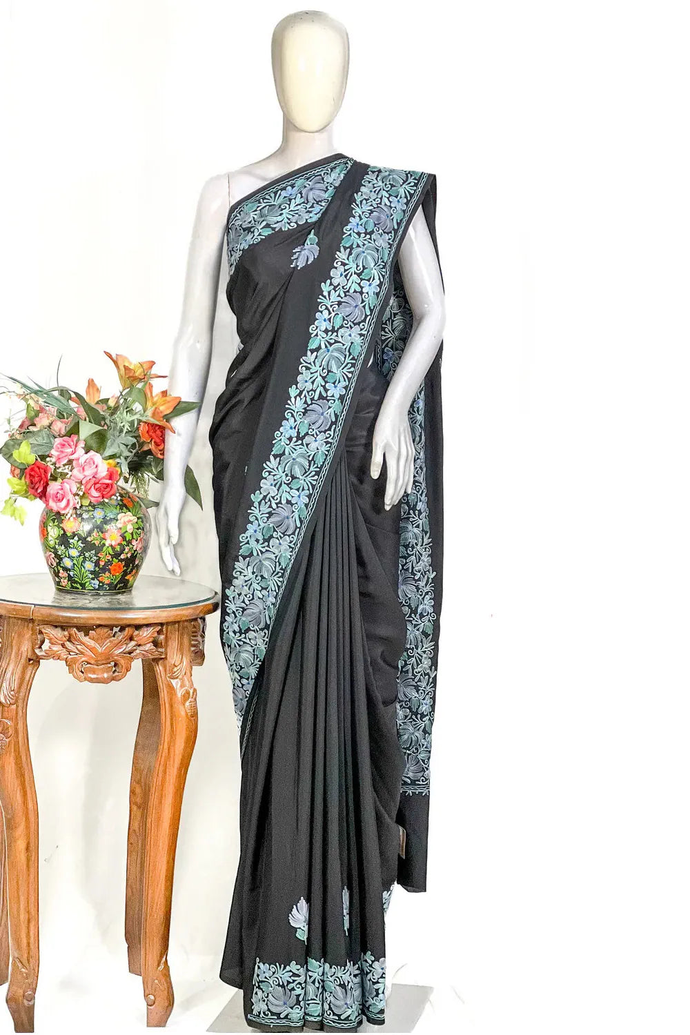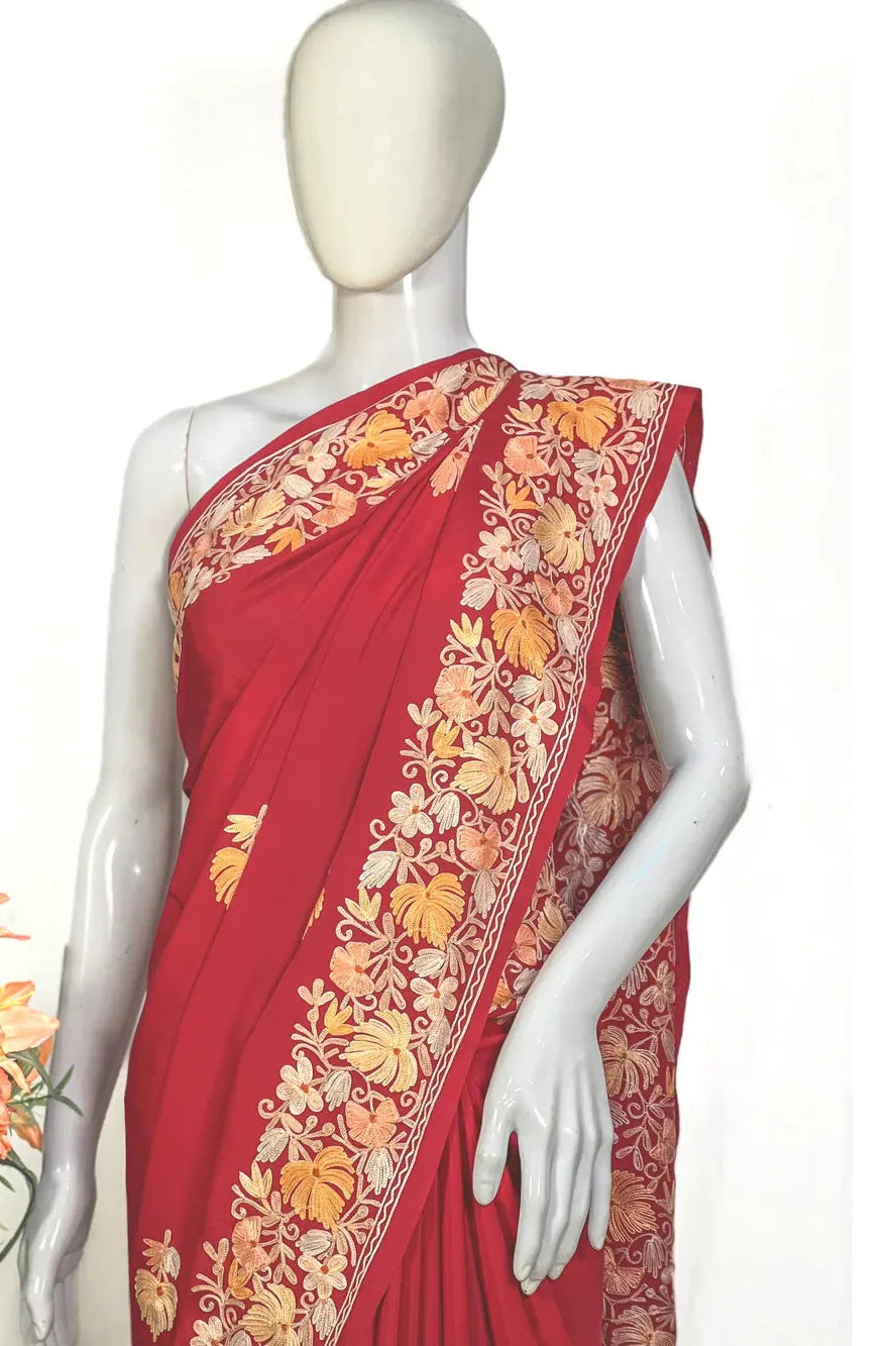 Wearing Firozah-e-Noir feels like stepping into refined elegance — poised, confident, and deeply connected to Kashmir’s artistic legacy. The fluid fall of semi-crepe gives a sculpted, flattering drape, while the soothing multi-colour Aari embroidery brings life to the saree base with its delicate craftsmanship. Lightweight, versatile, and timeless, this saree moves effortlessly from intimate celebrations to grand evenings. Essential features include Kashmiri Aari work, a soft semi-crepe saree and blouse fabric, a black/wine/red base enriched with multi-tone embroidery, and a graceful border that frames every drape beautifully.