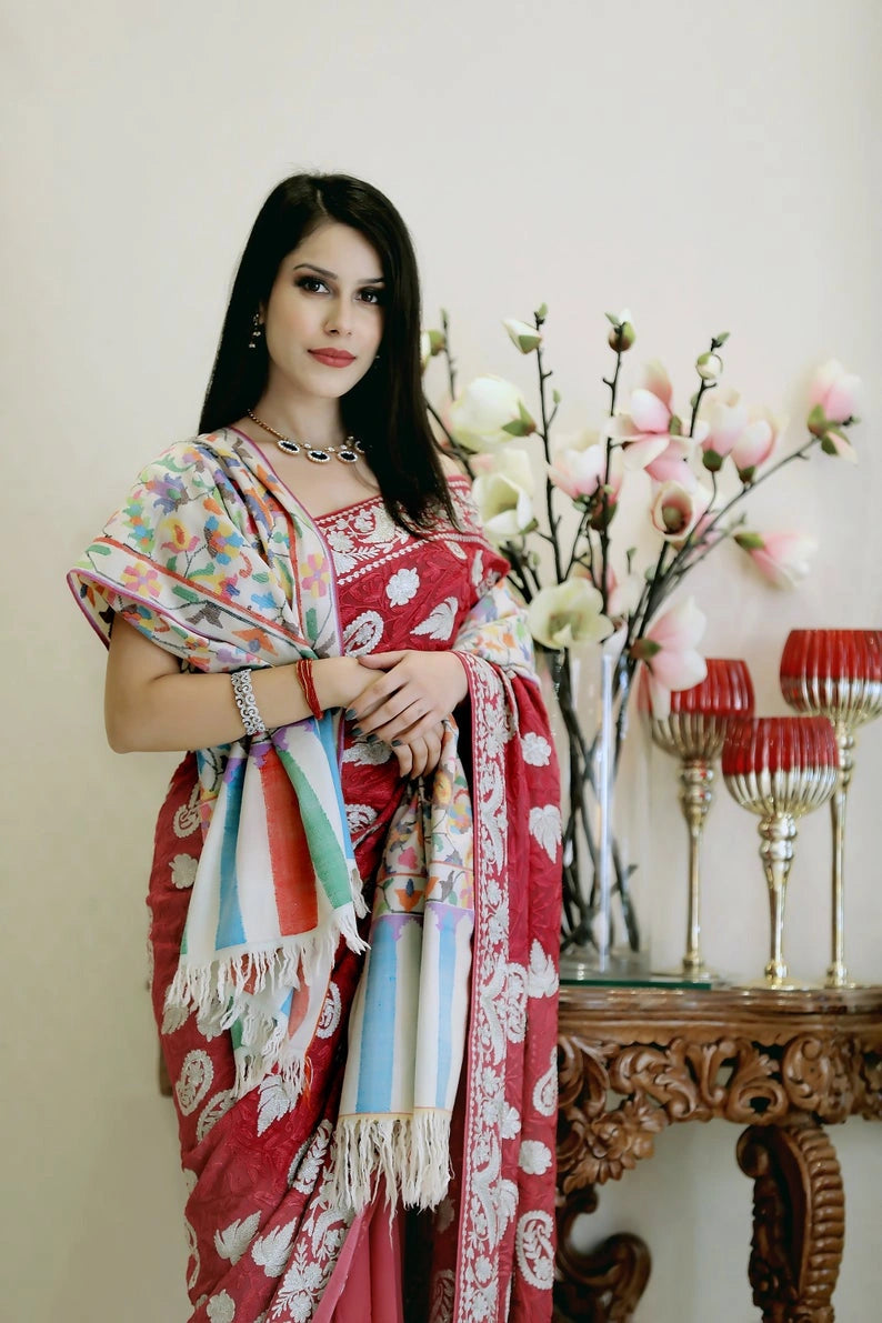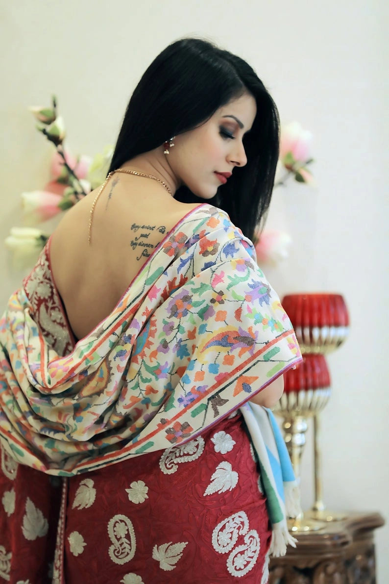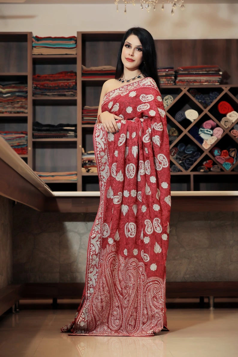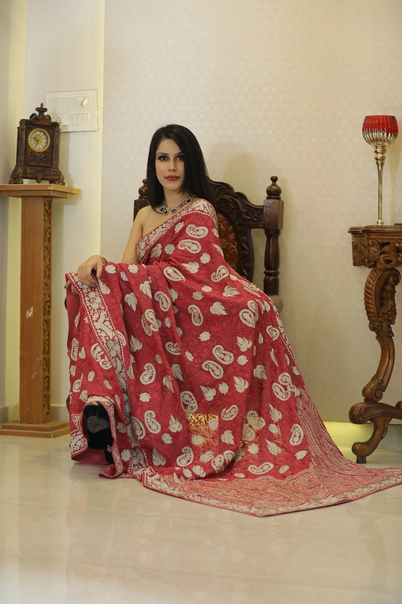 Slip into Gulnaar-e-Zari and feel an instant transformation — poised, powerful, and deeply connected to the centuries-old artistry of Kashmir. Its Viscose Georgette drape moves with feather-light ease, while the all-over self Aari and dull-gold Tilla embroidery creates a rich tapestry of texture and tradition. Crafted with remarkable precision, this saree balances comfort with couture-like detail, making it timeless for weddings, soirées, and cherished celebrations. Essential features include all-over Kashmiri Aari and Tilla fusion embroidery, a soft georgette drape, and a coordinating Indian Crepe blouse fabric.