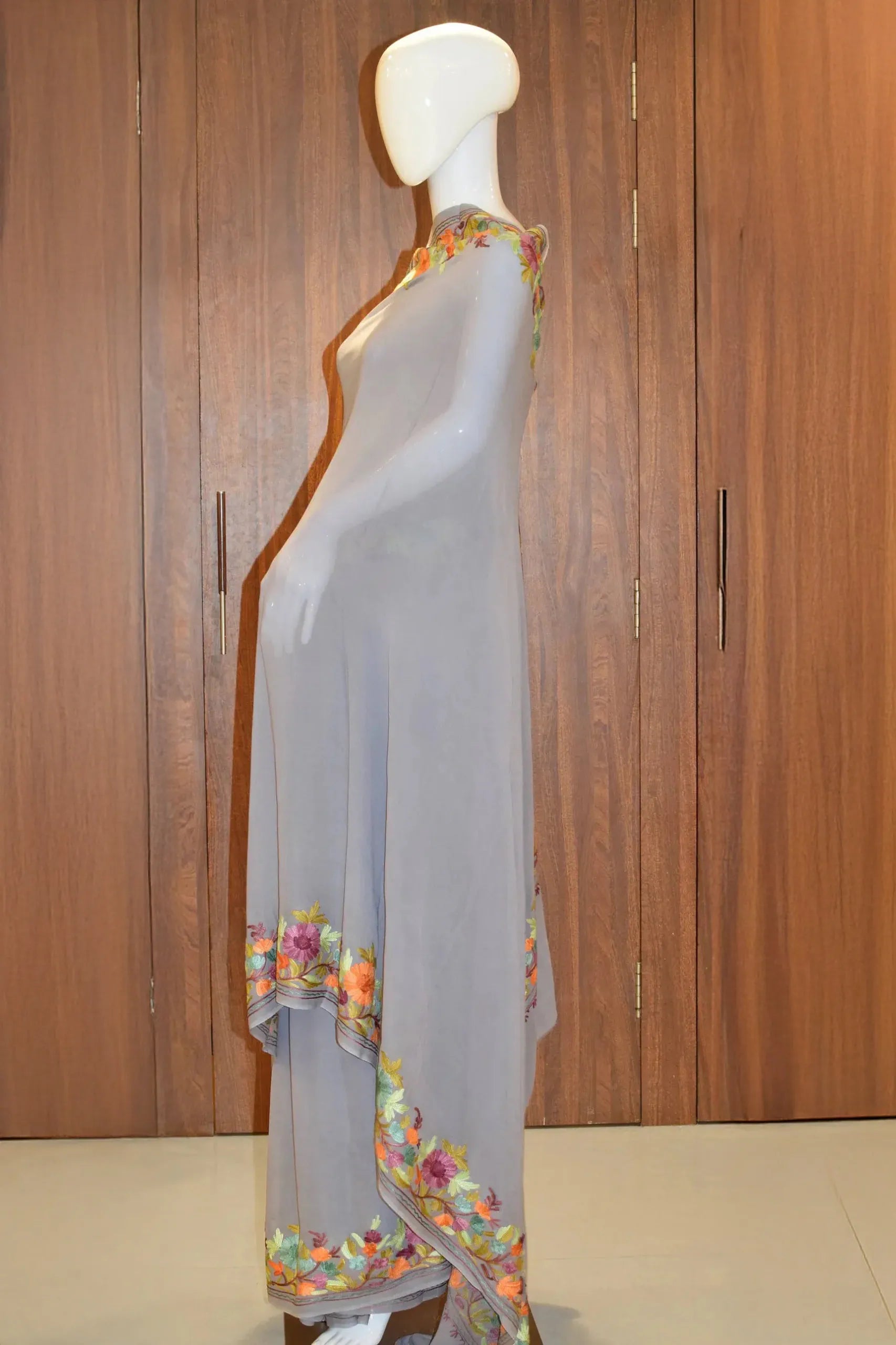 Draping Gulrez-e-Shehnai feels like stepping into a world of quiet elegance — where you move with confidence, softness, and a deep sense of connection to Kashmir’s artisanal heritage. The fluid Viscose Georgette falls effortlessly, offering comfort for long celebrations, while the Aari embroidery blooms in vibrant colours along the border, turning every pleat into a work of art. Timeless yet versatile, this saree transitions seamlessly from intimate gatherings to festive occasions. Essential features include multi-colour Kashmiri Aari embroidery, a breathable georgette drape, and a matching Indian Crepe blouse fabric.