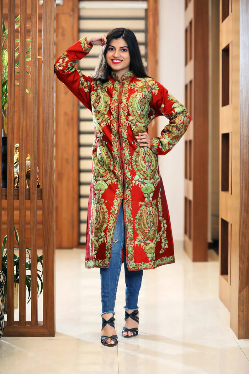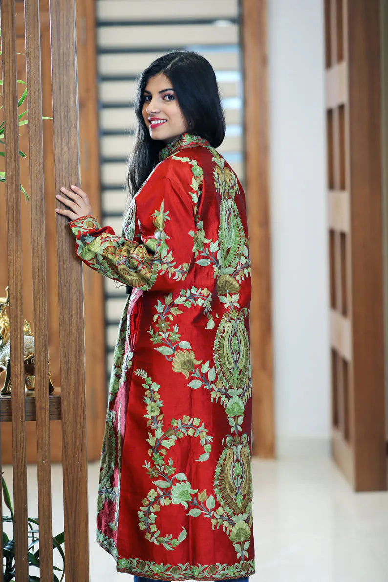 Worn, it feels celebratory without insistence. The length gives it presence, the lining adds comfort, and the embroidery softens as the body moves. It holds warmth gently, the way a well loved shawl does, while still feeling composed and assured. This is a garment that belongs to laughter in hallways, to conversations that stretch, to moments that feel personal rather than planned.