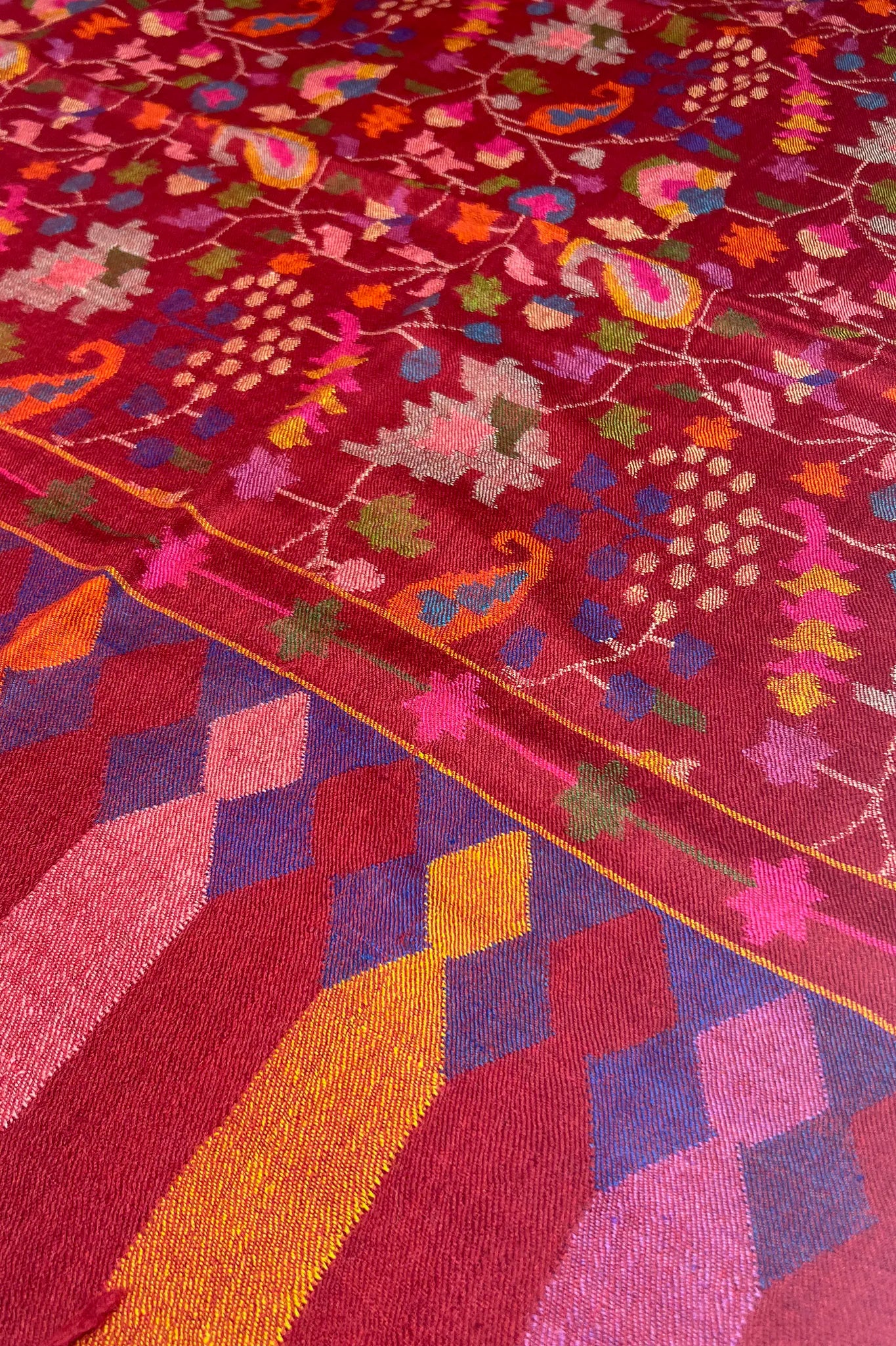A Shawl is the most beautiful thing ever invented to wear. A versatile piece of art with alluring embroidery. This Maroon Kani Pure Pashmina Shawl featuring floral motifs will embrace your beauty in every way, as Kashmiri Shawls are highly praised for their Fine Pashmina Wool, Skilled Weaving, and Embroidery by Master Craftsmen of Kashmir.