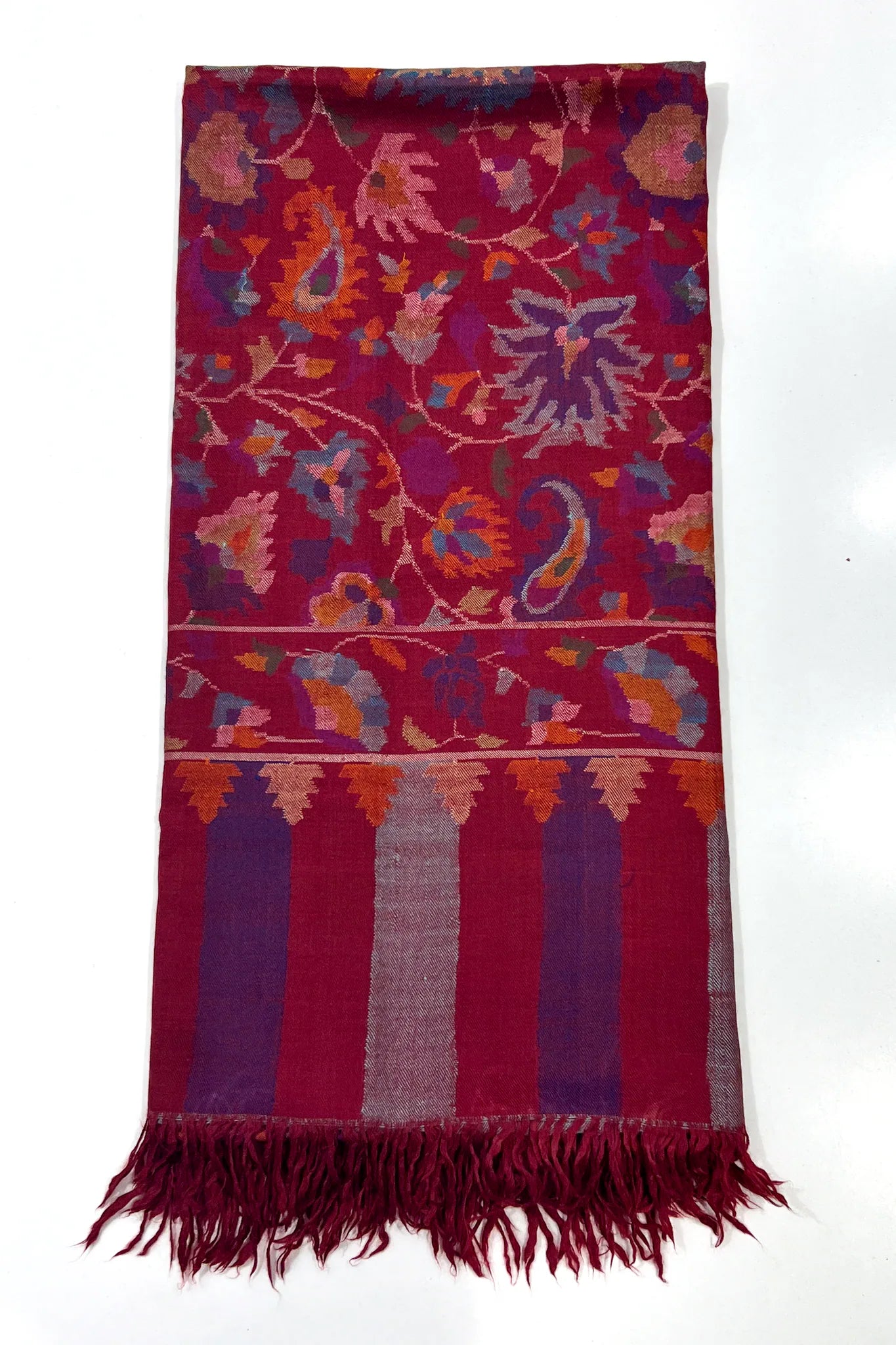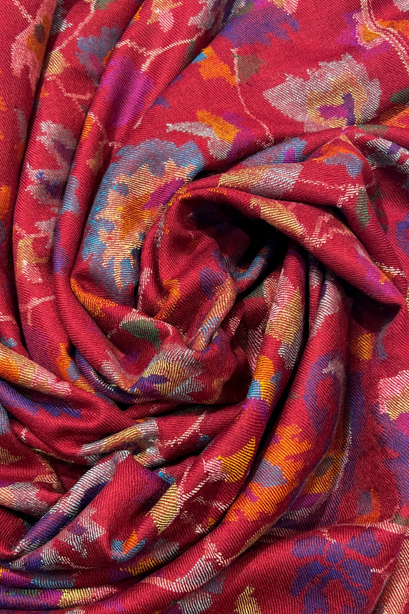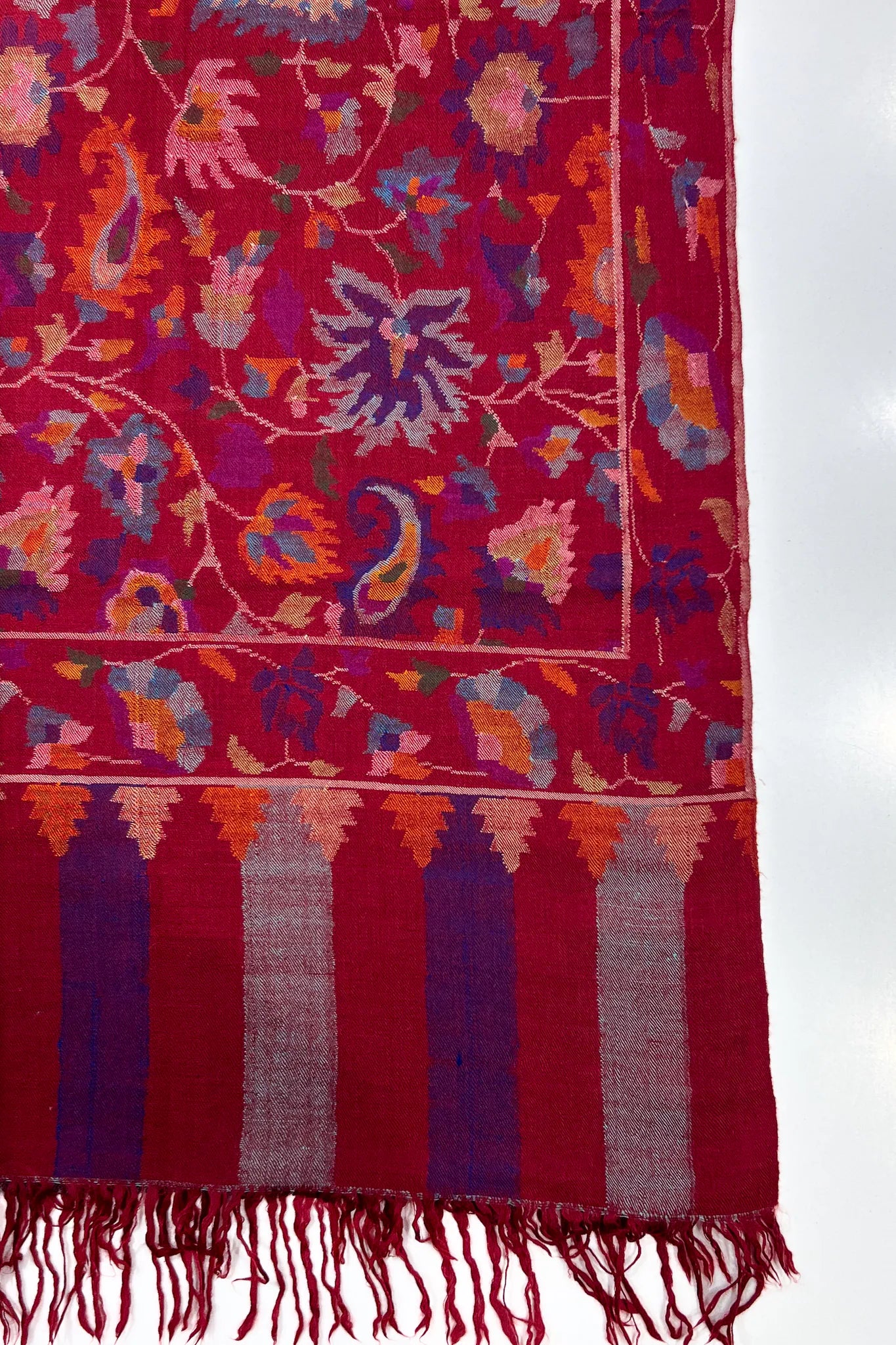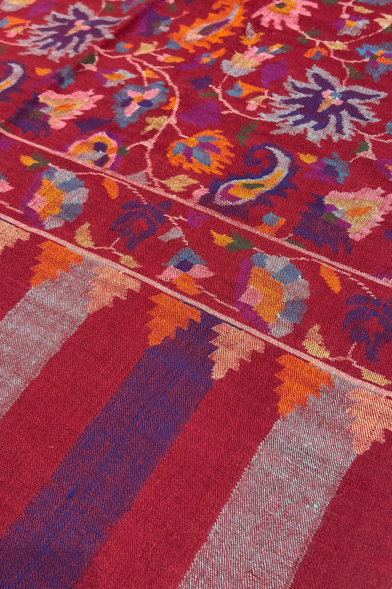 Mereth carries the warmth of maroon that feels settled and assured, like rooms lit before evening arrives. The colour holds depth rather than shine, allowing the kani patterns to move across the surface with an unhurried grace. Paisleys bloom and recede in layers of saffron, indigo, muted blue, and soft rose, creating a surface that feels full yet composed.