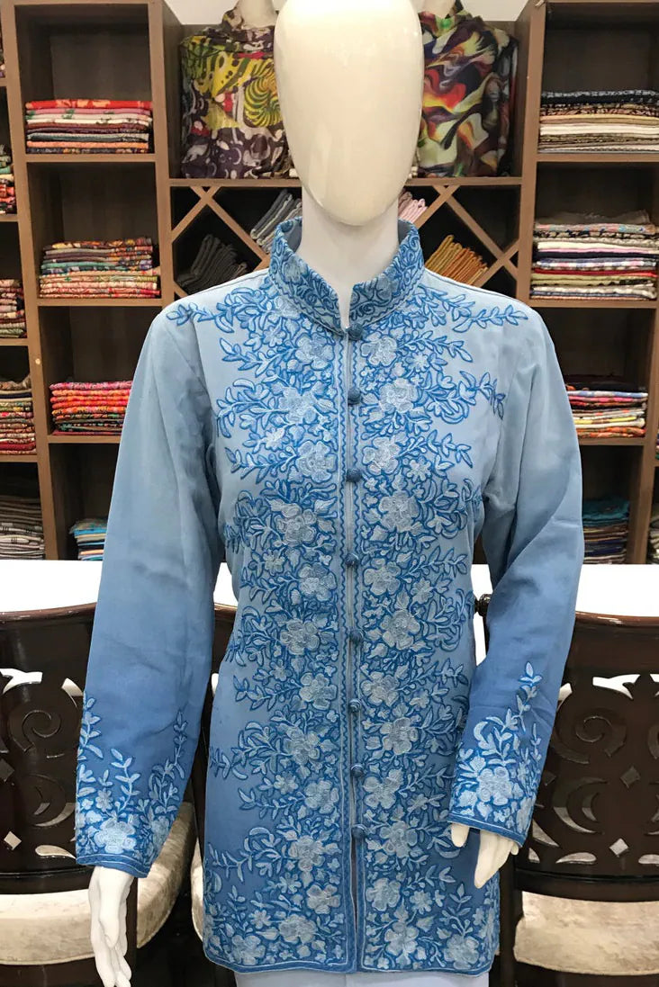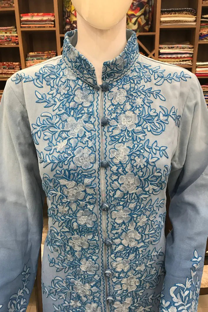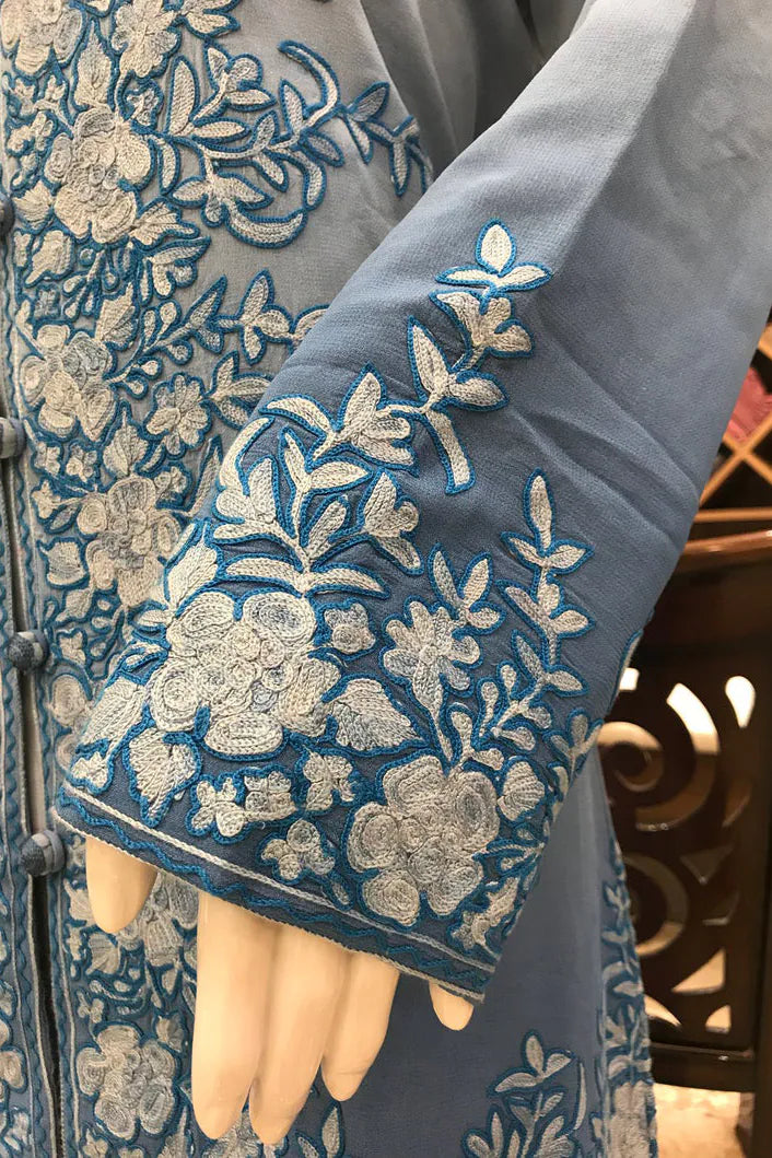 Neela feels like quiet morning light. The blue moves gently from soft to deeper tones, the way sky changes without being noticed. The embroidery rests calmly across the surface, grey softened with blue, as if it has been there long enough to settle. When you touch it, the fabric feels cool and fluid, carrying a sense of ease rather than weight.