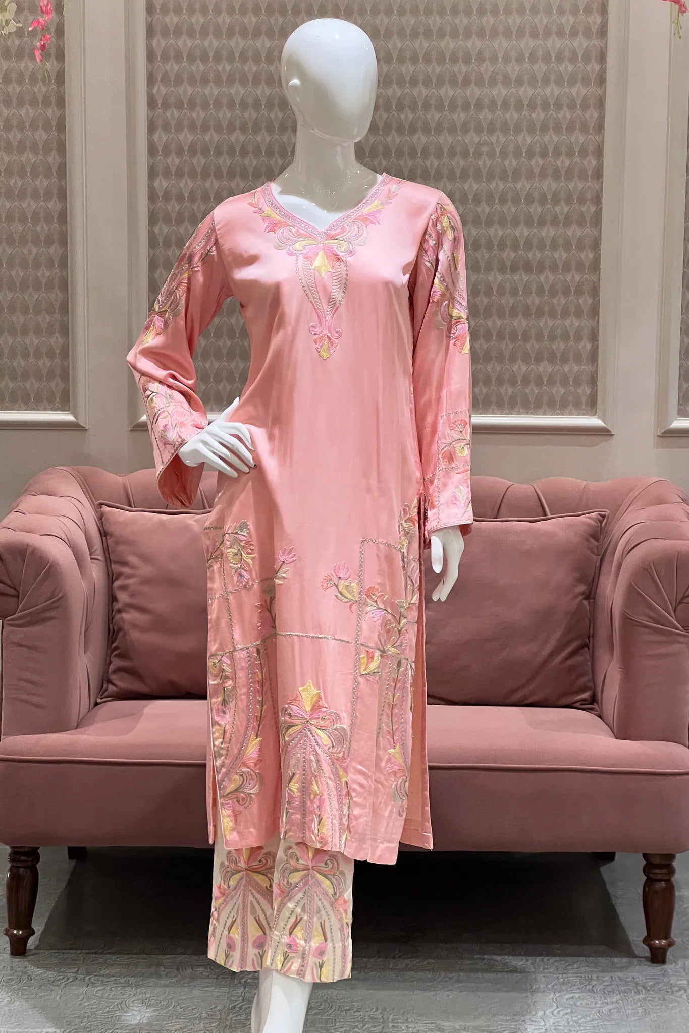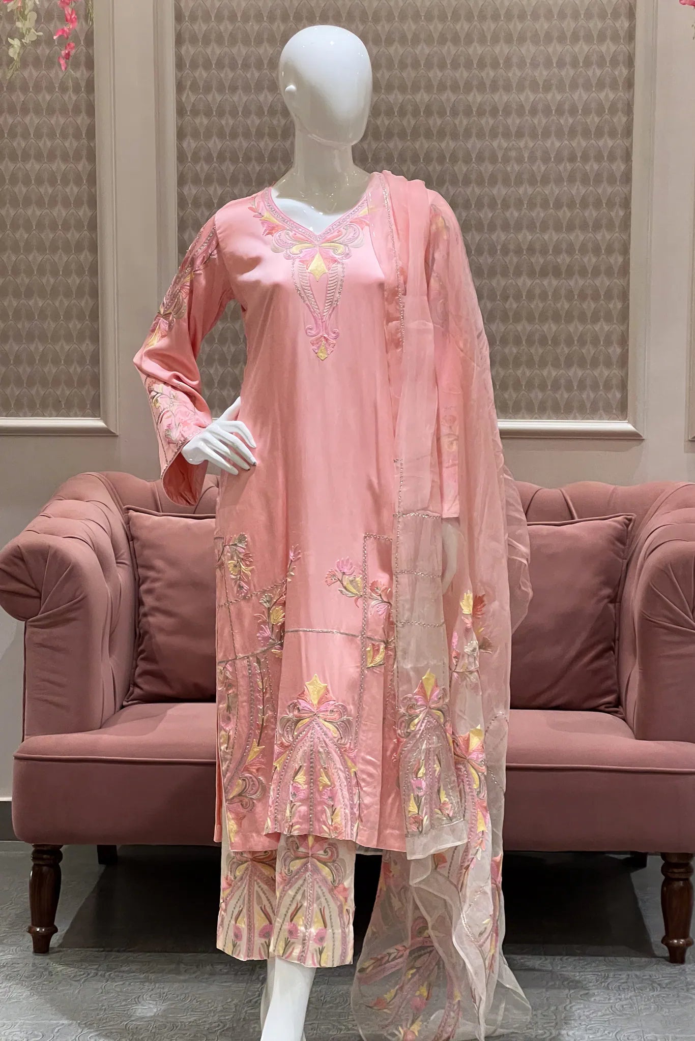 Design Features: This Cotton Satin Shirt Pant set evokes poise with its sophisticated sky blue hue, elevated by exquisite thread & tilla embroidery. The serene canvas is elegantly paired with a pure Organza dupatta that showcases delicately worked floral patterns.