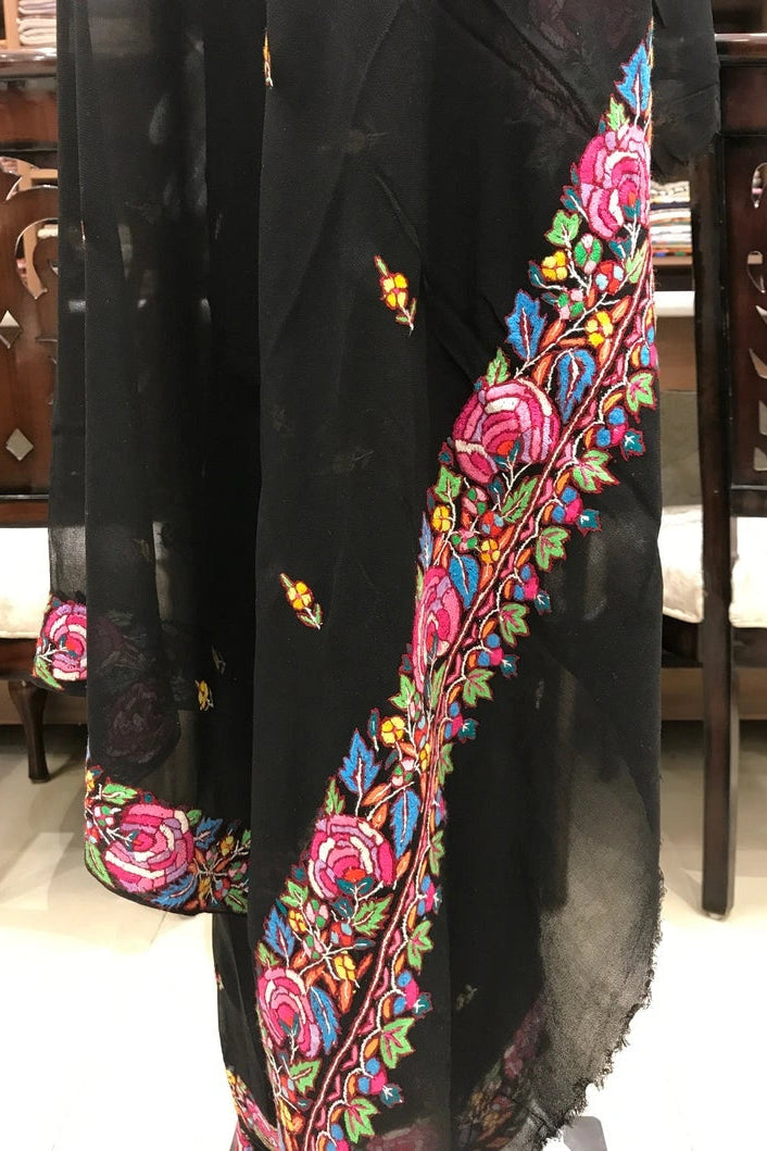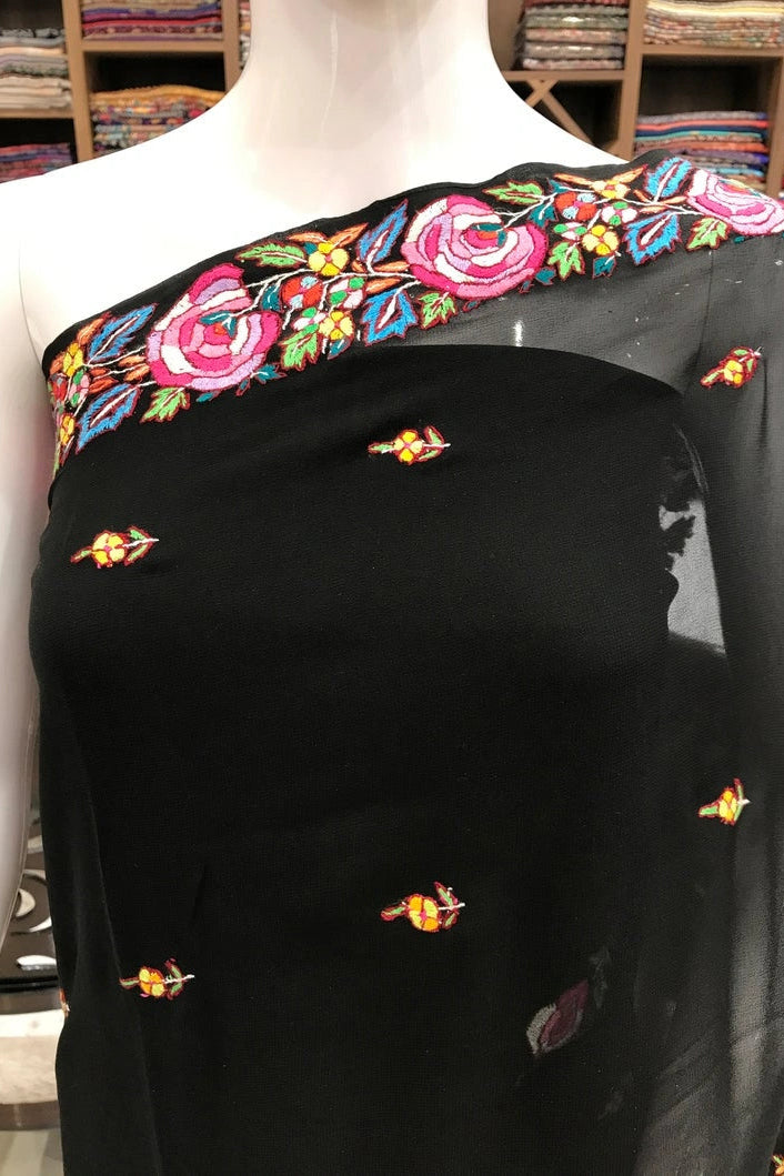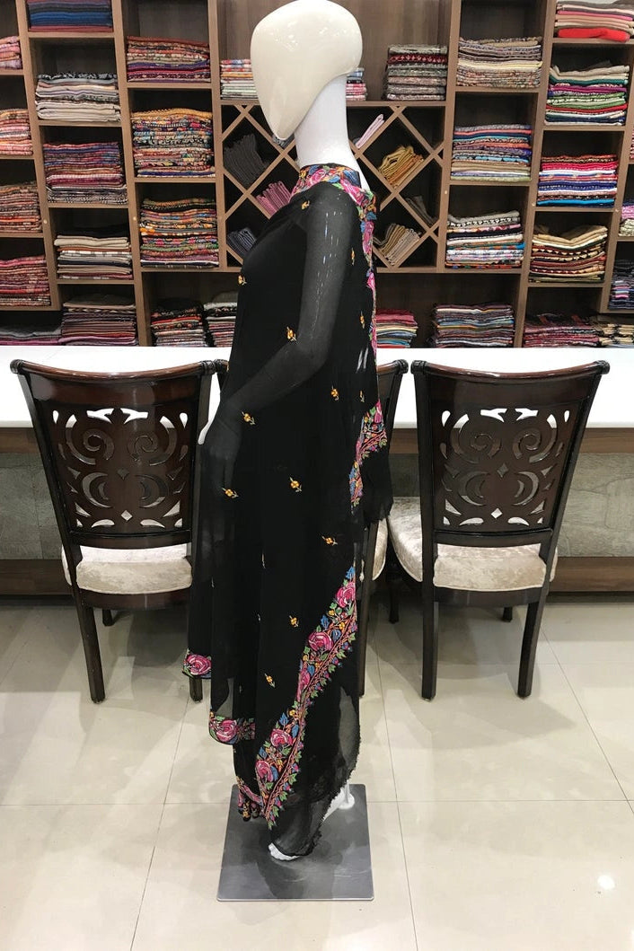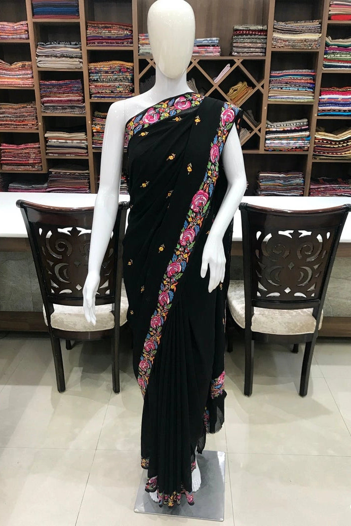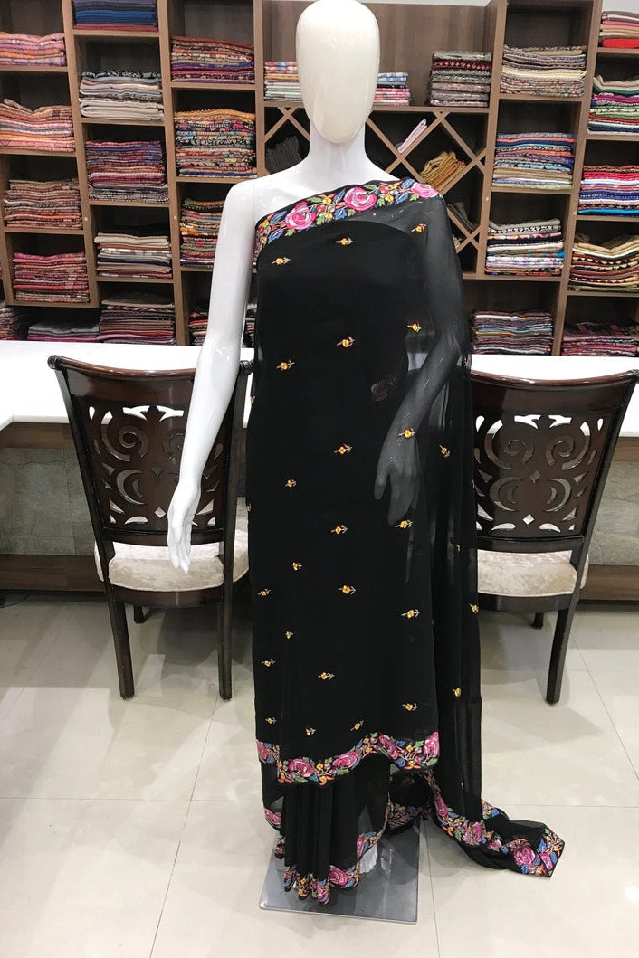 Wearing Noor-e-Gulaab Noir feels like stepping into quiet, confident beauty—elegant, empowered, and deeply connected to Kashmir’s storied craft traditions. The soft Viscose Georgette drapes effortlessly, offering comfort that lasts through long celebrations, while the hand-embroidered Papier Mache motifs bloom in multi-coloured vibrance across the saree and borders. A blend of artisanal detail, timeless wearability, and cultural heritage, this saree becomes a piece of legacy rather than fashion alone. Essential features include authentic hand-done Papier Mache embroidery, a fluid black georgette base, and a matching Viscose Crepe blouse fabric.