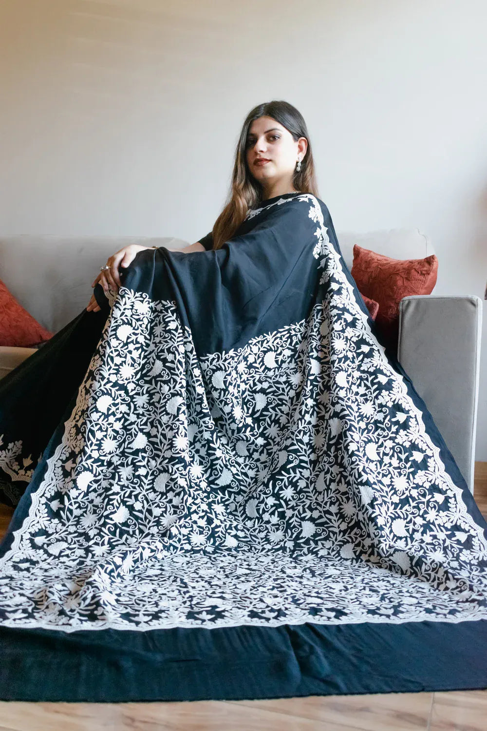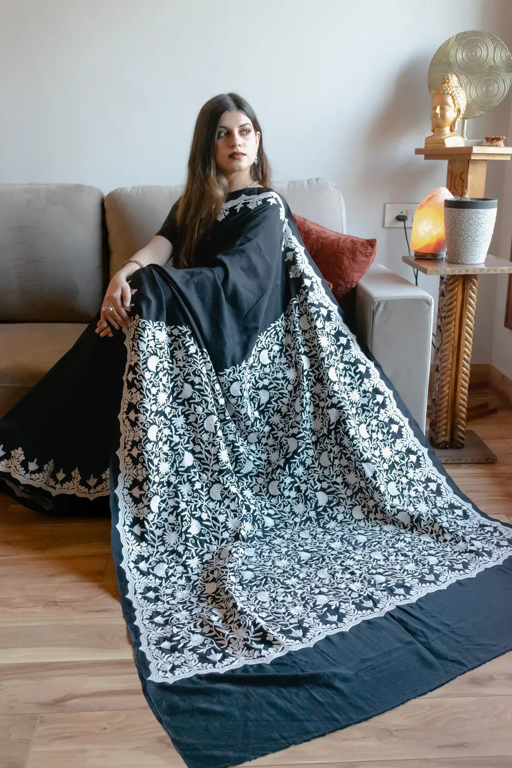 Wearing Zyva brings a composed confidence and understated sophistication, allowing you to feel connected to Kashmiri artistry while expressing a modern sensibility. Crafted in crеpе silk, the sarее drapes with fluid softness, offering comfort and a graceful fall through long hours of wear. Intricatе Kashmiri aari work in soft ivory tones unfolds across a rich black base, celebrating patient craftsmanship and timeless tradition. Balanced and versatile, Zyva moves effortlessly from cultural gatherings to elegant evenings and pairs with a matching crеpе silk blouse for a refined, cohesive look.