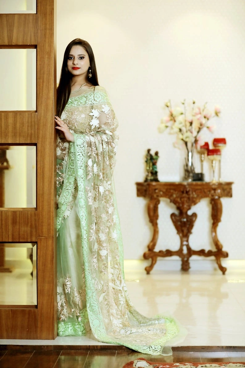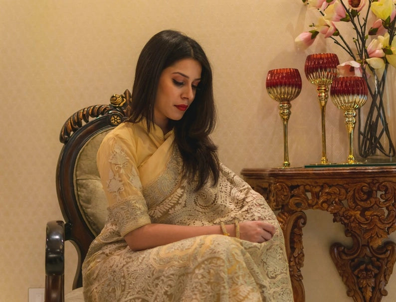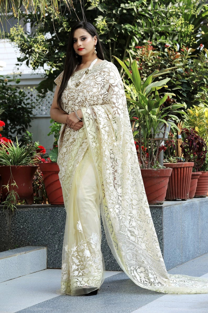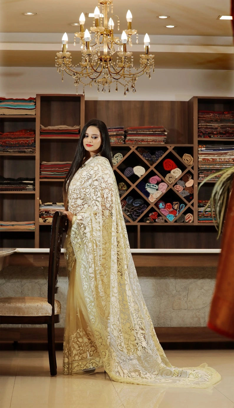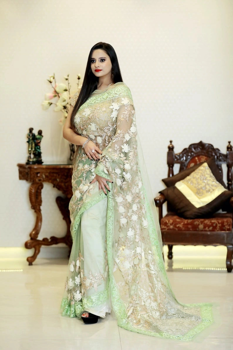 Wearing Noor-e-Waris feels like stepping into a world where elegance becomes lineage—empowering you with the soft radiance of heritage and the quiet confidence of artisanal luxury. The airy net drape flows with feather-light grace, while detailed Aari and Tilla fusion embroidery—crafted on traditional manual machines—glimmers in white, gold, and pastel hues. Created with comfort, craftsmanship, and timeless appeal in mind, this saree transitions effortlessly from intimate rituals to grand celebrations. Essential features include pastel multi-colour and gold-toned embroidery, a choice of fawn/grey/green/light yellow base, and a matching net blouse.