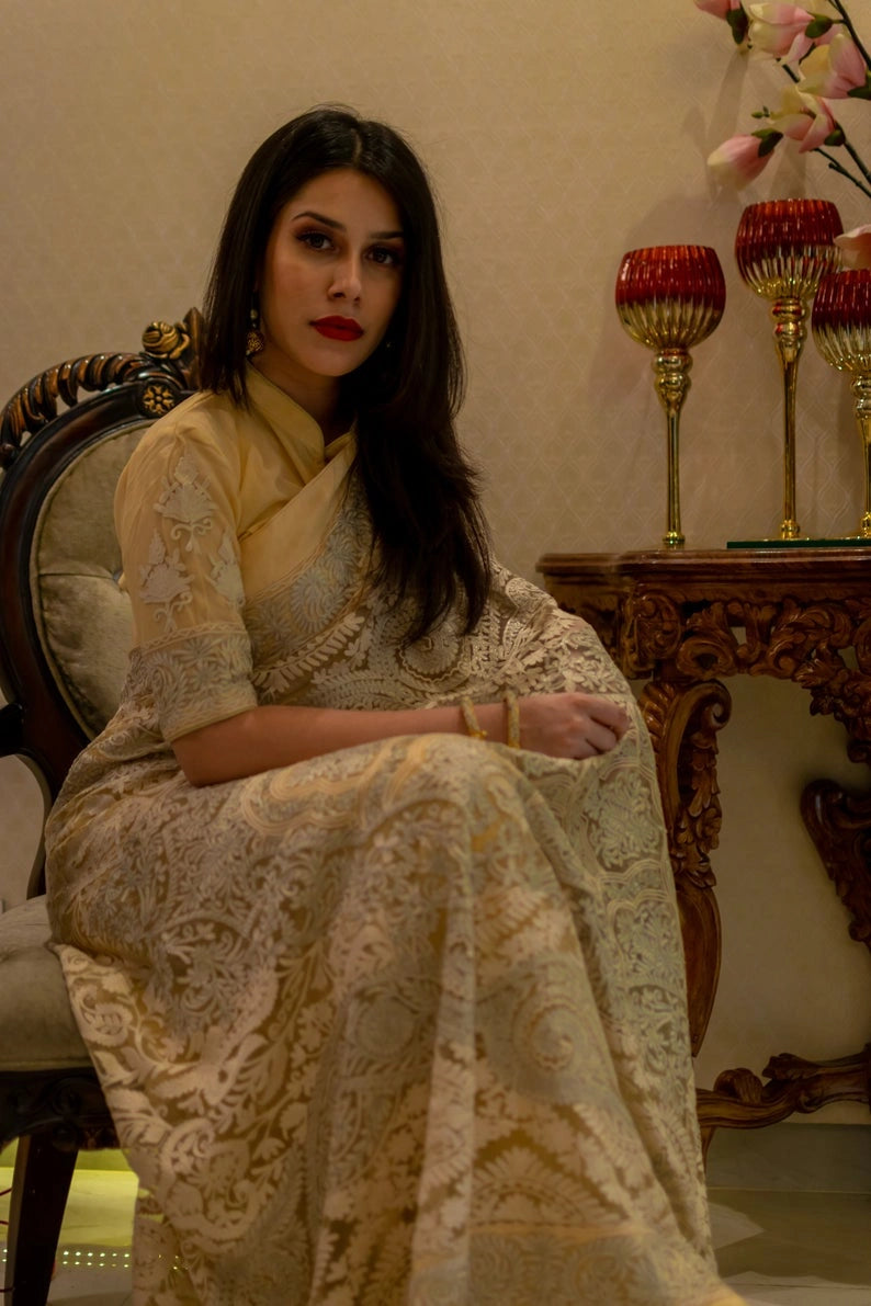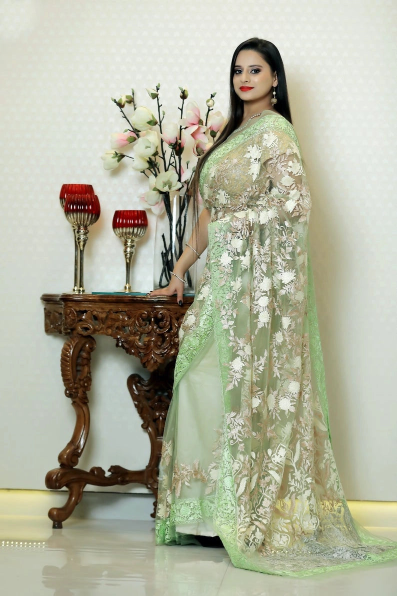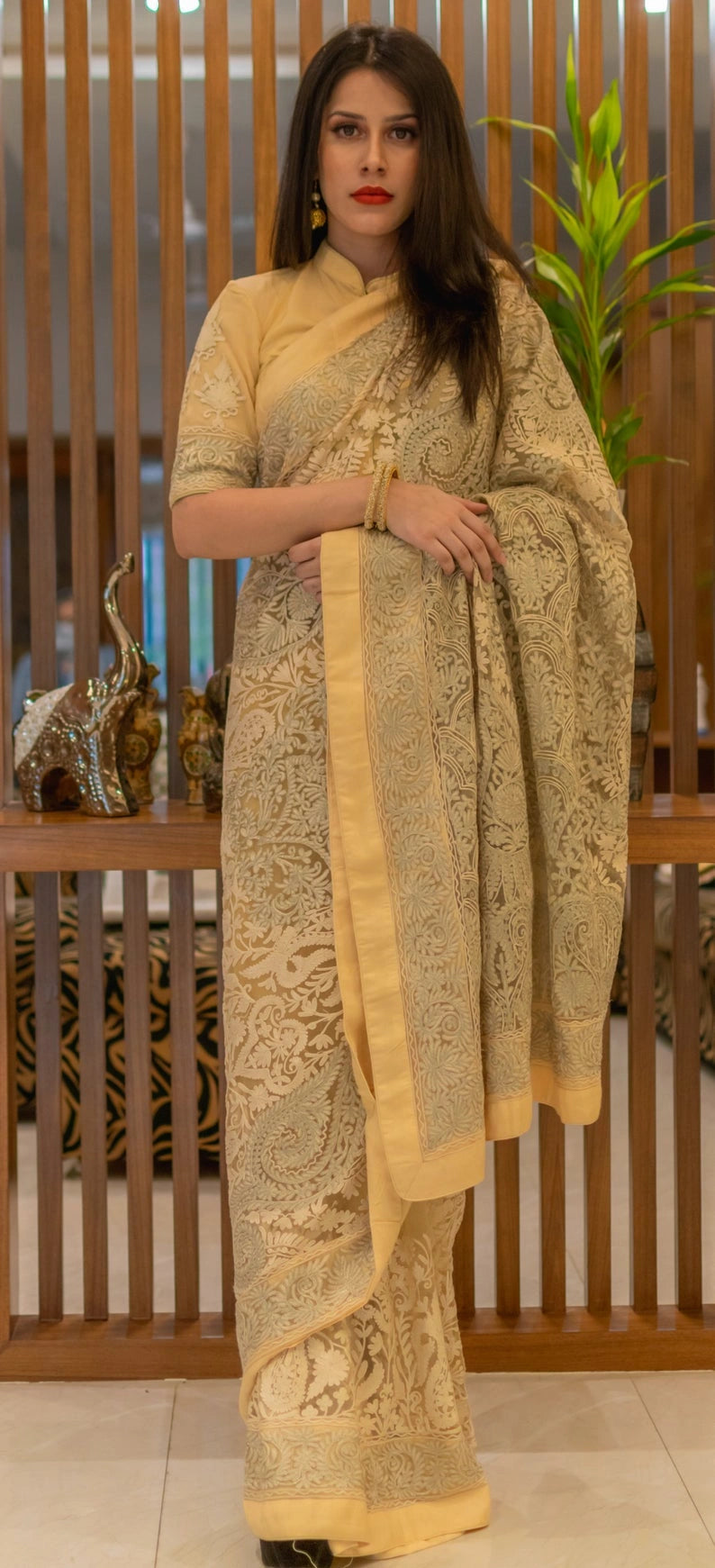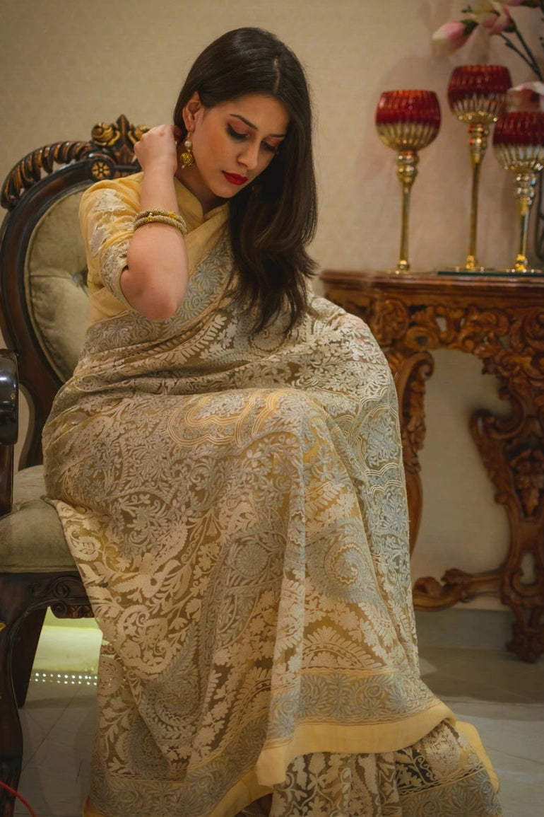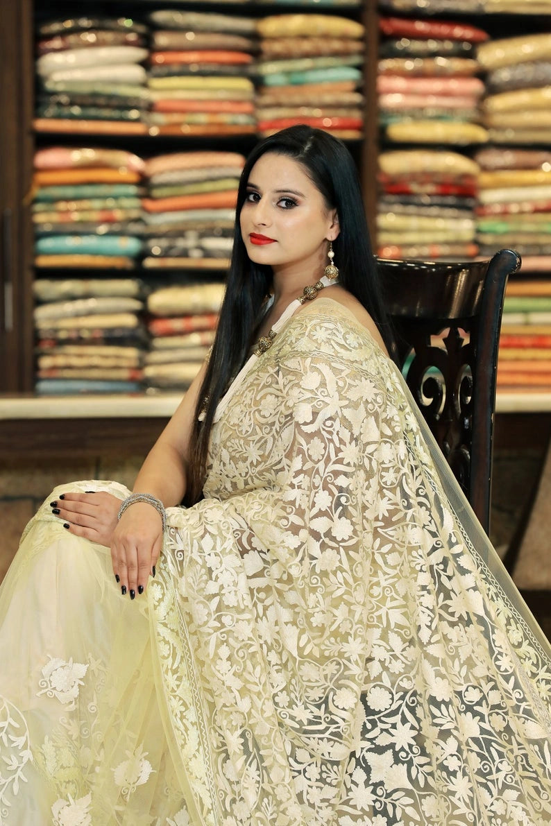 Wearing Noor-e-Waris feels like stepping into a world where elegance becomes lineage—empowering you with the soft radiance of heritage and the quiet confidence of artisanal luxury. The airy net drape flows with feather-light grace, while detailed Aari and Tilla fusion embroidery—crafted on traditional manual machines—glimmers in white, gold, and pastel hues. Created with comfort, craftsmanship, and timeless appeal in mind, this saree transitions effortlessly from intimate rituals to grand celebrations. Essential features include pastel multi-colour and gold-toned embroidery, a choice of fawn/grey/green/light yellow base, and a matching net blouse.