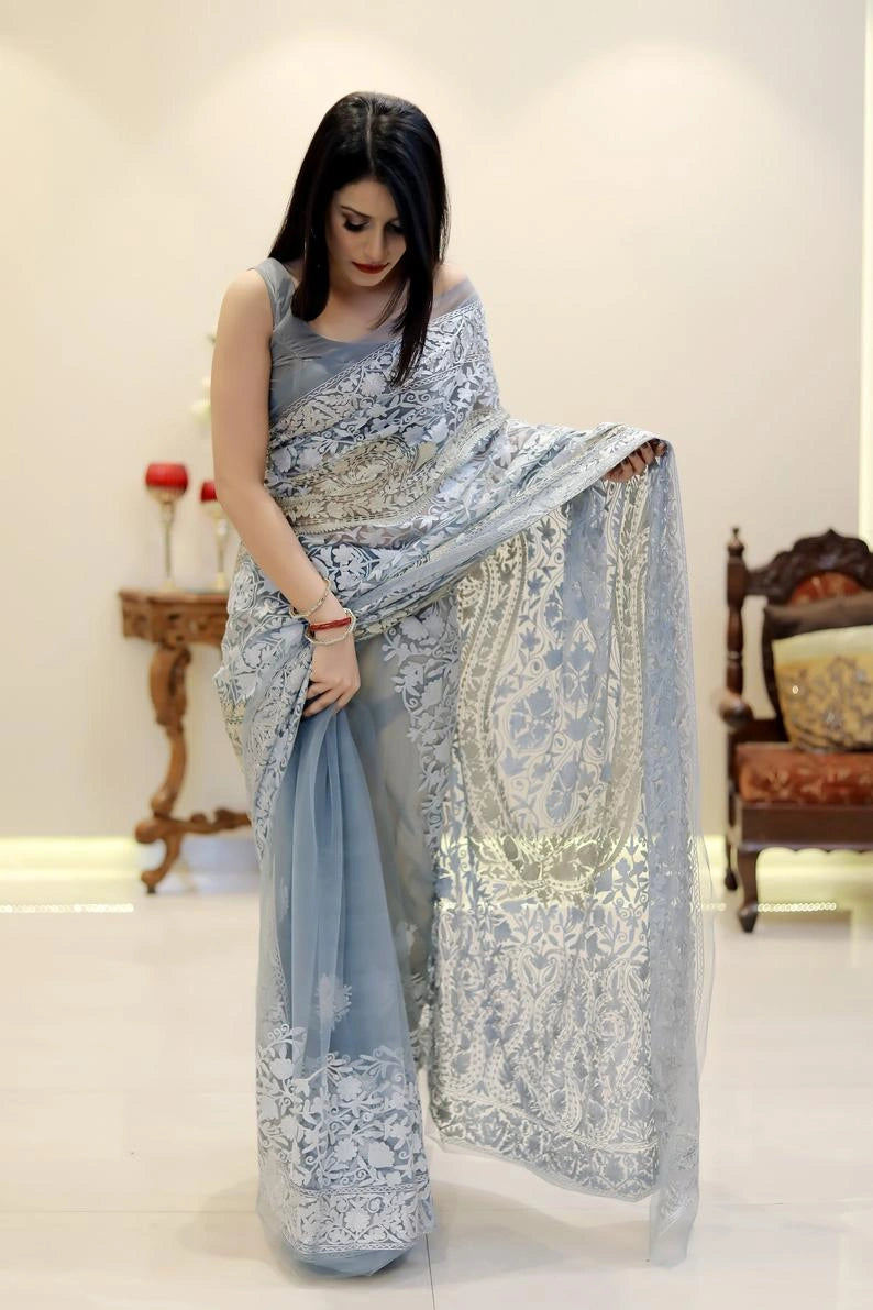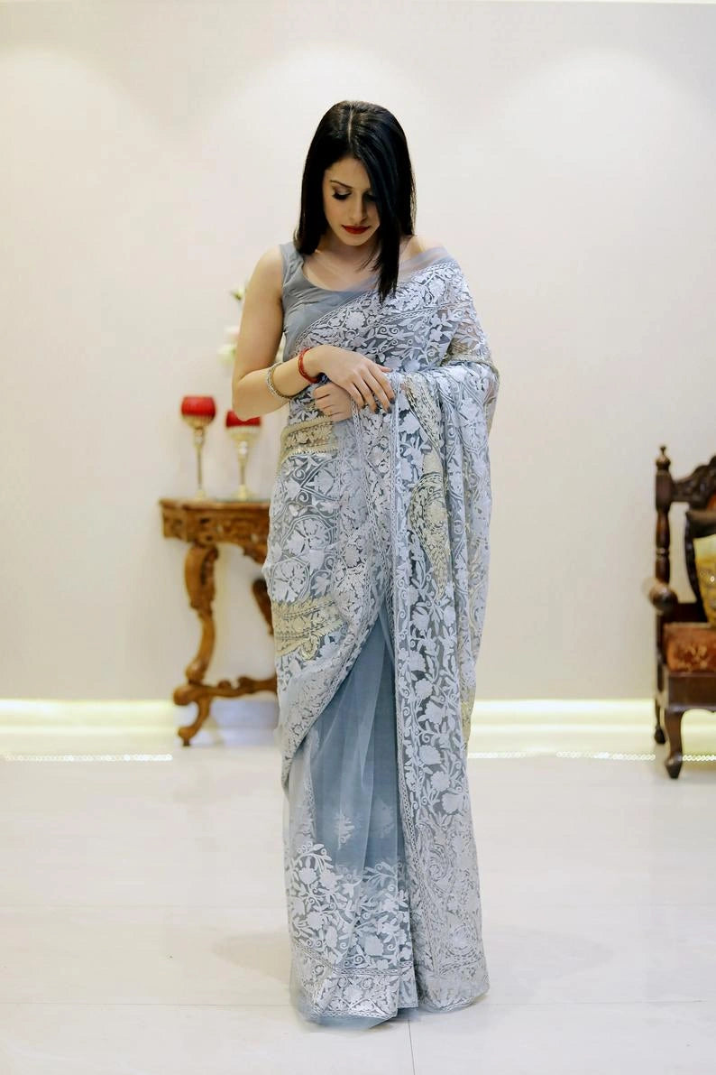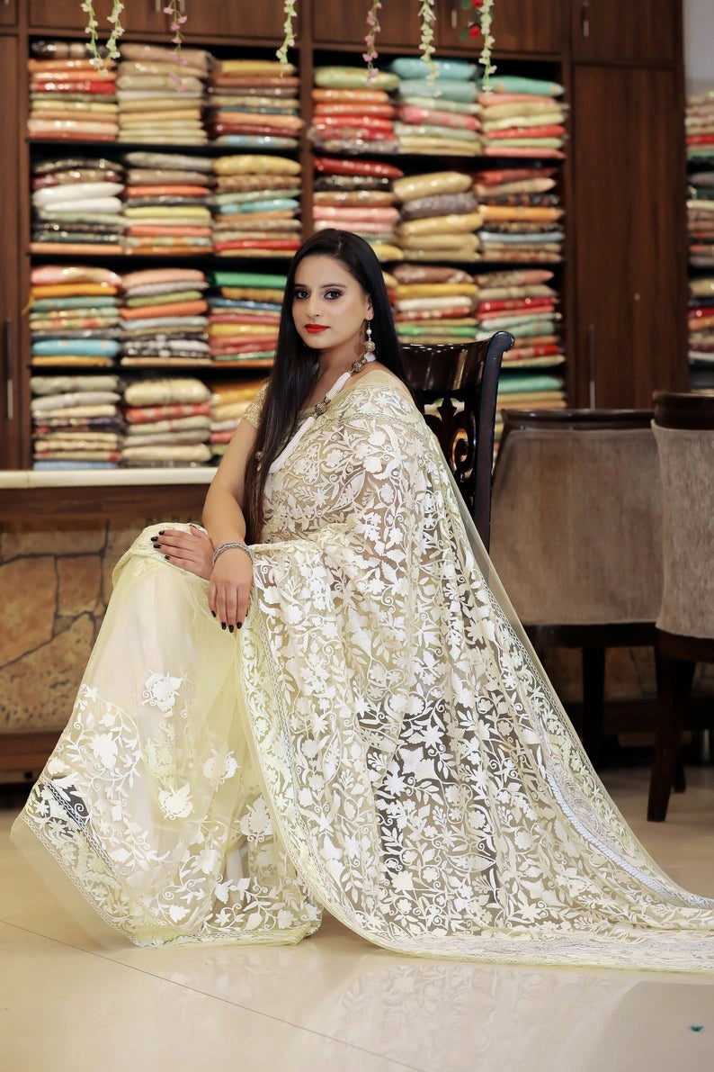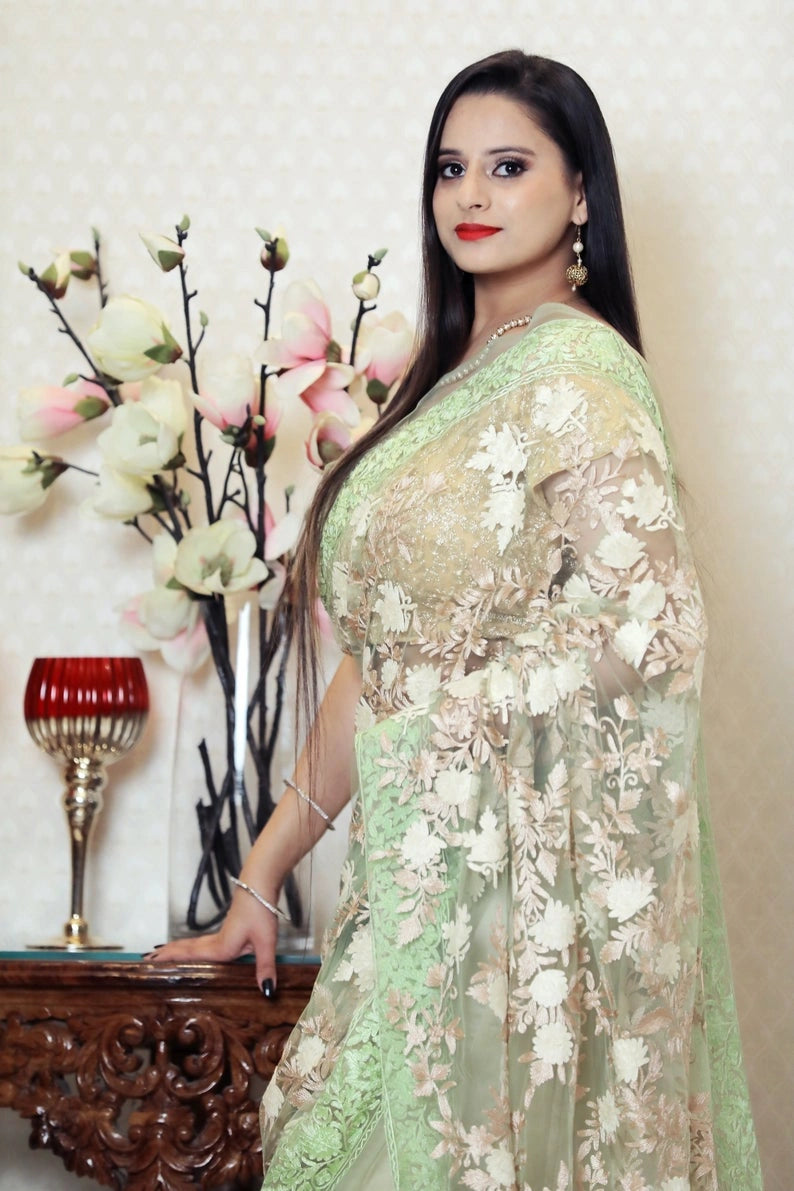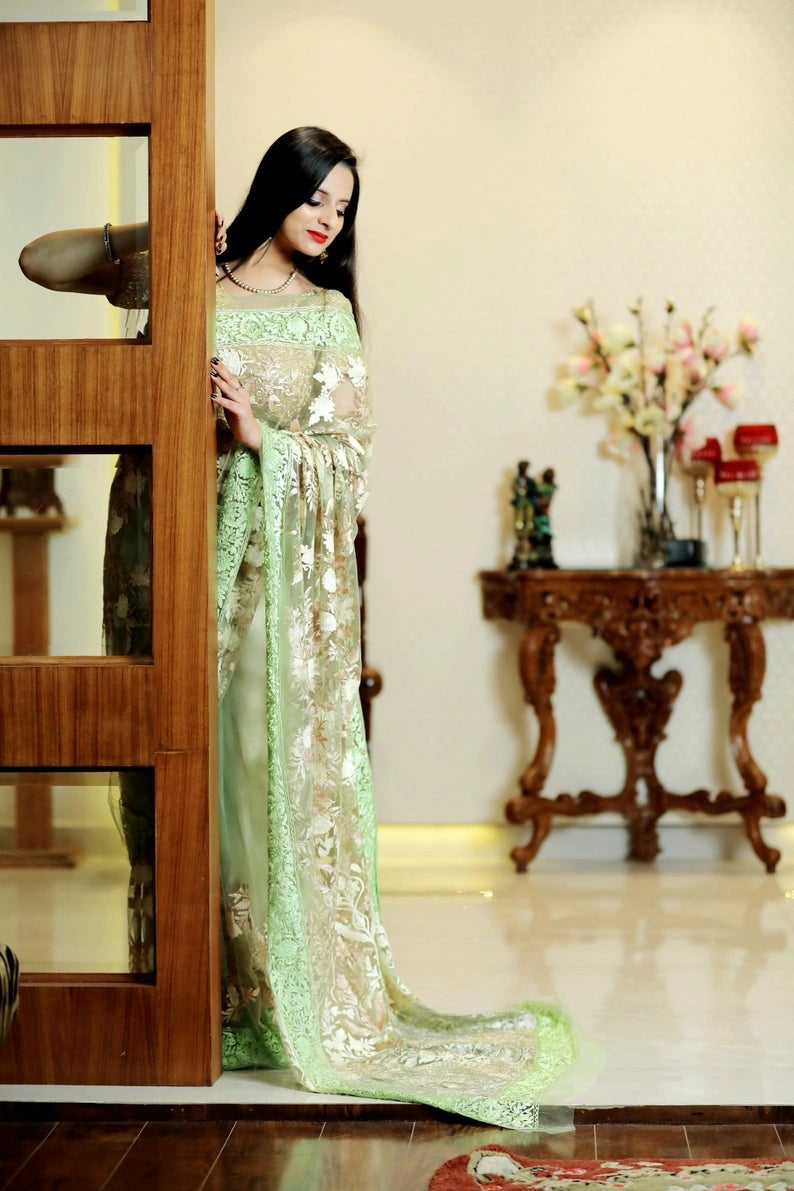 Wearing Noor-e-Waris feels like stepping into a world where elegance becomes lineage—empowering you with the soft radiance of heritage and the quiet confidence of artisanal luxury. The airy net drape flows with feather-light grace, while detailed Aari and Tilla fusion embroidery—crafted on traditional manual machines—glimmers in white, gold, and pastel hues. Created with comfort, craftsmanship, and timeless appeal in mind, this saree transitions effortlessly from intimate rituals to grand celebrations. Essential features include pastel multi-colour and gold-toned embroidery, a choice of fawn/grey/green/light yellow base, and a matching net blouse.