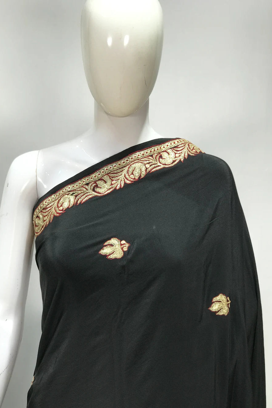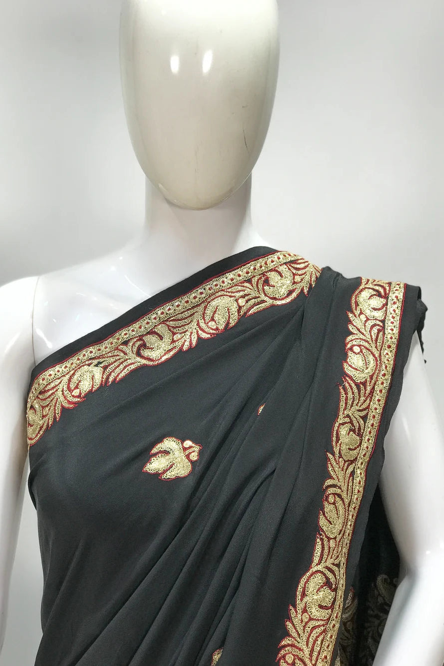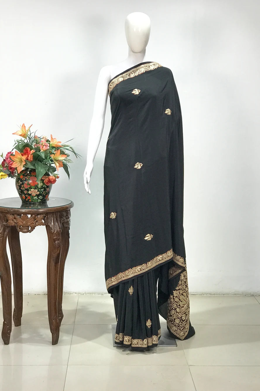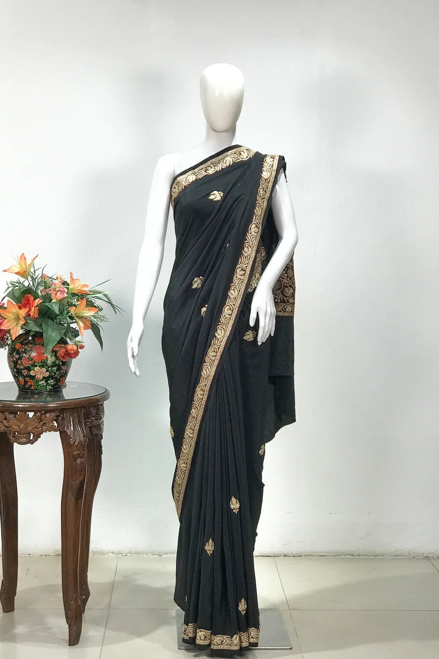 Wearing Noor-e-Zewar feels like stepping into a lineage of queens — elegant, empowered, and deeply connected to heritage. Every drape of this black Indian Crepe saree carries the quiet luxury of Kashmiri Tilla embroidery, where gold and red threads catch the light like heirloom jewellery. Designed for comfort and grace, it flows effortlessly from intimate family occasions to grand celebrations, promising timeless beauty beyond trends. Crafted by skilled artisans, it blends softness, durability, and versatile styling — finished with delicate motifs and a gilded border that exudes sophistication. Features include: Indian Crepe saree & blouse fabric, Kashmiri Tilla embroidery with thread outline, black base with gold & red detailing, artisan-crafted embroidery.