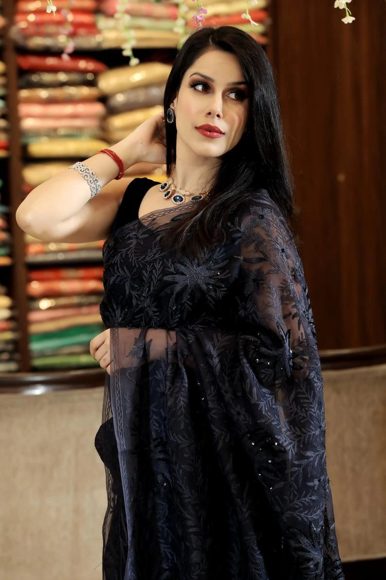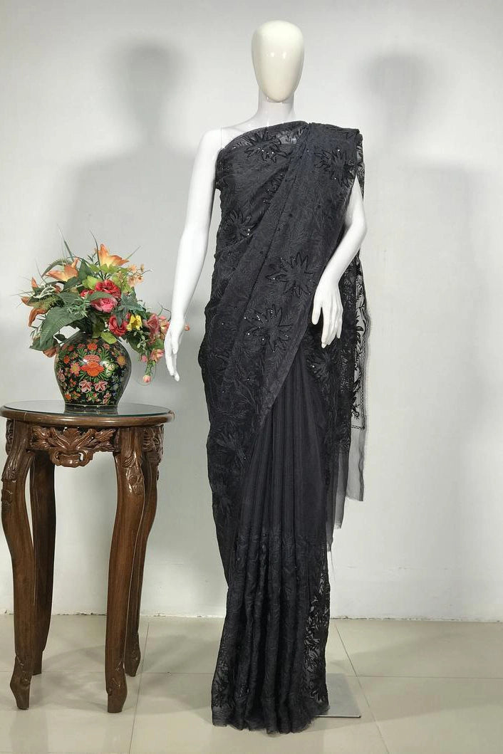 Pair with statement sapphire or charcoal-toned jewellery to enhance the saree’s deep, moody palette. Opt for soft waves or a sleek side-parted hairstyle for modern glamour.