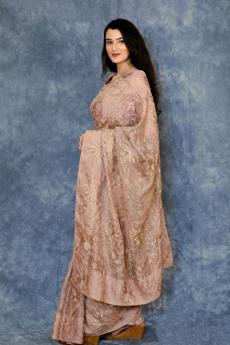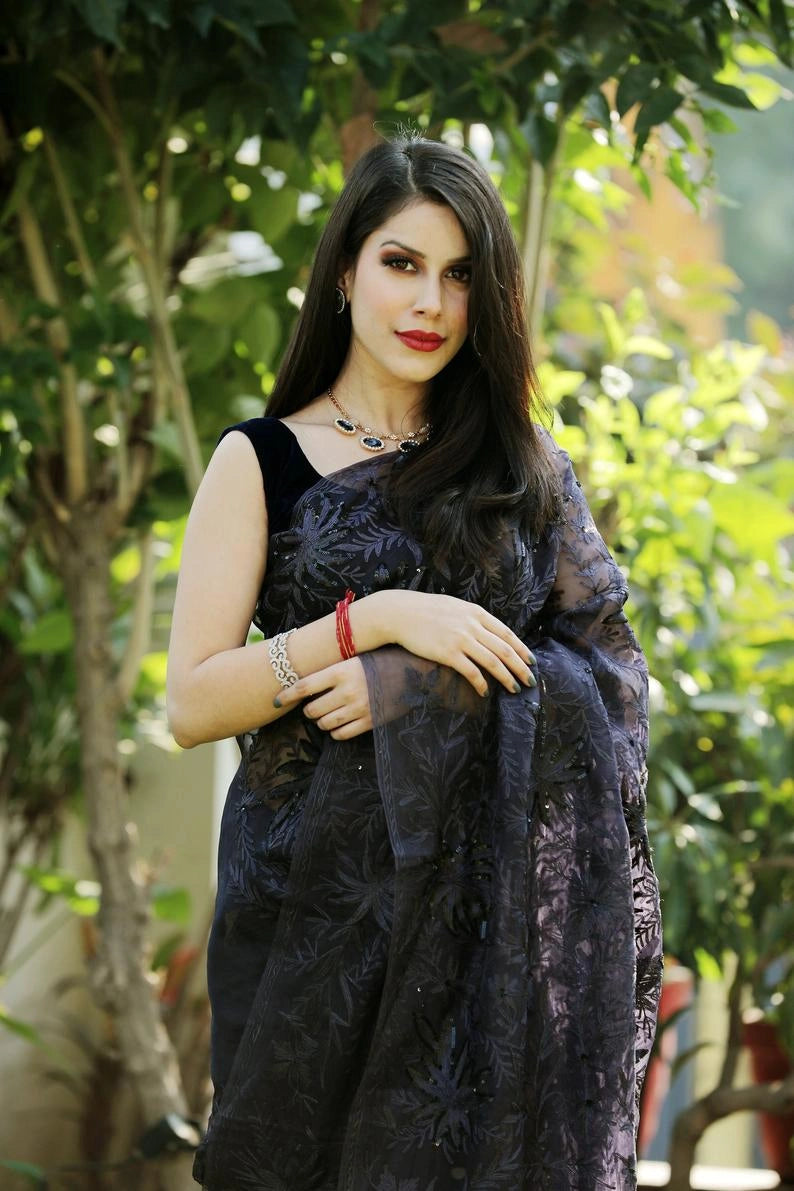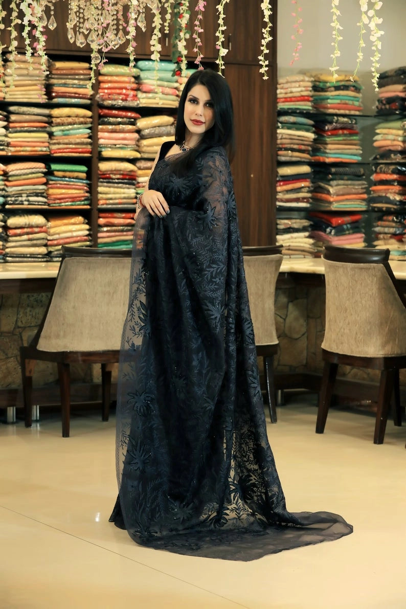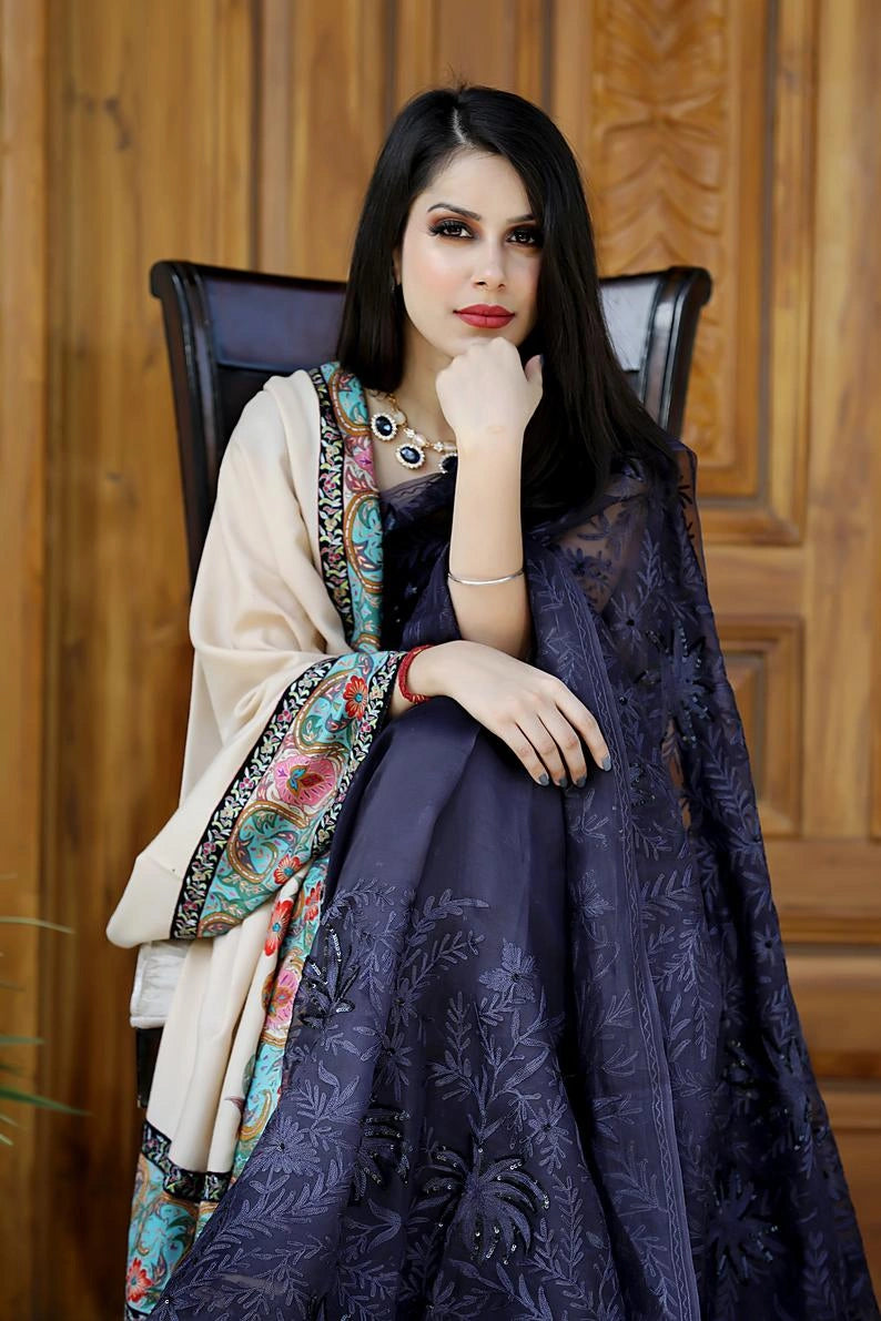 Wearing Shab-e-Feroza feels like stepping into moonlit grace — elegant, empowered, and connected to the soulful artistry of Kashmir. The sheer Organza drape moves like a whisper, while tonal Aari embroidery enriched with hand-sequins creates a soft shimmer that catches the light with every step. Lightweight yet luxurious, this saree embodies timeless appeal, making it perfect for evening celebrations, formal events, or intimate gatherings. Essential features include self-toned Kashmiri Aari work, delicate hand-sequin highlighting, a charcoal base rendered in Organza, and a coordinating Indian Crepe blouse.