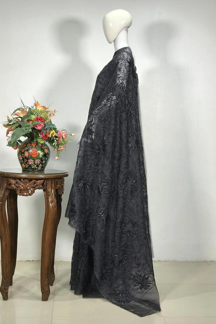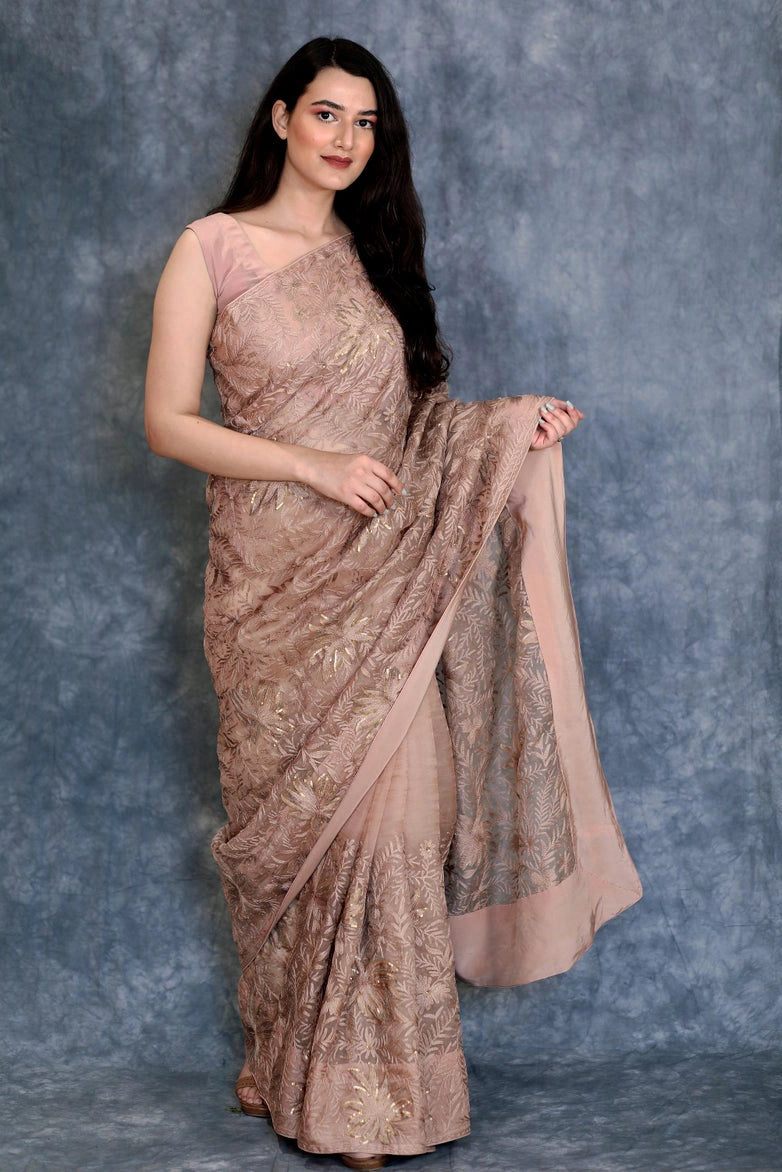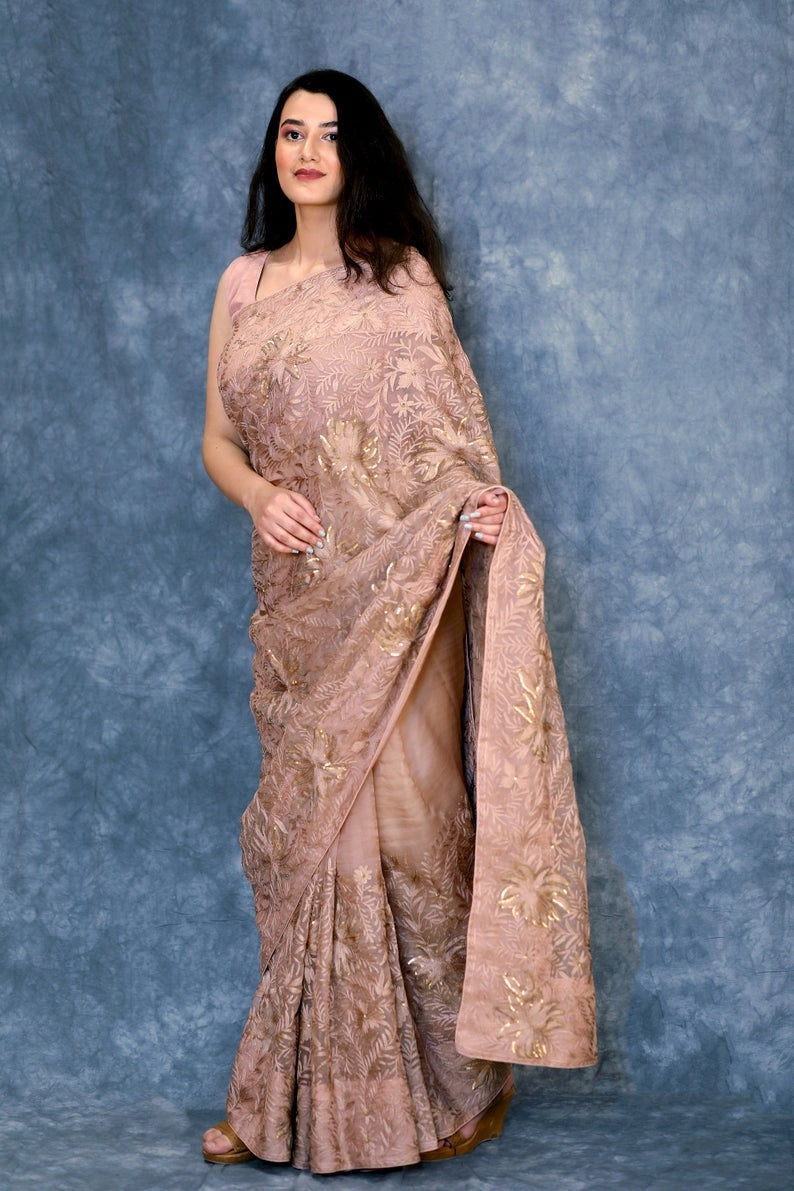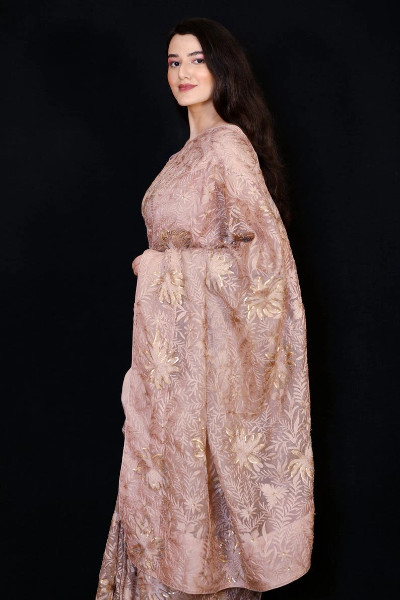 Wearing Shab-e-Feroza feels like stepping into moonlit grace — elegant, empowered, and connected to the soulful artistry of Kashmir. The sheer Organza drape moves like a whisper, while tonal Aari embroidery enriched with hand-sequins creates a soft shimmer that catches the light with every step. Lightweight yet luxurious, this saree embodies timeless appeal, making it perfect for evening celebrations, formal events, or intimate gatherings. Essential features include self-toned Kashmiri Aari work, delicate hand-sequin highlighting, a charcoal base rendered in Organza, and a coordinating Indian Crepe blouse.