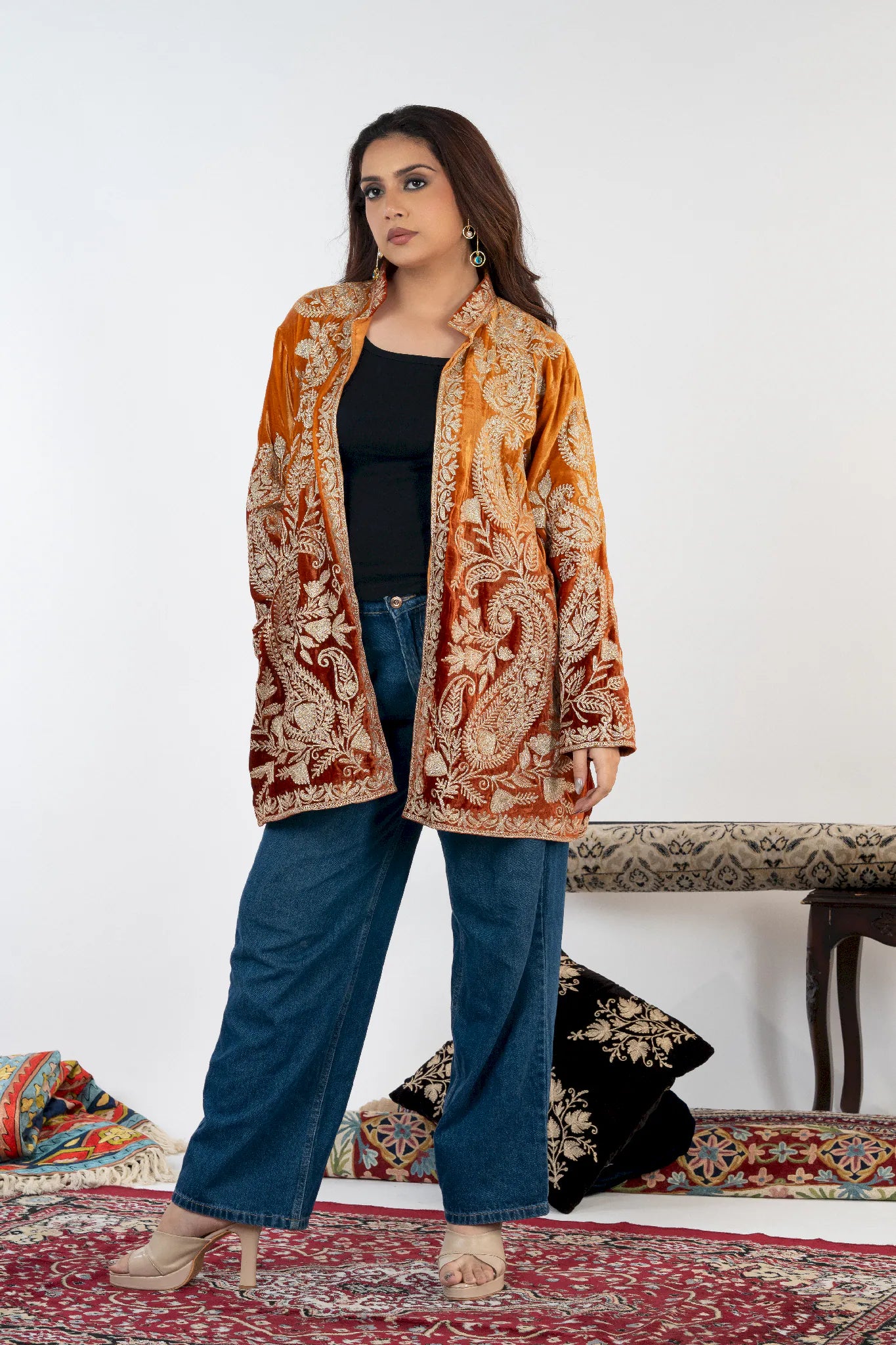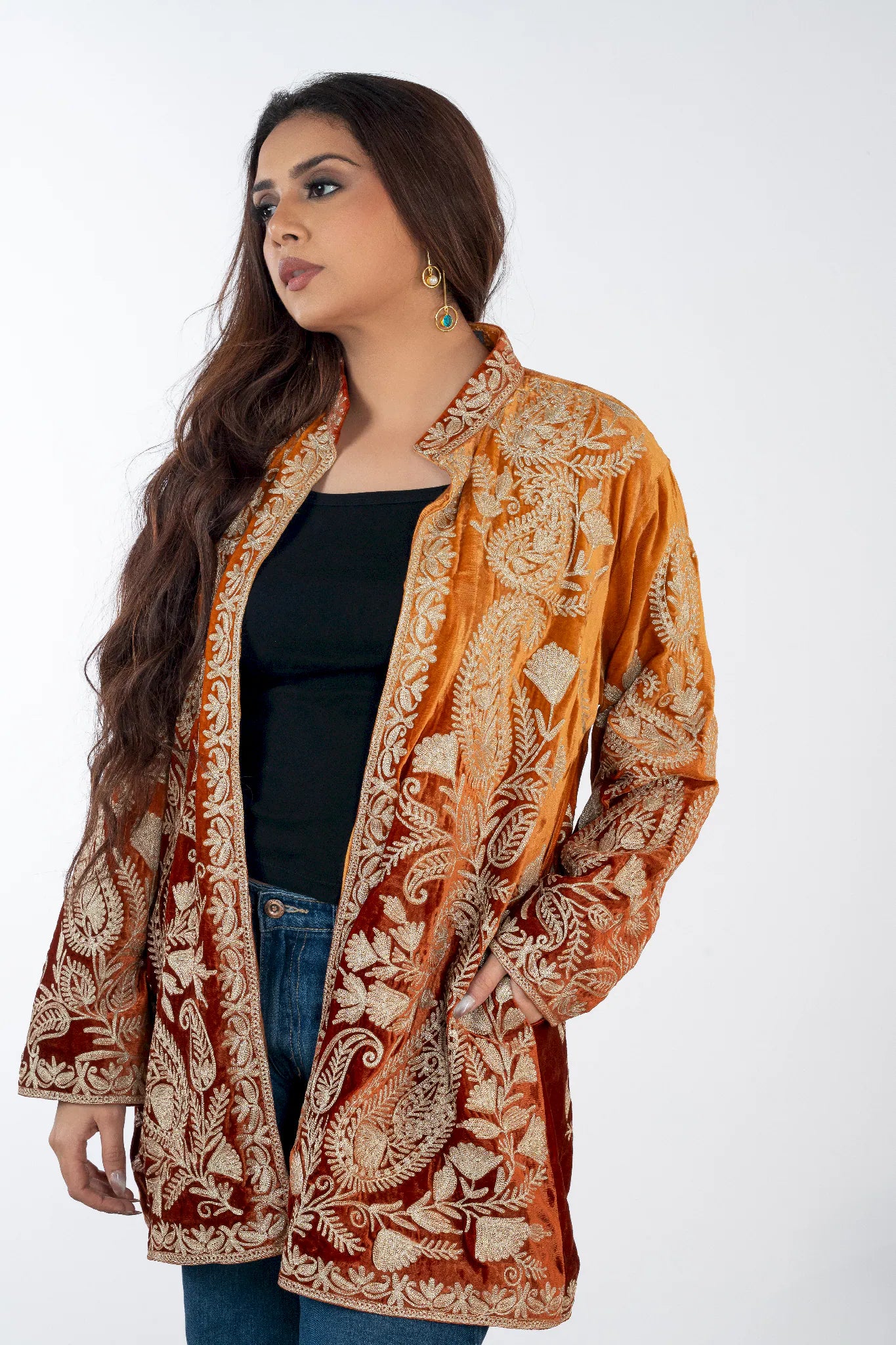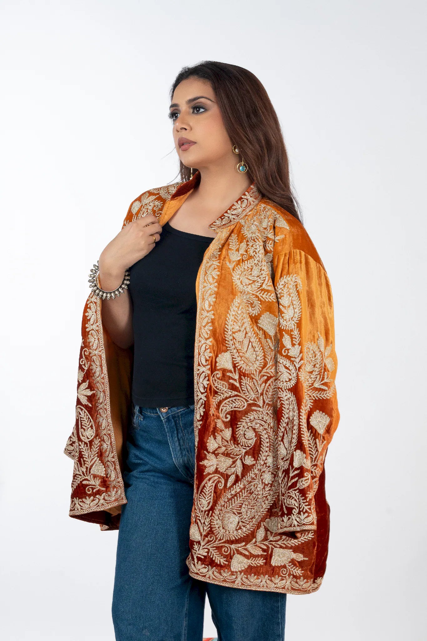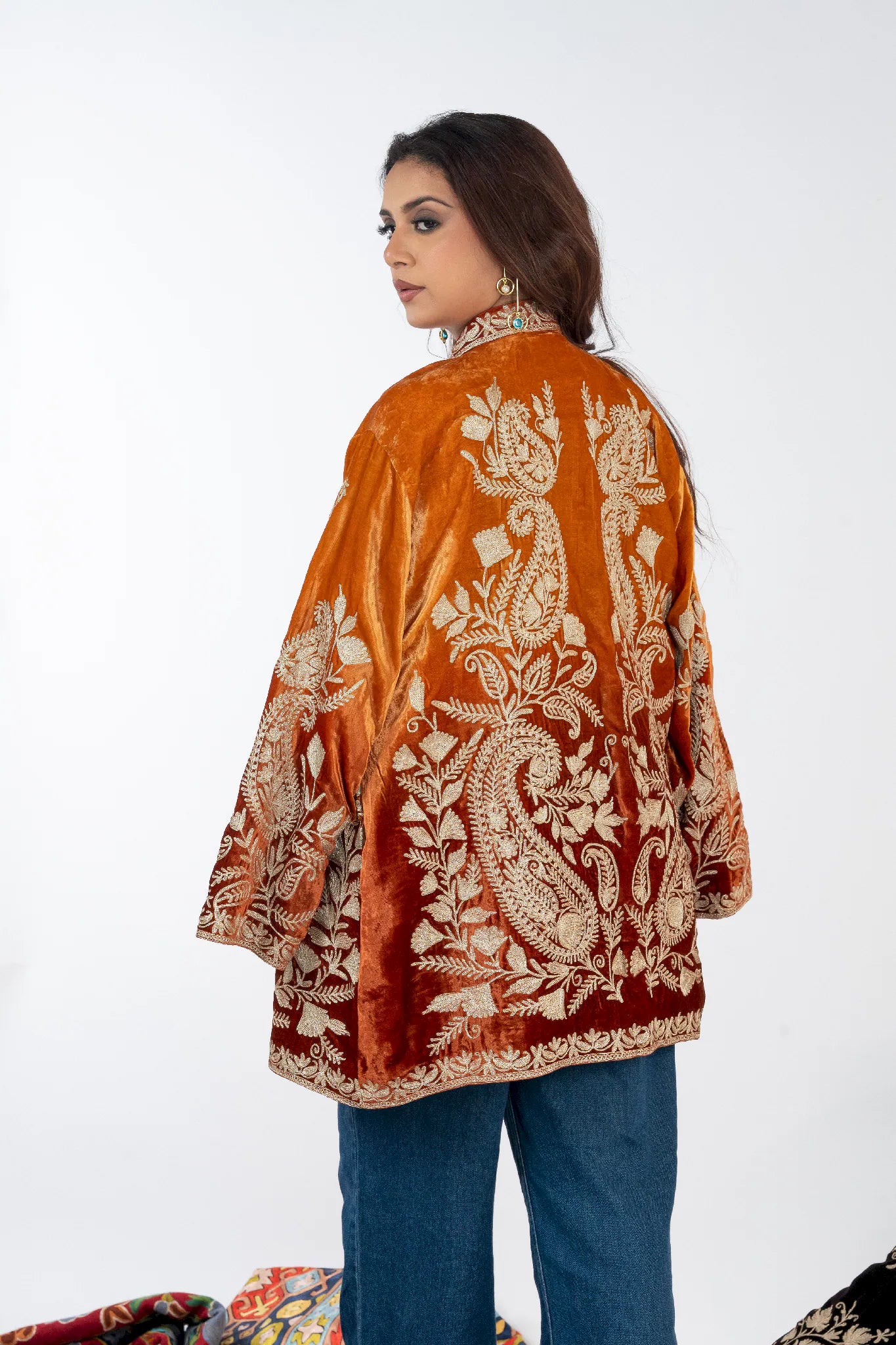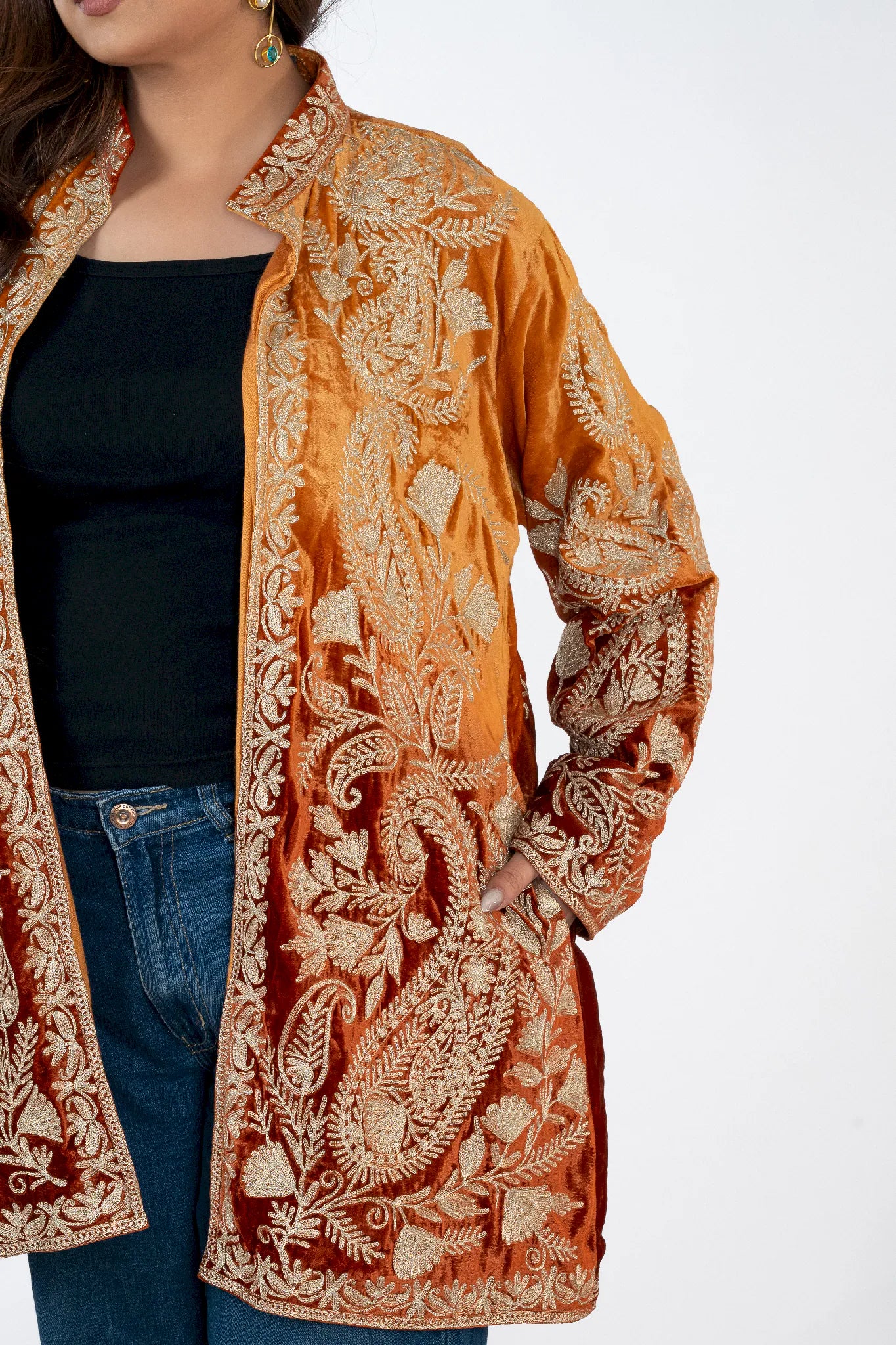 Wearing Sohbat feels like stepping into quiet confidence, where elegance meets cultural depth. Designed to make you feel grounded, refined, and effortlessly expressive, this shrug connects modern dressing with the warmth of Kashmiri heritage. Crafted in plush silk velvet, it offers a luxurious drape and all-day comfort while remaining versatile across festive and contemporary settings. The custom Tilla embroidery in dull gold unfolds across a rich rust base, creating a timeless statement rooted in craftsmanship rather than trend. Sohbat is a heritage piece meant to be worn often and cherished long.