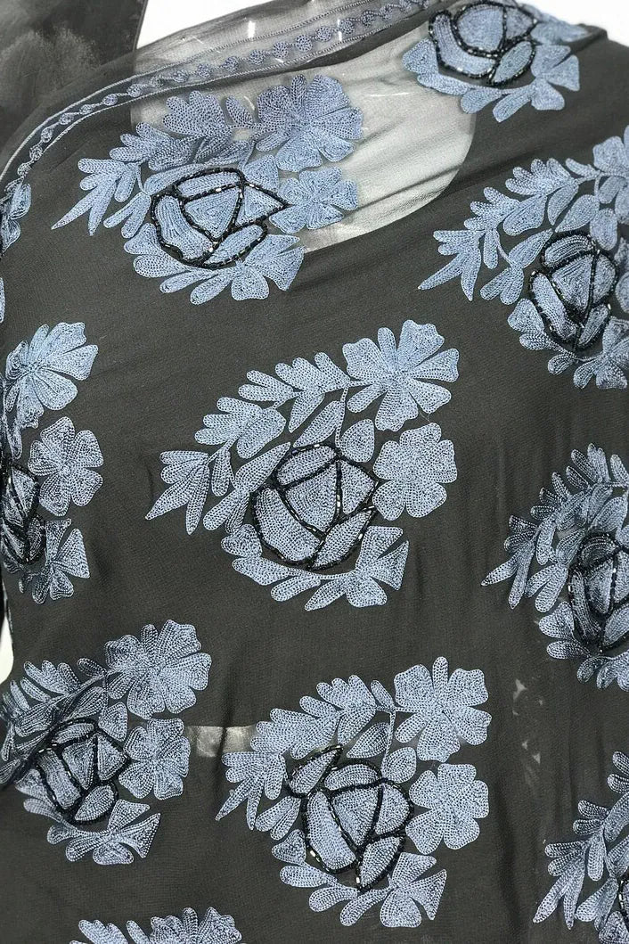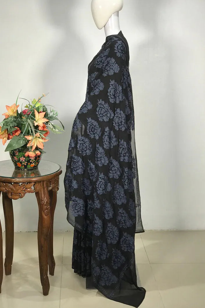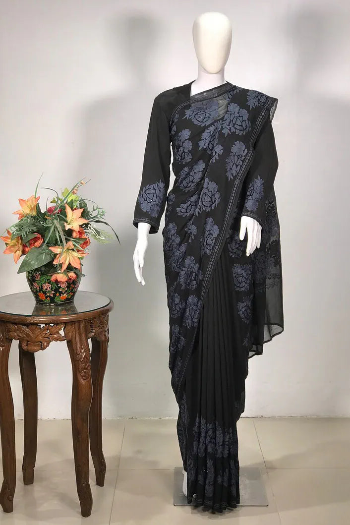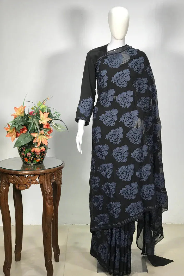 Wrapped in this ethereal black saree, you feel enveloped in elegance—confident, timeless, and deeply connected to Kashmir’s living craft tradition. The soft Viscose Georgette flows effortlessly, offering comfort with every movement, while the intricate Aari and Hand Kar Daana embroidery in ash grey creates a sculpted, textured artistry that elevates even the simplest of moments. Versatile for evening gatherings, festive occasions, and heirloom wear, this saree blends refinement and heritage with a modern silhouette.