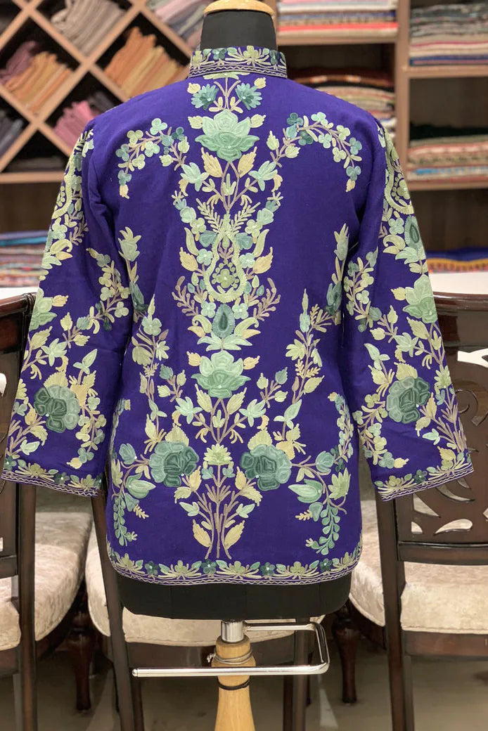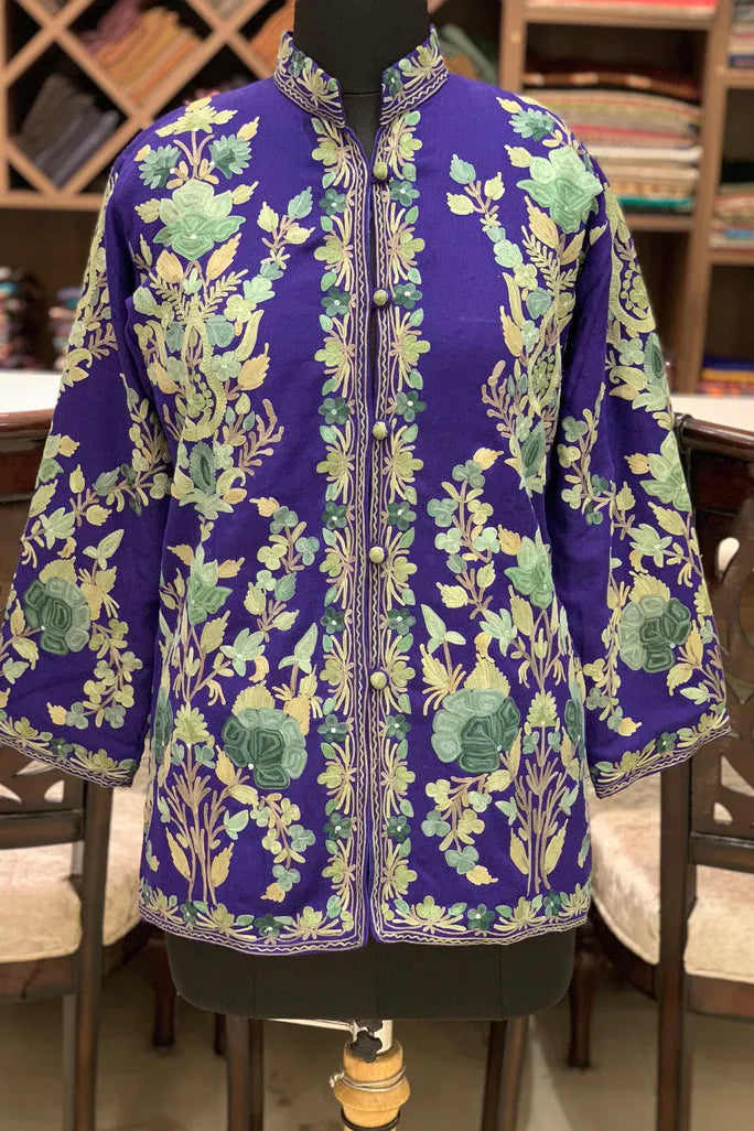 The purple surface settles first, deep and luminous, carrying the warmth of evening light held indoors. Embroidery spreads generously across it, florals blooming in layered rhythm, reds and golds resting confidently against the darker ground. The coat feels expressive without noise, festive without urgency, as though it belongs to a moment that unfolds slowly.