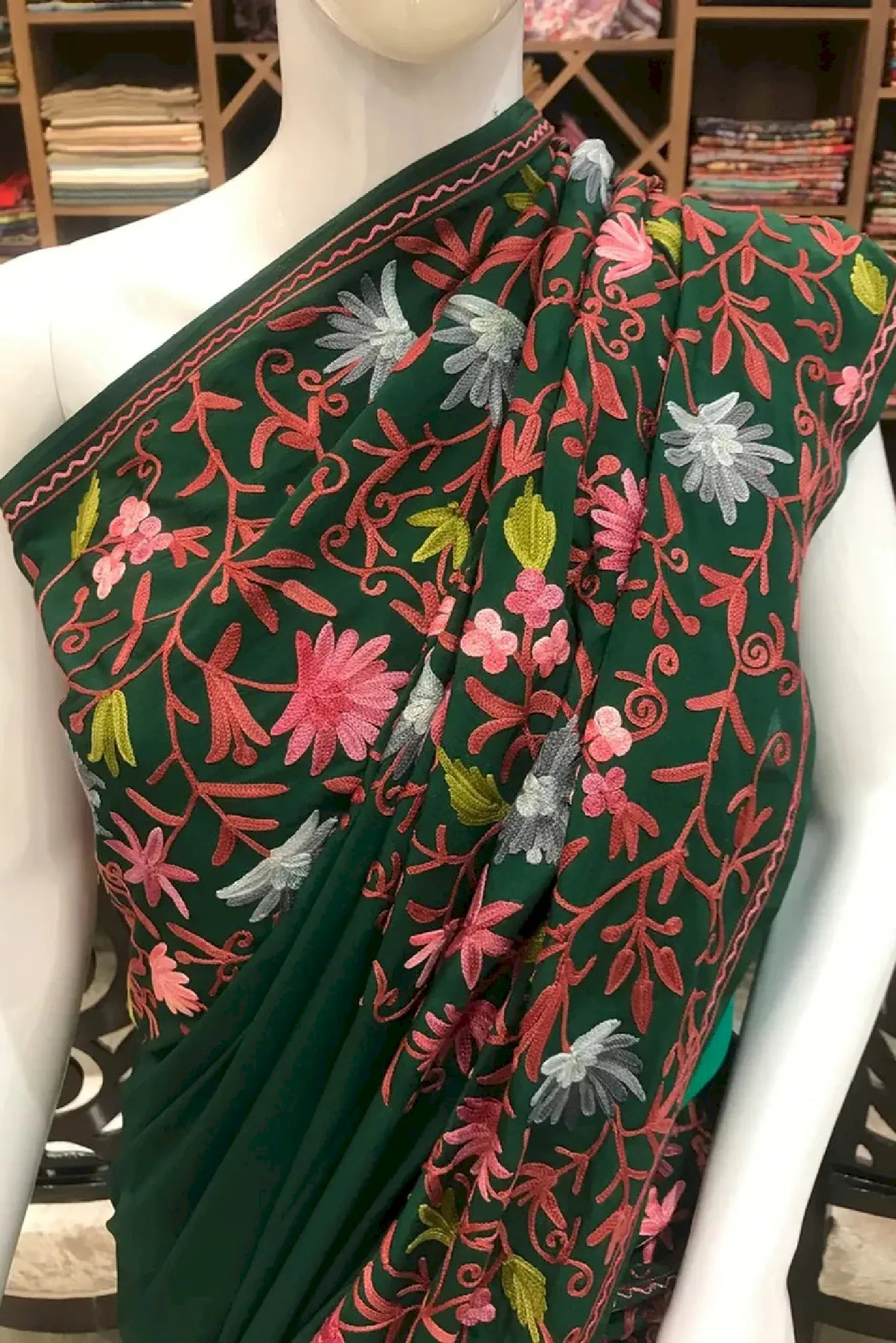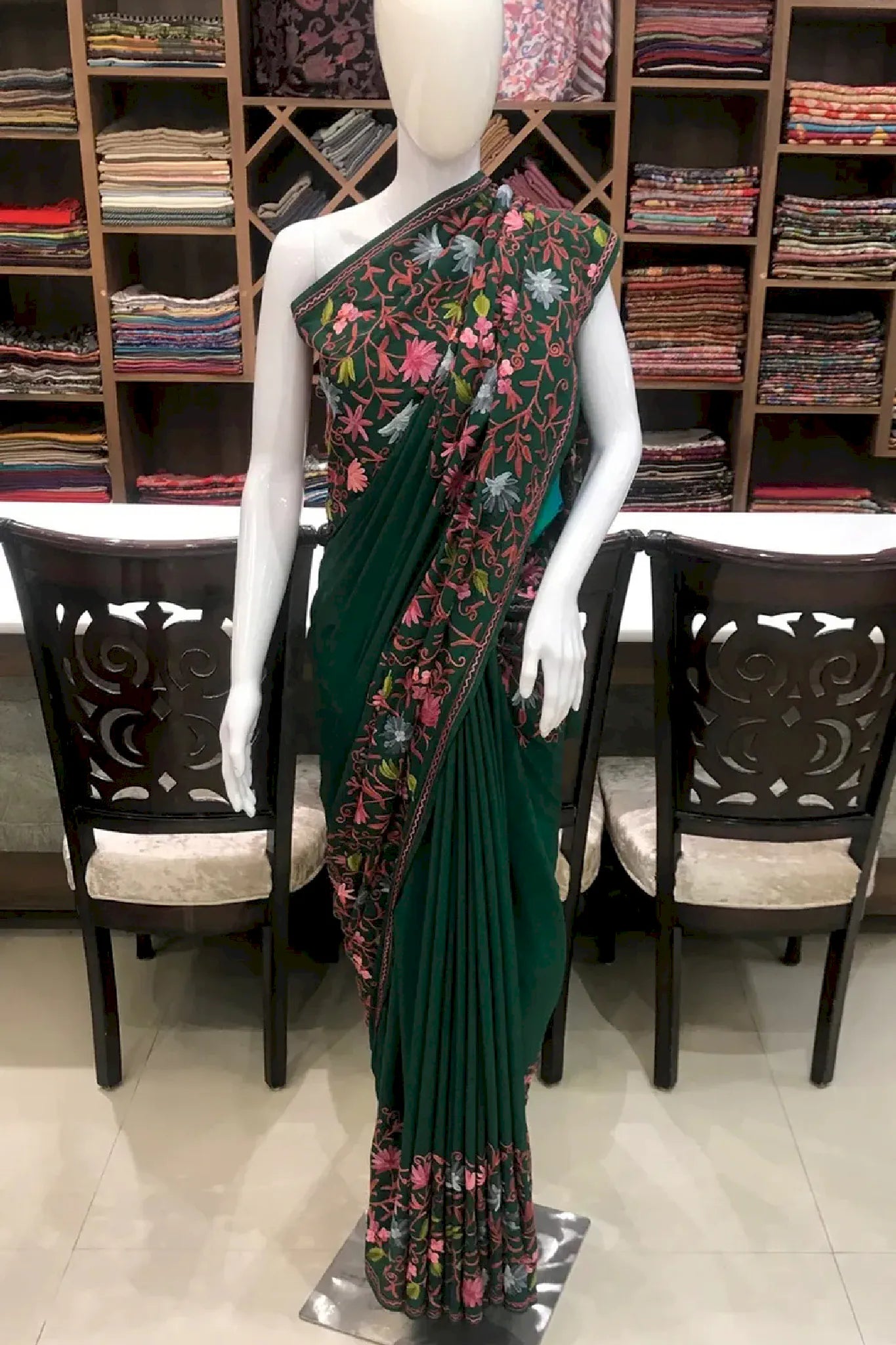 Arna drapes you in quiet confidence, allowing you to move with natural grace rooted in Kashmiri heritage. Crafted in soft semi crepe, the saree flows effortlessly, offering lasting comfort while maintaining a refined silhouette. The Kashmiri aari floral embroidery blooms across a rich green base, reflecting artisanal skill and patience. Balanced and versatile, Arna transitions seamlessly from daytime rituals to evening gatherings, pairing cultural depth with contemporary ease. Finished with a matching semi crepe blouse, it is a timeless expression of living tradition.