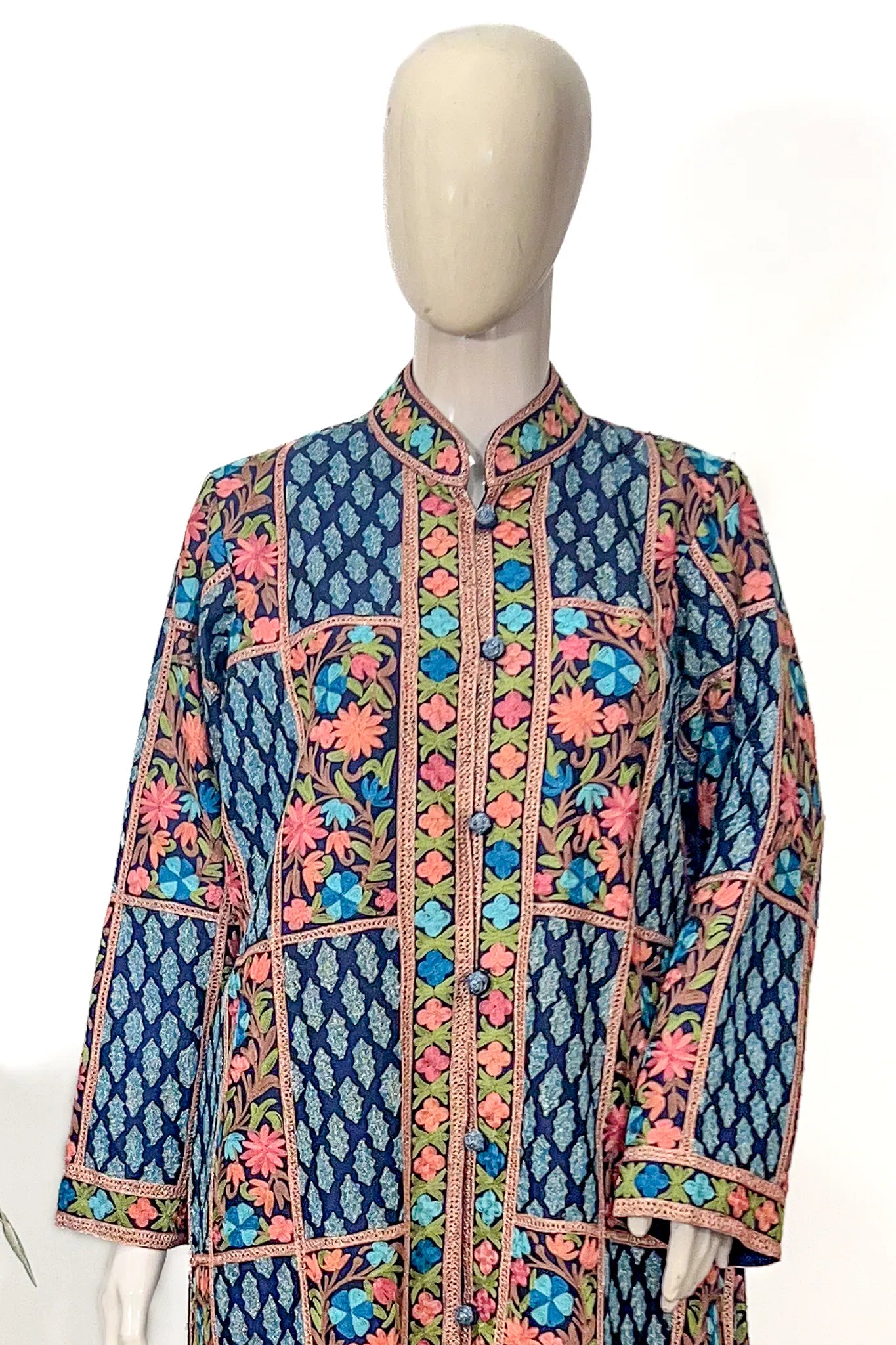 Worn, it feels protective in the most familiar way. The embroidery rests evenly along the body, guiding the eye without ever overwhelming it. There is comfort in its length, in the way the lining adds weight without heaviness, in the gentle reassurance of pockets where hands naturally return. It feels like something chosen for long afternoons that drift into evening, where celebration is unspoken and presence is enough.