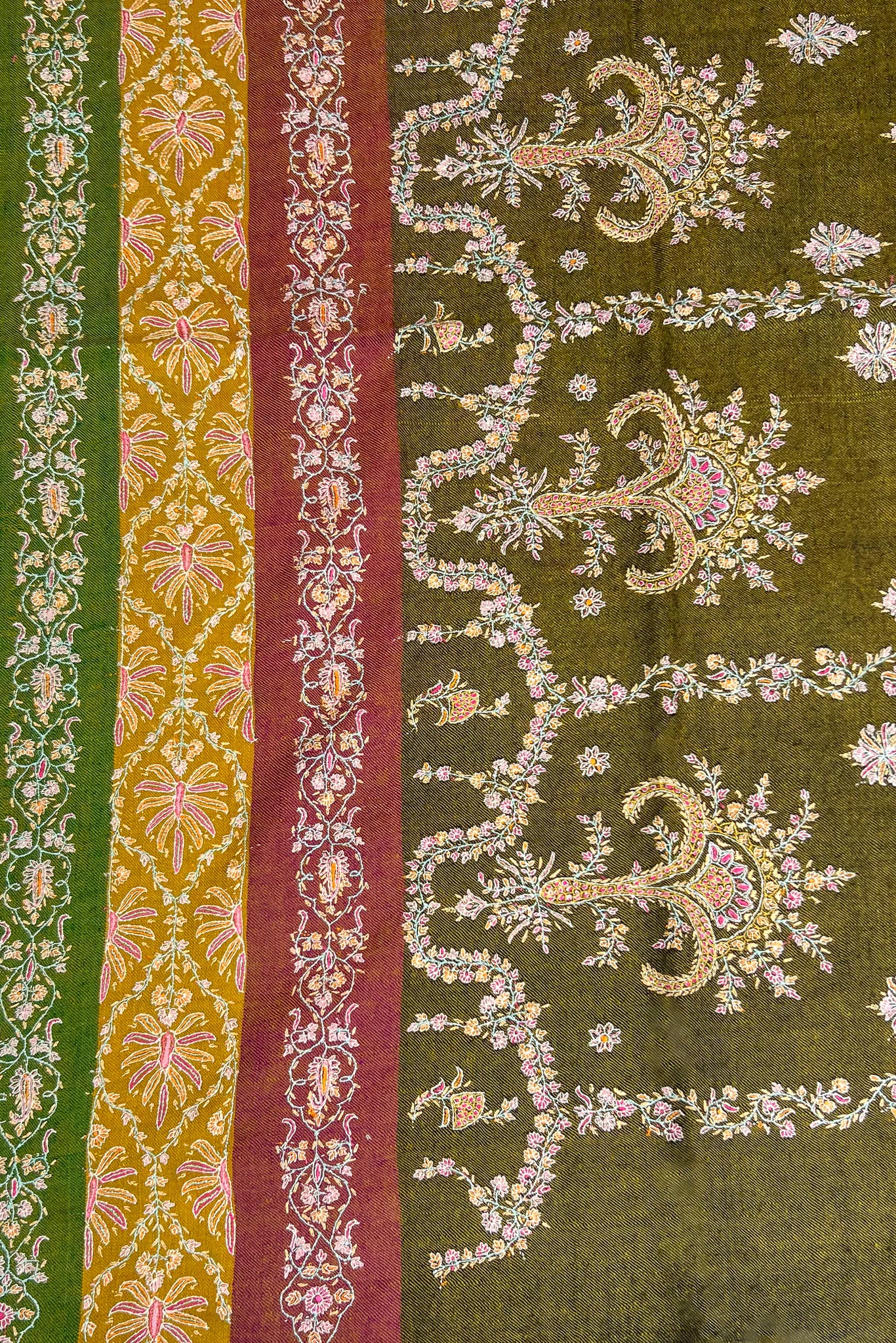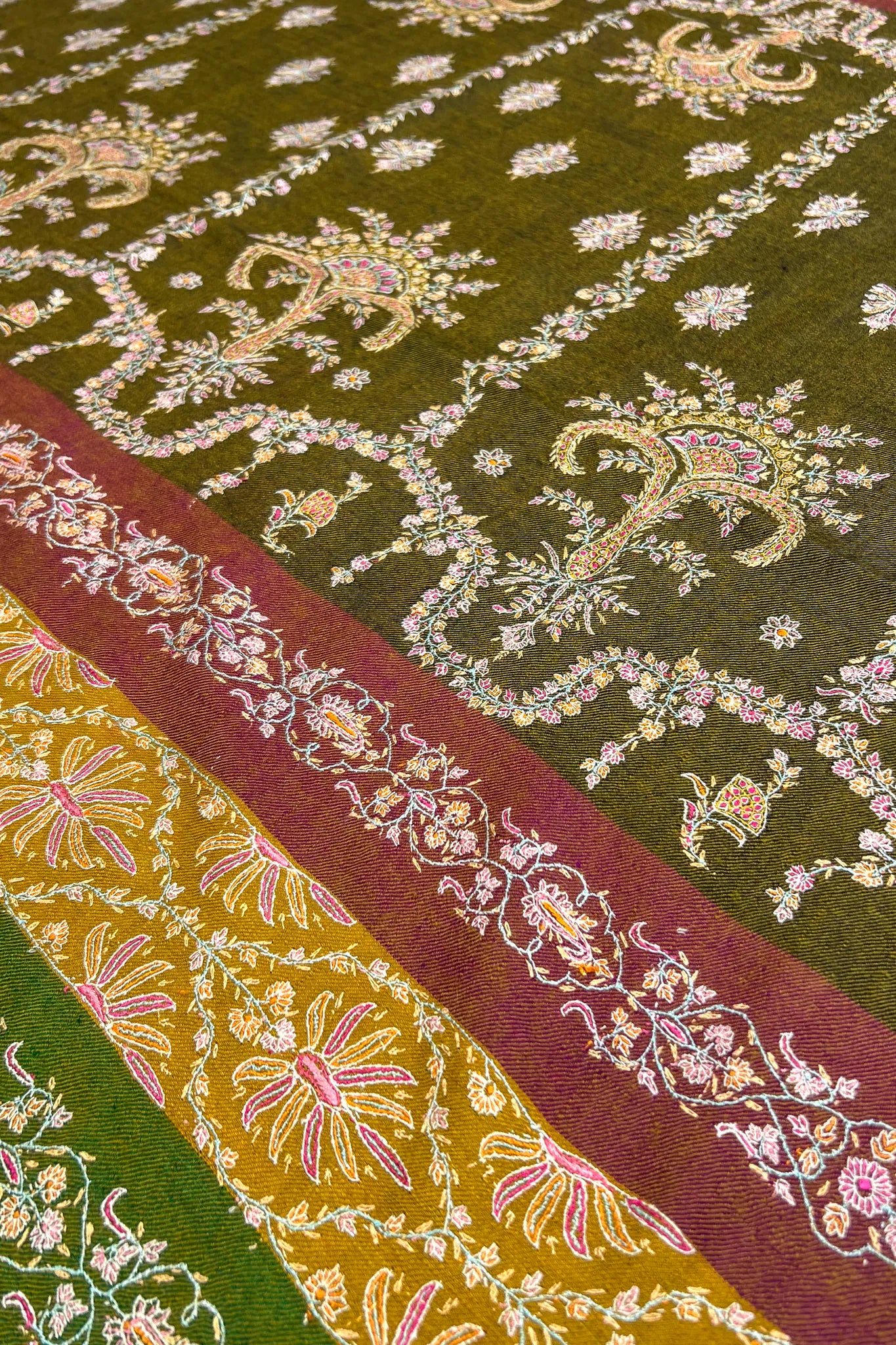 The first feeling is depth. An olive green base that feels settled and calm, carrying the warmth of late afternoon light. Across it, florals appear gently, not crowded, not sparse, as if they have grown at their own pace. Soft rose, muted saffron, and pale ivory move through the surface with a quiet rhythm, creating a sense of continuity rather than contrast.