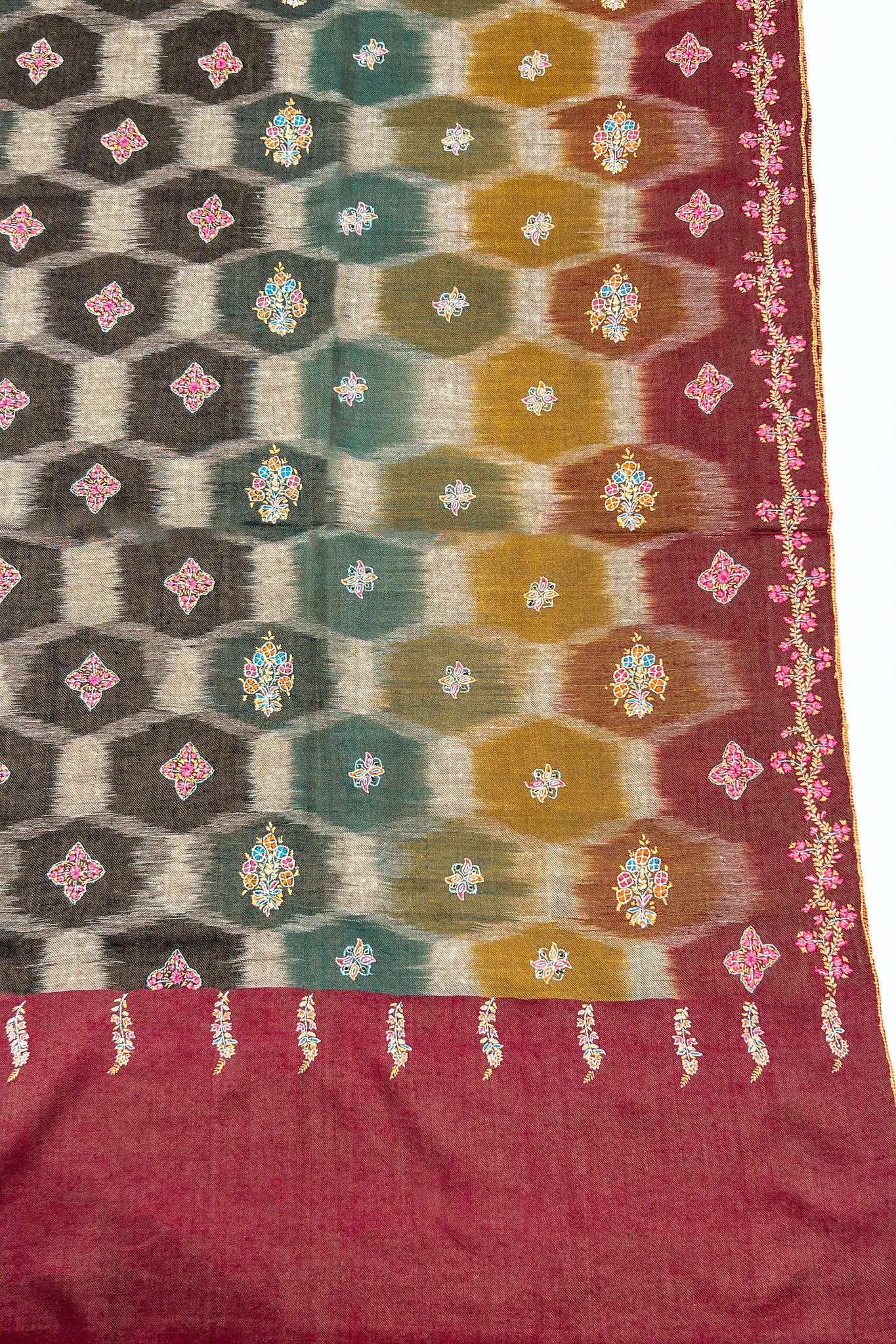 The first thing you notice is the depth of colour—rich, slow-moving, as though it has soaked into the fabric over time. Deep wine settles into mossy green, soft ochre, and muted charcoal, each shade blurring gently into the next. When your hands move across it, the shawl feels warm without weight, familiar in a way that suggests it has already belonged to you.