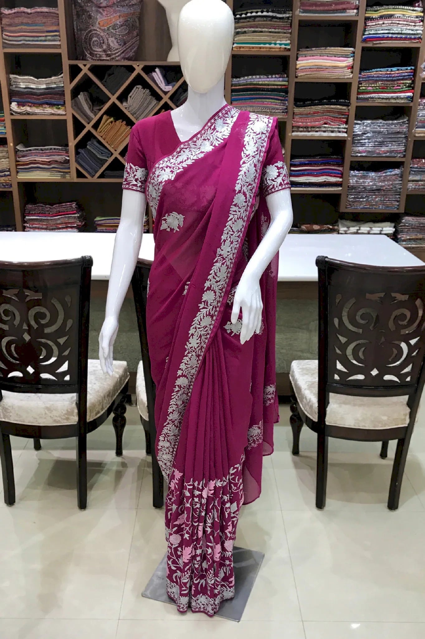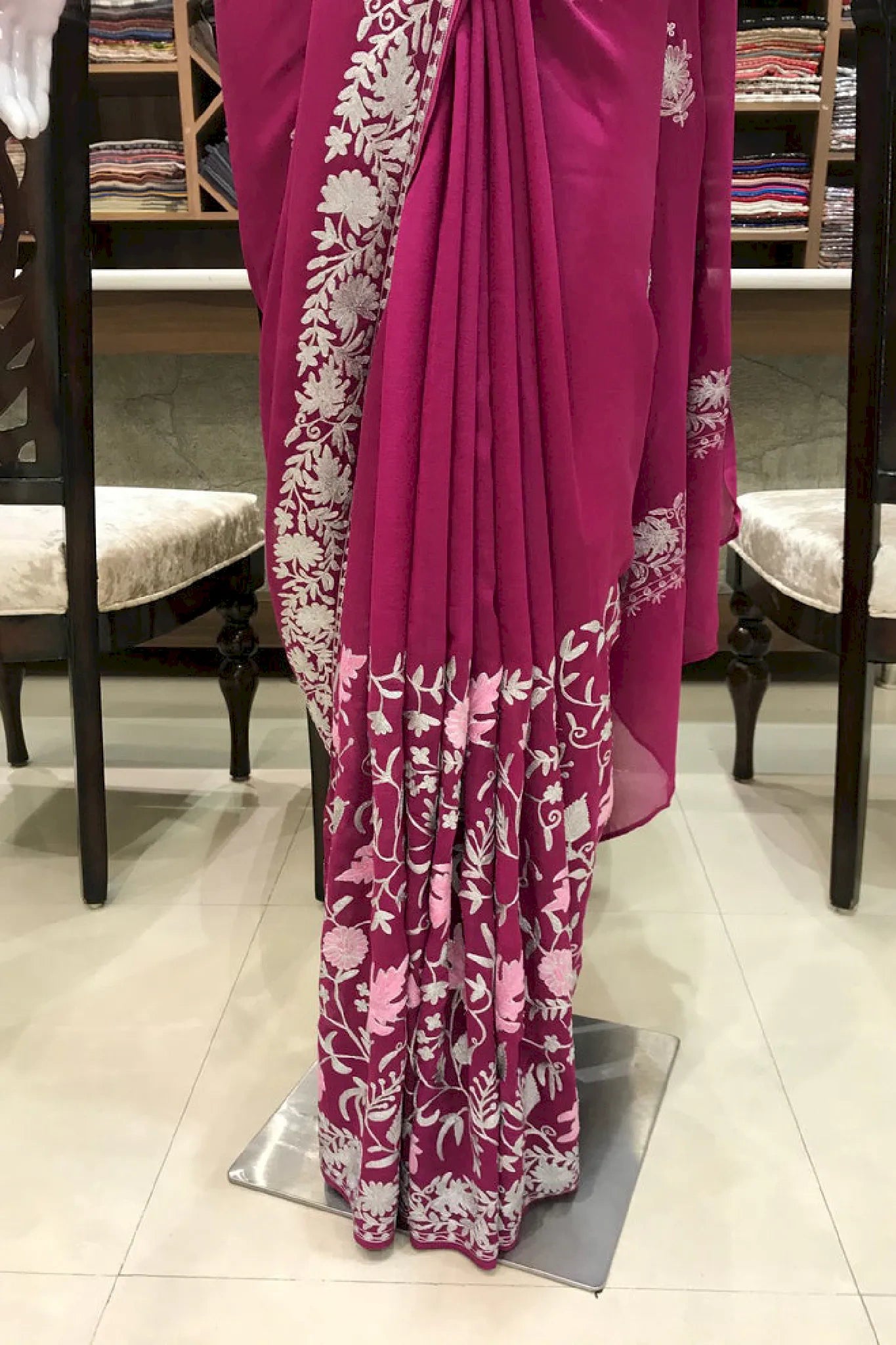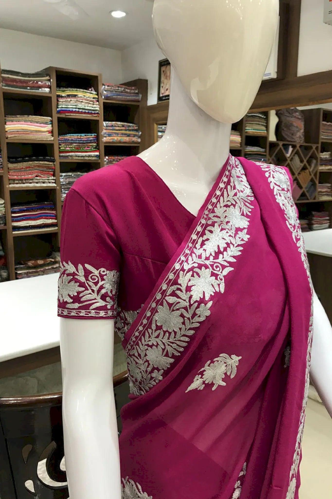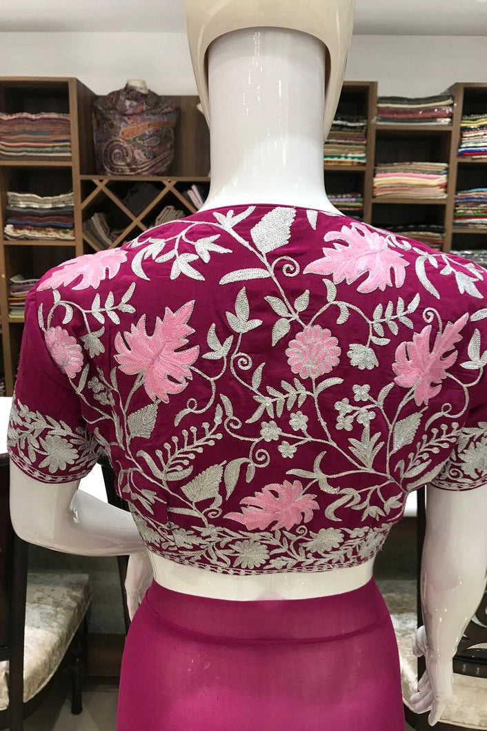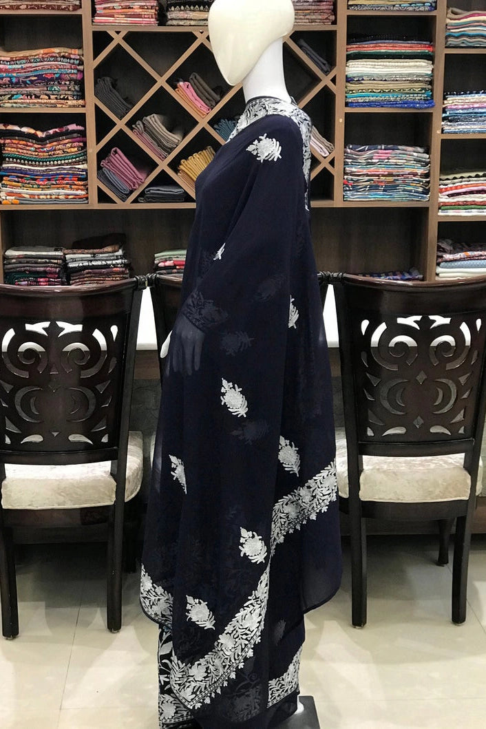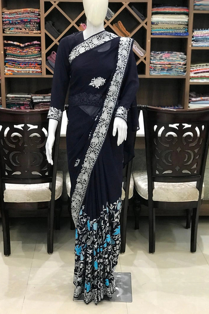 Aarya carries a sense of noble calm, crafted for women who appreciate quiet elegance and cultural depth. Kashmiri aari and tilla fusion embroidery highlights a soft pink or navy base, created with balance and refined detailing. The viscose georgette fabric offers a graceful drape that feels light yet polished. Ideal for festive and formal occasions, Aarya blends traditional craftsmanship with contemporary styling. Finished with an Indian crepe blouse, it is designed to be cherished across seasons.