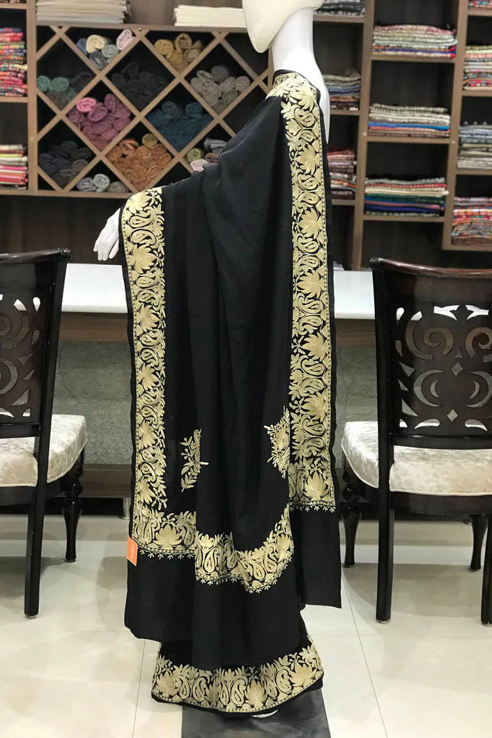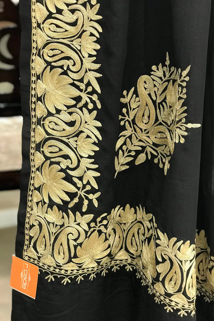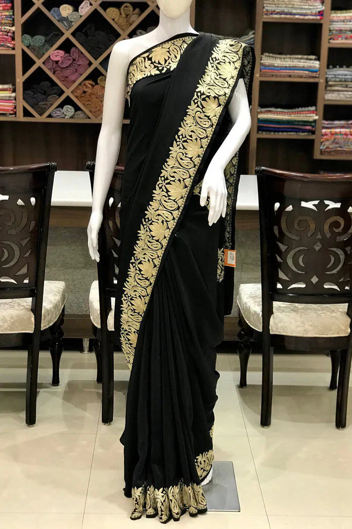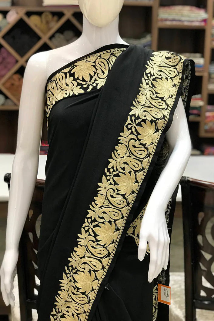 Slip into Zebunisa Noir and feel instantly elevated—elegant, empowered, and deeply connected to the timeless artistry of Kashmir. Crafted in fluid Pure Crepe, the saree drapes with effortless sophistication, while the dull-gold Kashmiri Zari embroidery adds a striking yet refined glow. Its comfort, versatility, and heirloom-worthy detailing make it perfect for weddings, soirées, and intimate celebrations. Essential features include gold Zari embroidery, a rich black/maroon base, and a matching Pure Crepe blouse fabric.